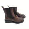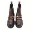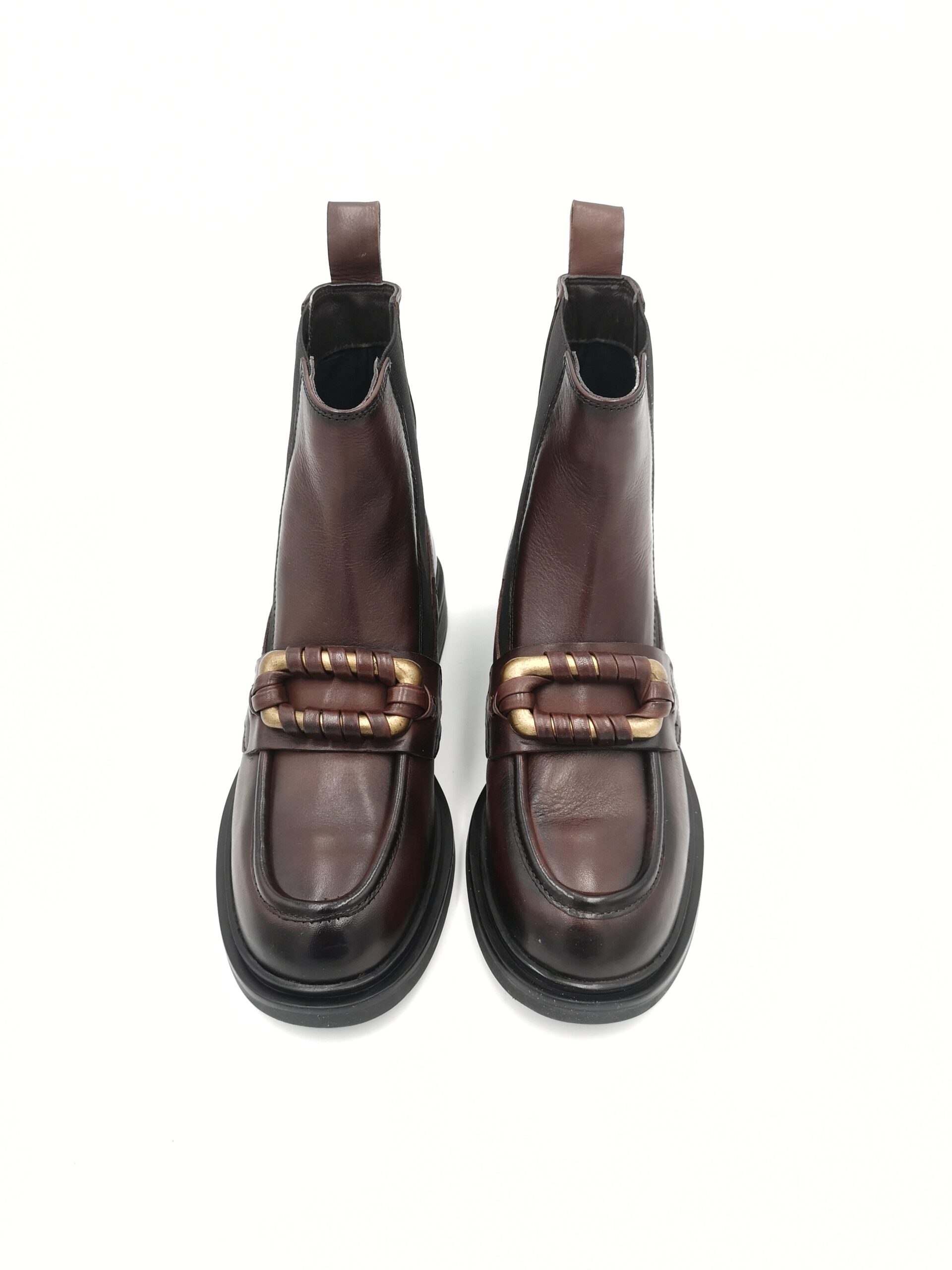 Botin de piel marron cepillada con auste de elasticos laterales. Adorno de hebilla en el empeine. Bonita y diferente.