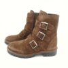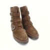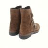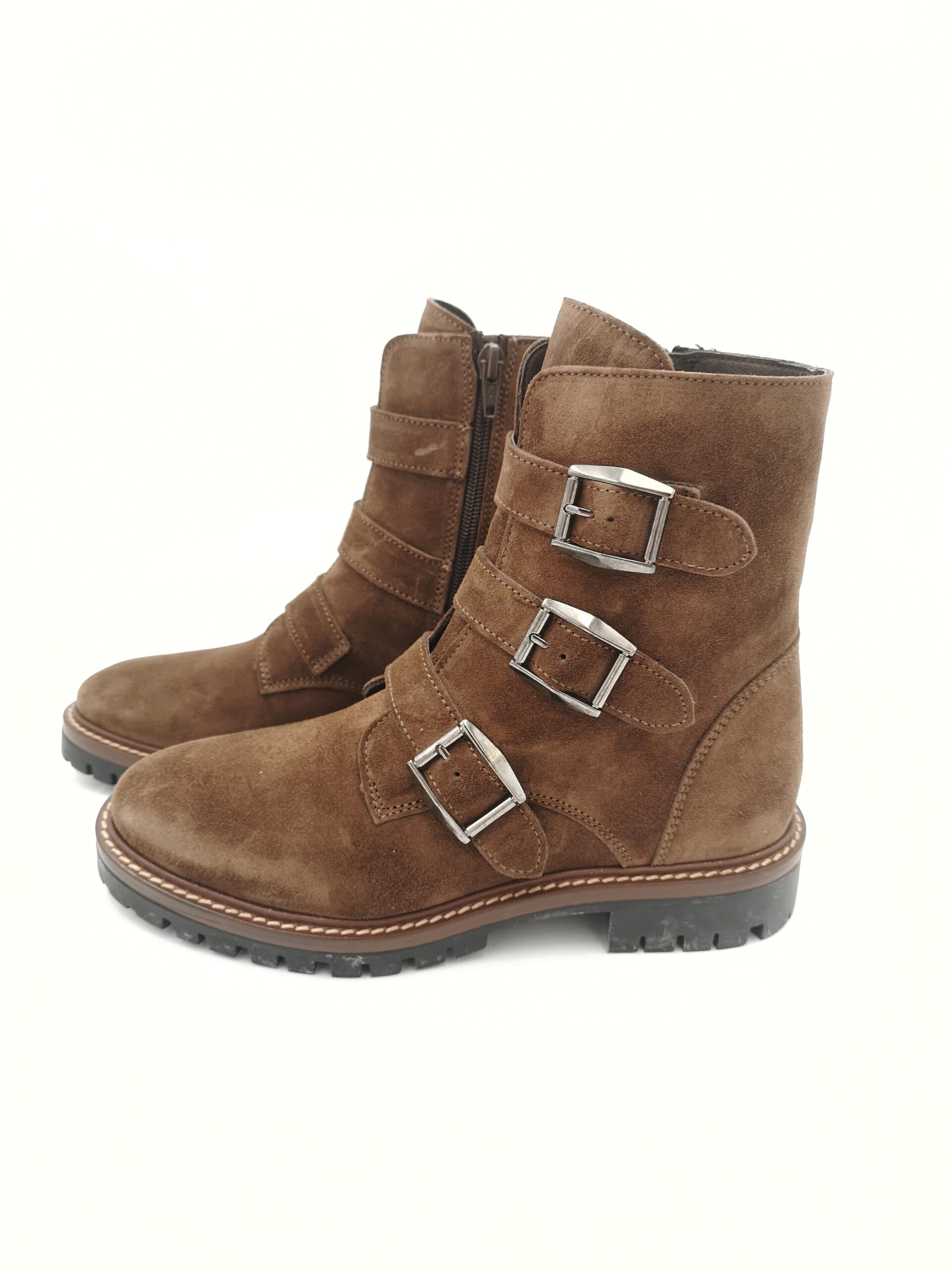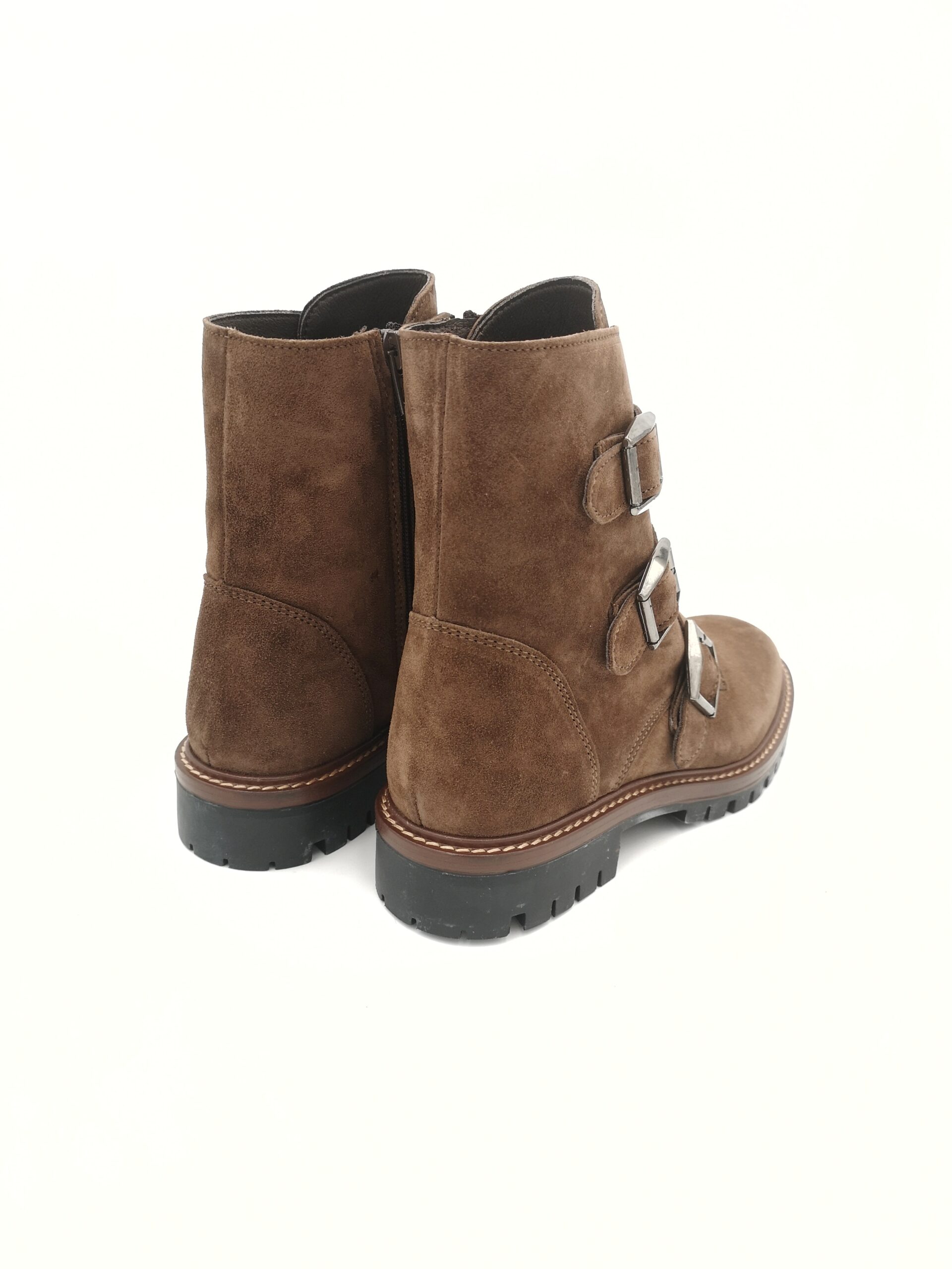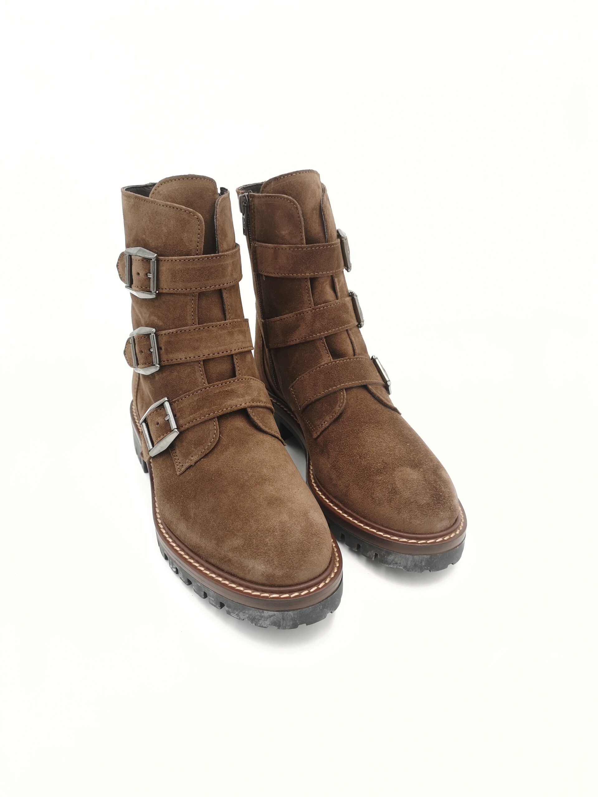 Botin ante marron hebillas y cremallera. Piso goma con relieve.