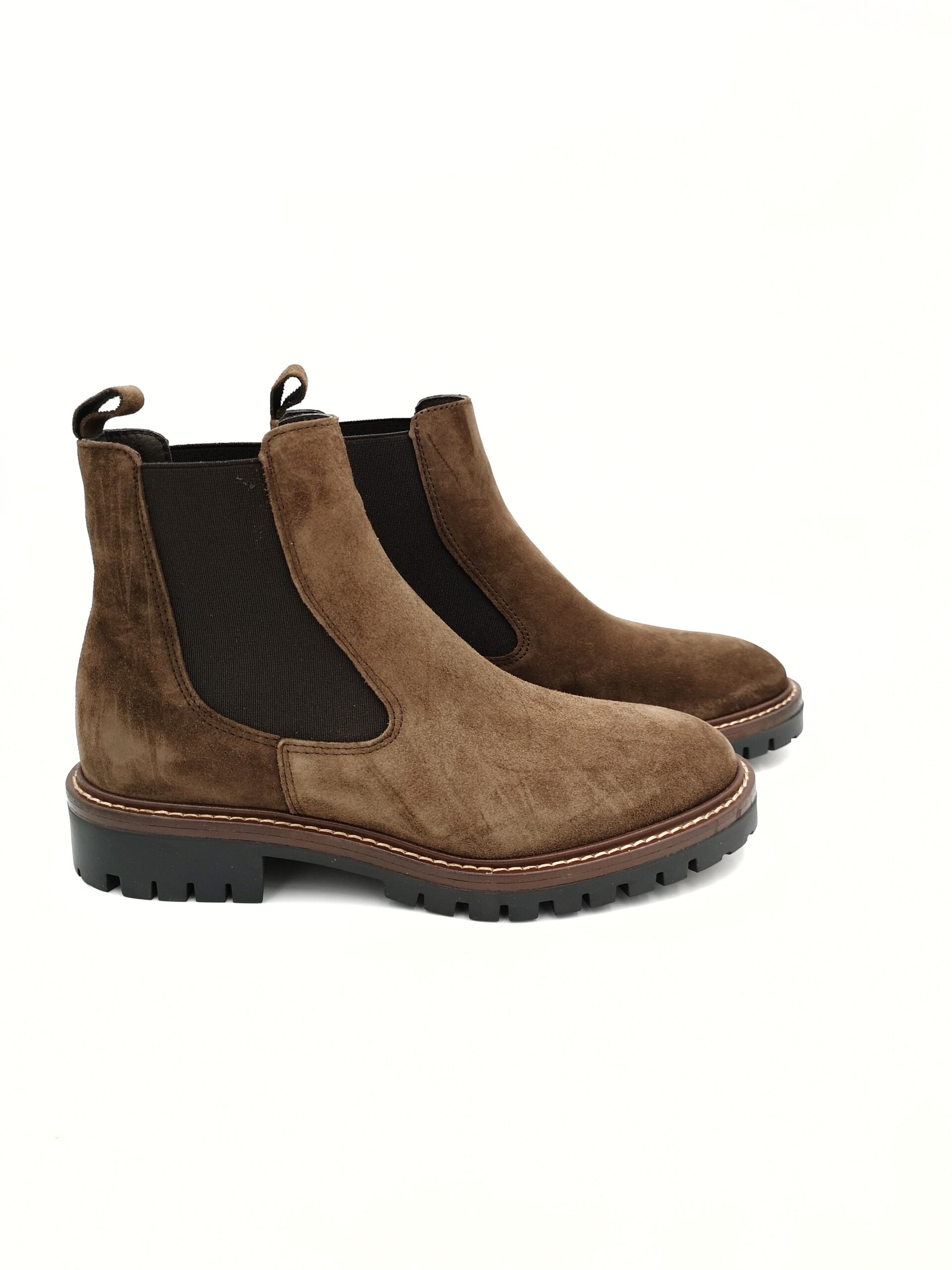 Botin de ante marron con elasticos laterales. Piso de goma con relieve.