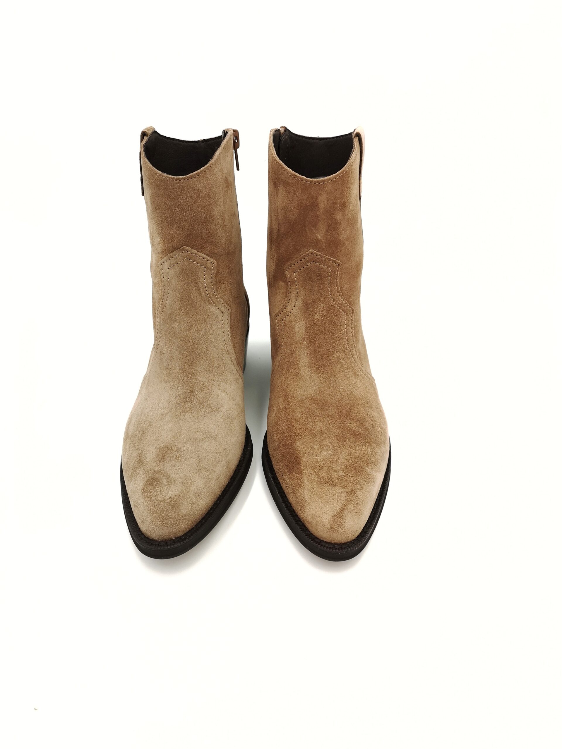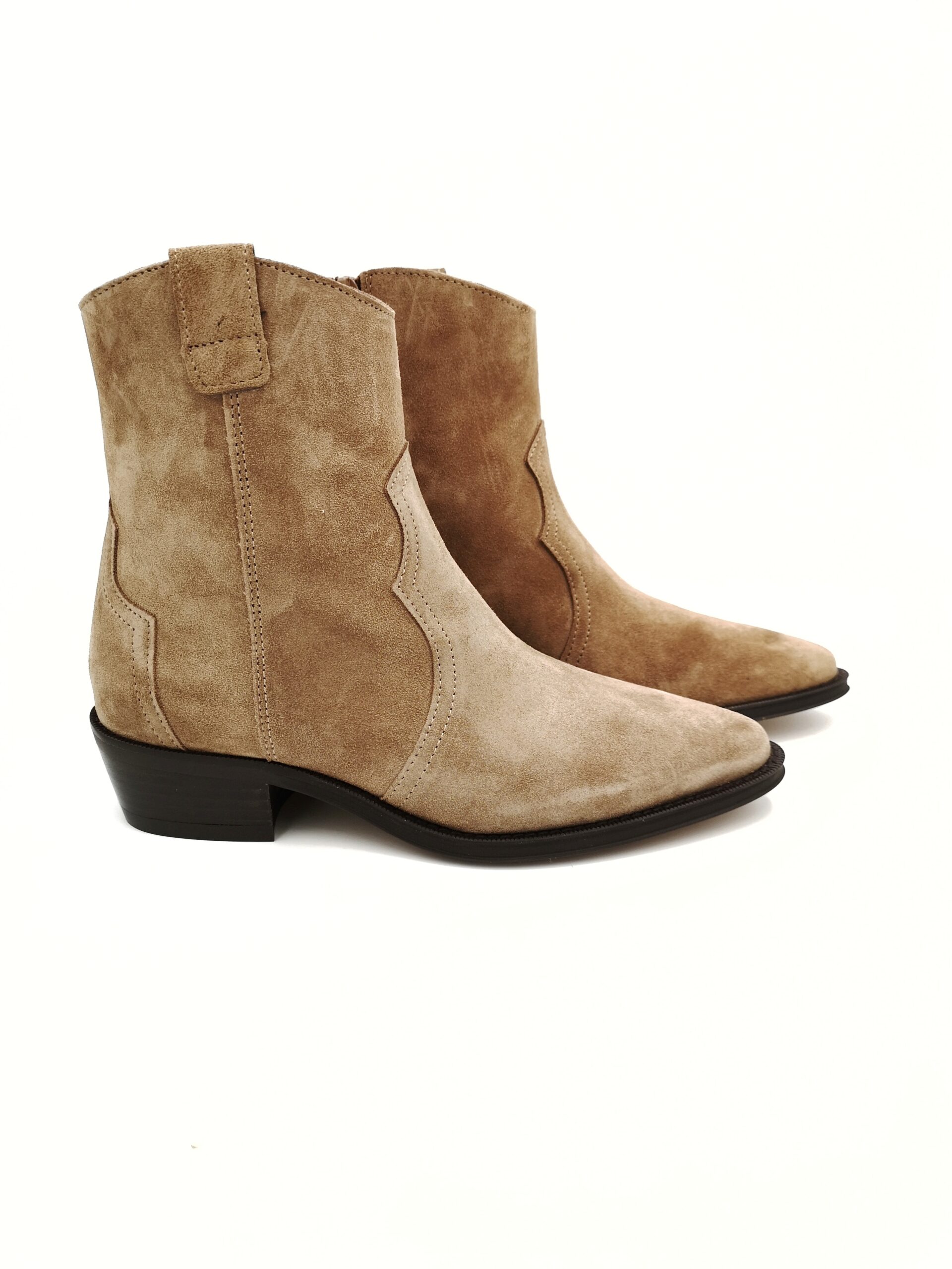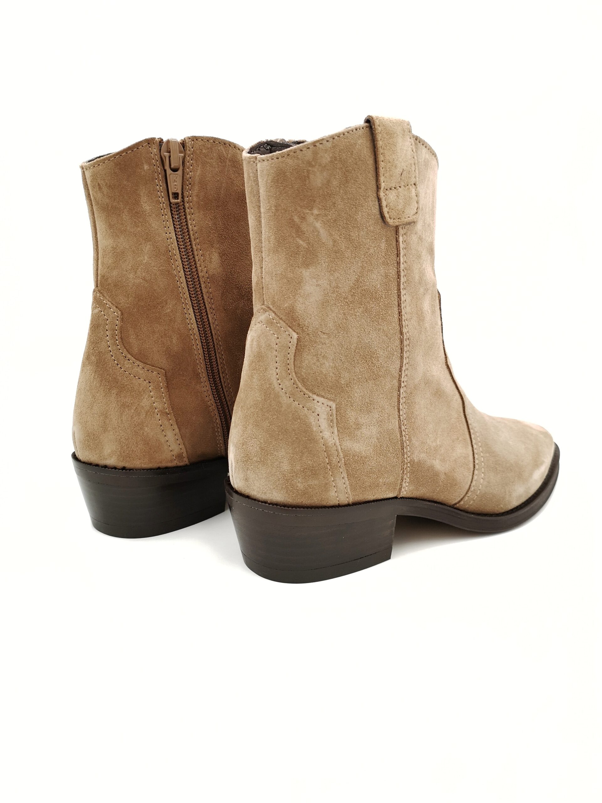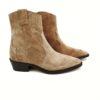Botin campero de ante color beige con cremallera lateral. Tacon de 3 cms.
