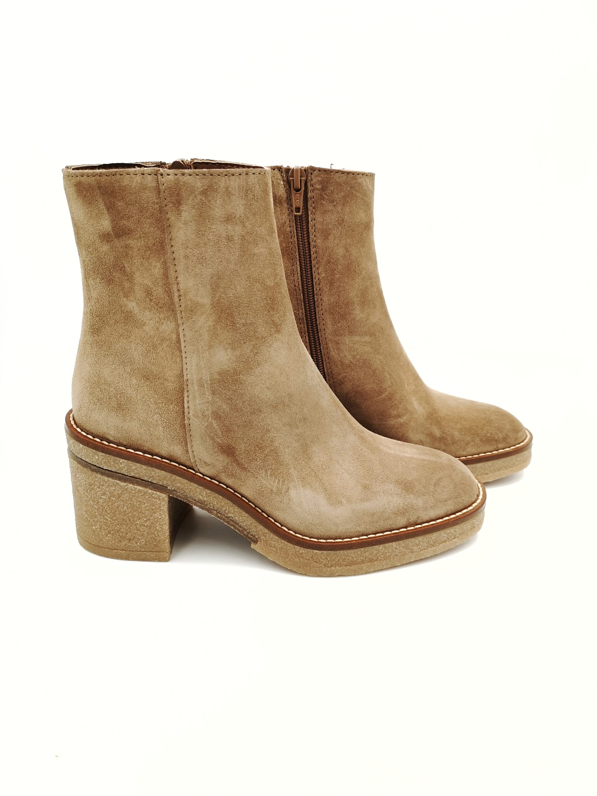 Botin de cremallera en ante color beige. Cremallera lateral. Piso de goma color caramelo con tacon de 5cms.