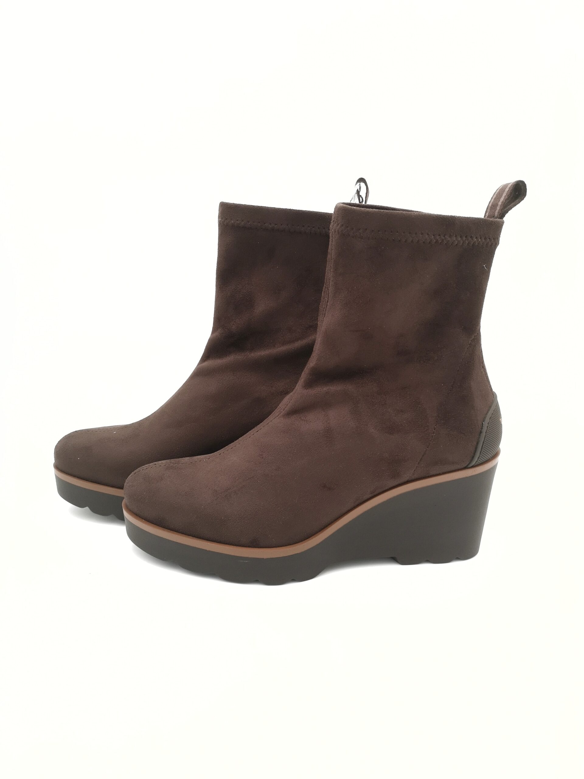 Botin de antelina licra hidrofugada color marron. Tacon de cuña superligera.