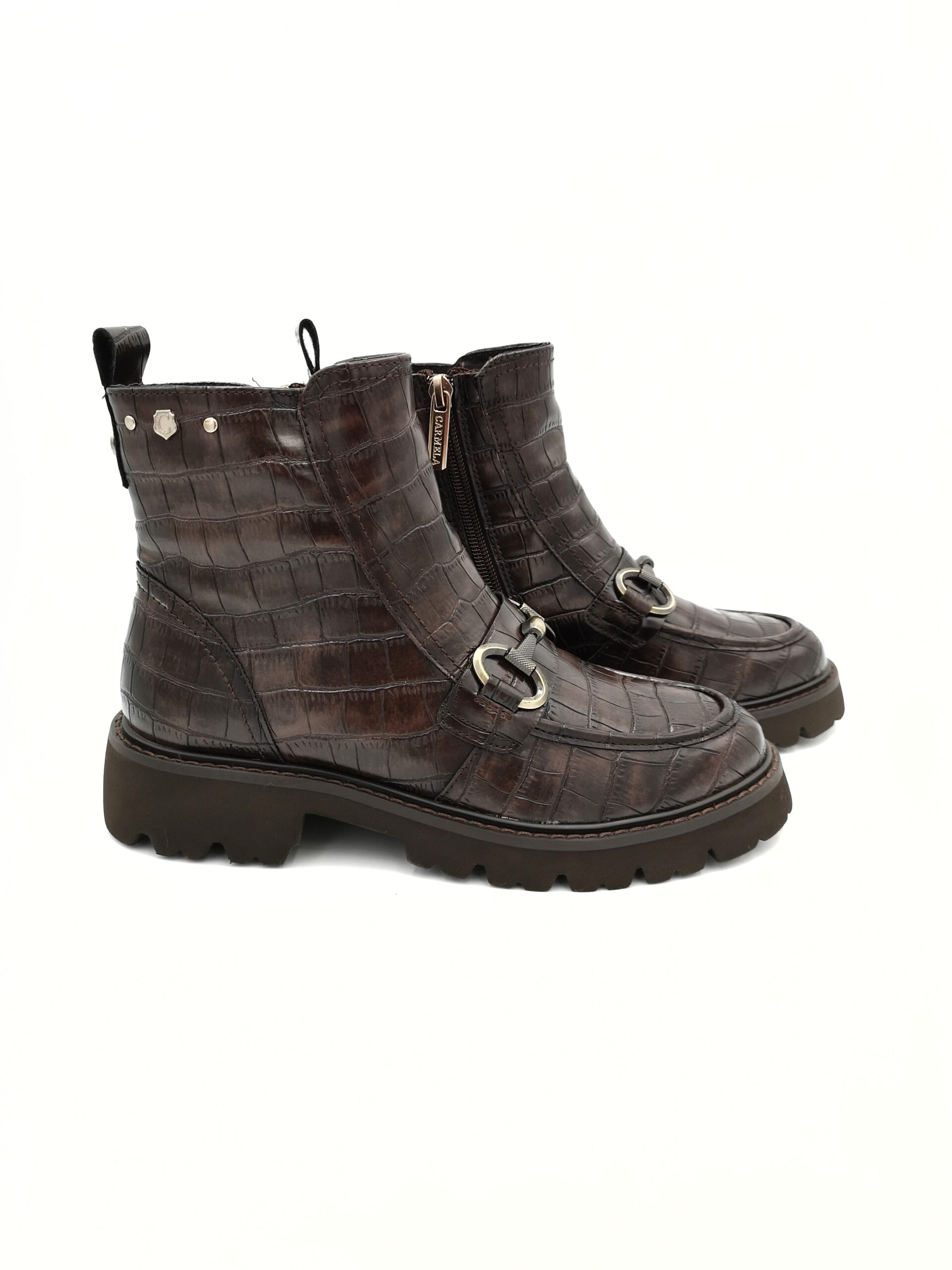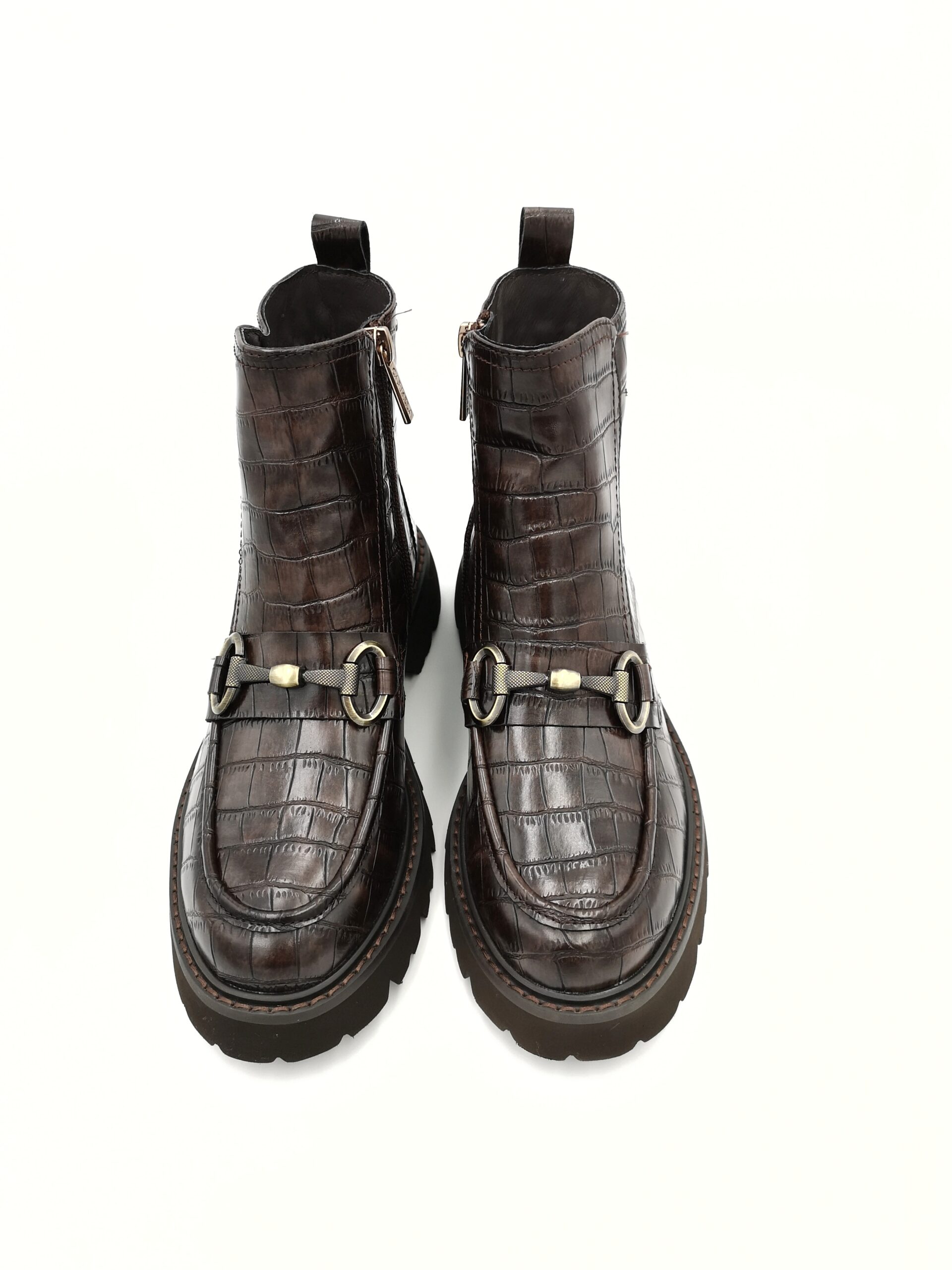 Botin de piel de coco marron con cremallera lateral . Adorno de estribo. Muy ligera y comoda.