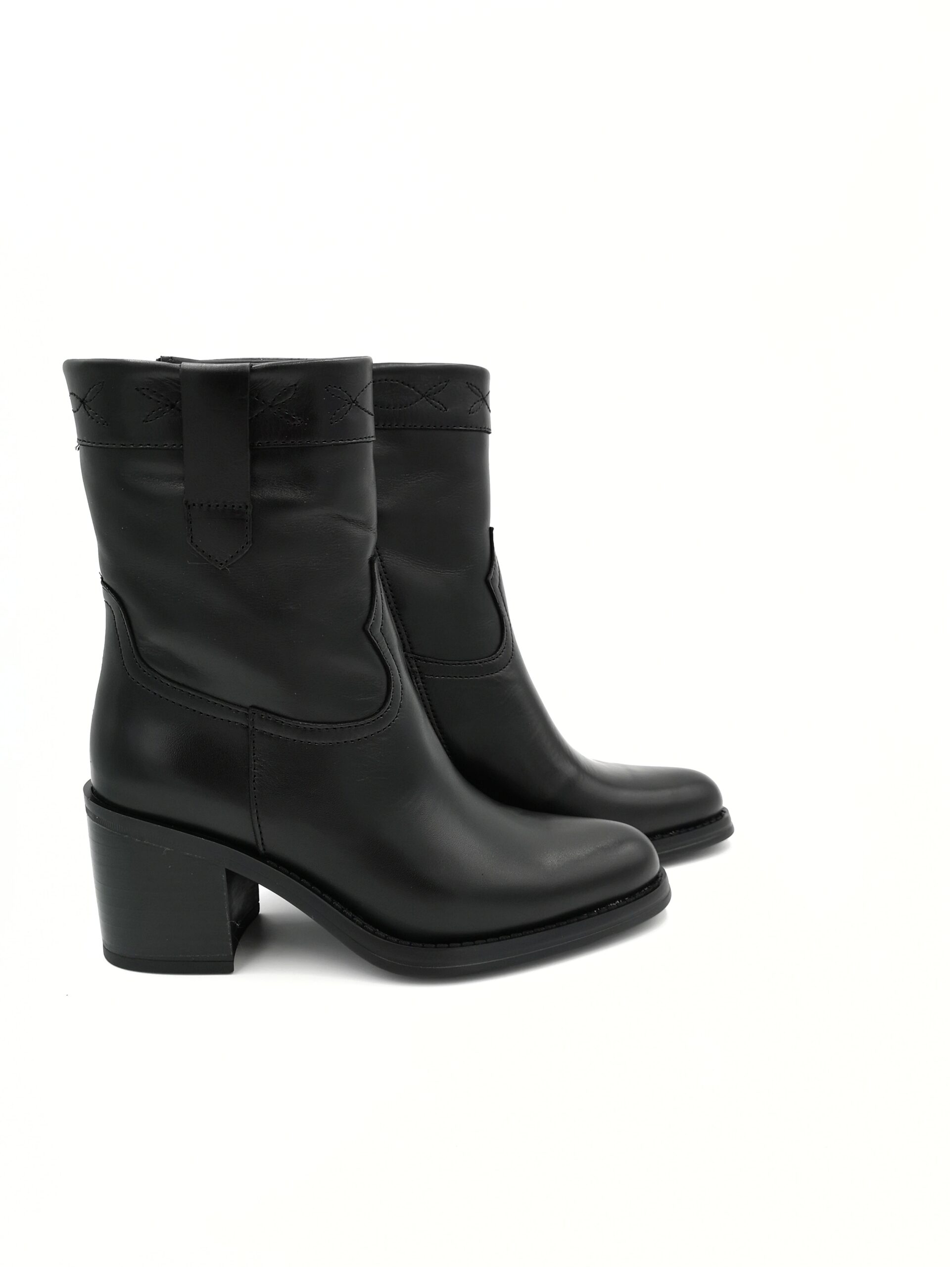 Botin de piel color negro con cremallera lateral. Detalle bordado al tono. Tacon de 5 cms.