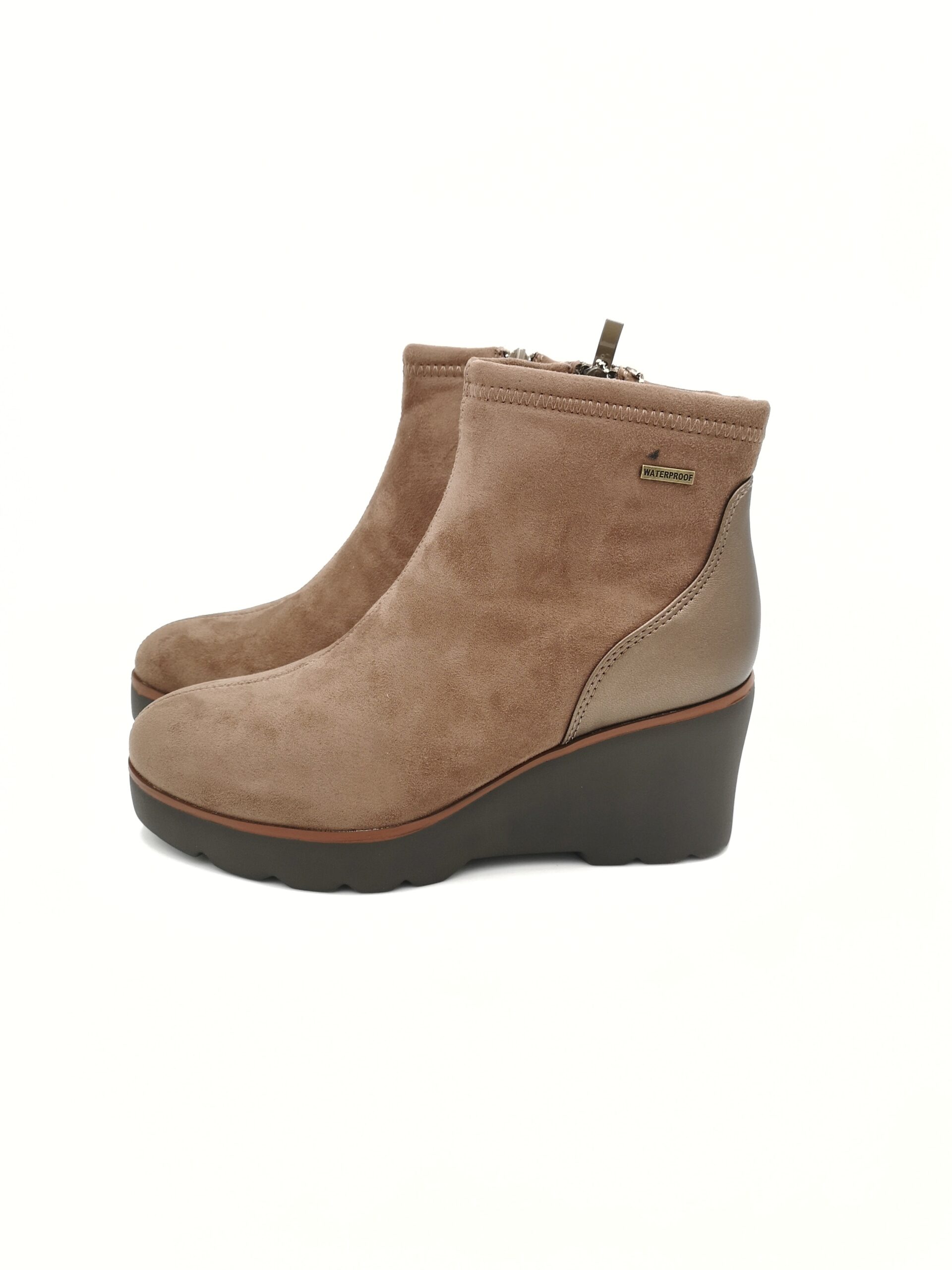 Botin corto de ante marron con cremallera lateral. GORETEX. Piso ligero en cuña de 5 cms.