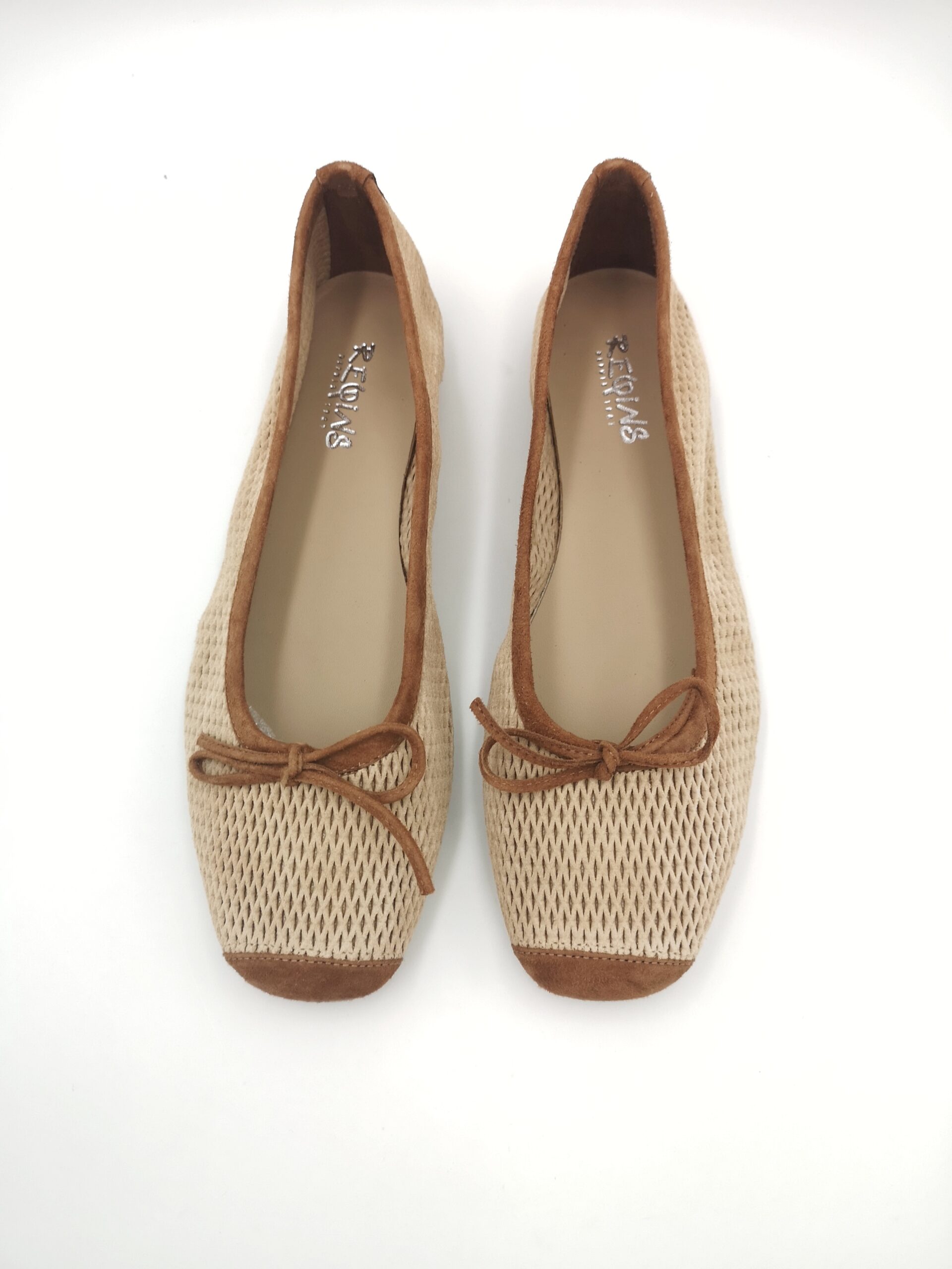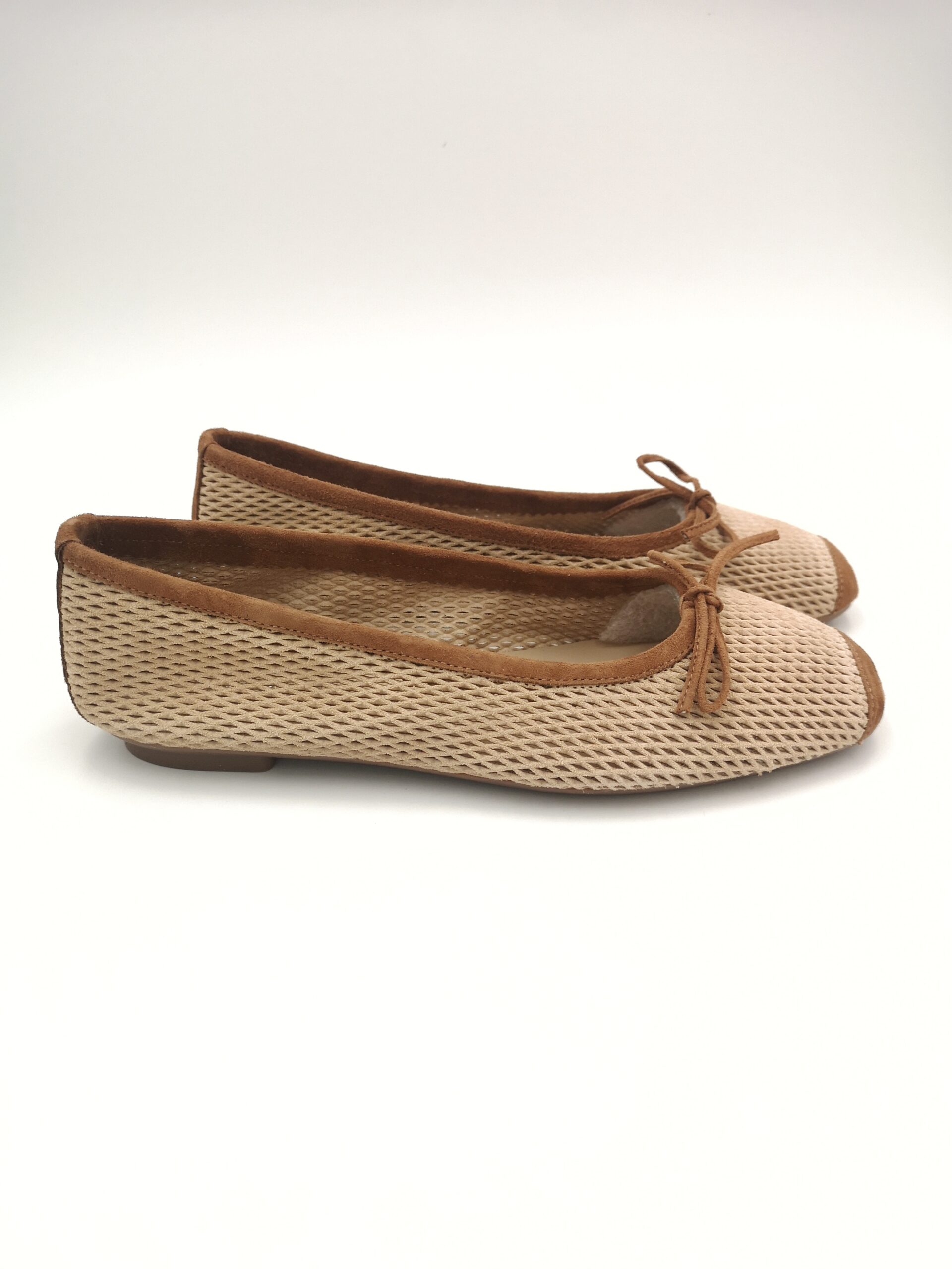 Parisina ante color camel combinada con ante perforado beige. Suave, ligera y muy cómoda. Ajusta perfectamente.