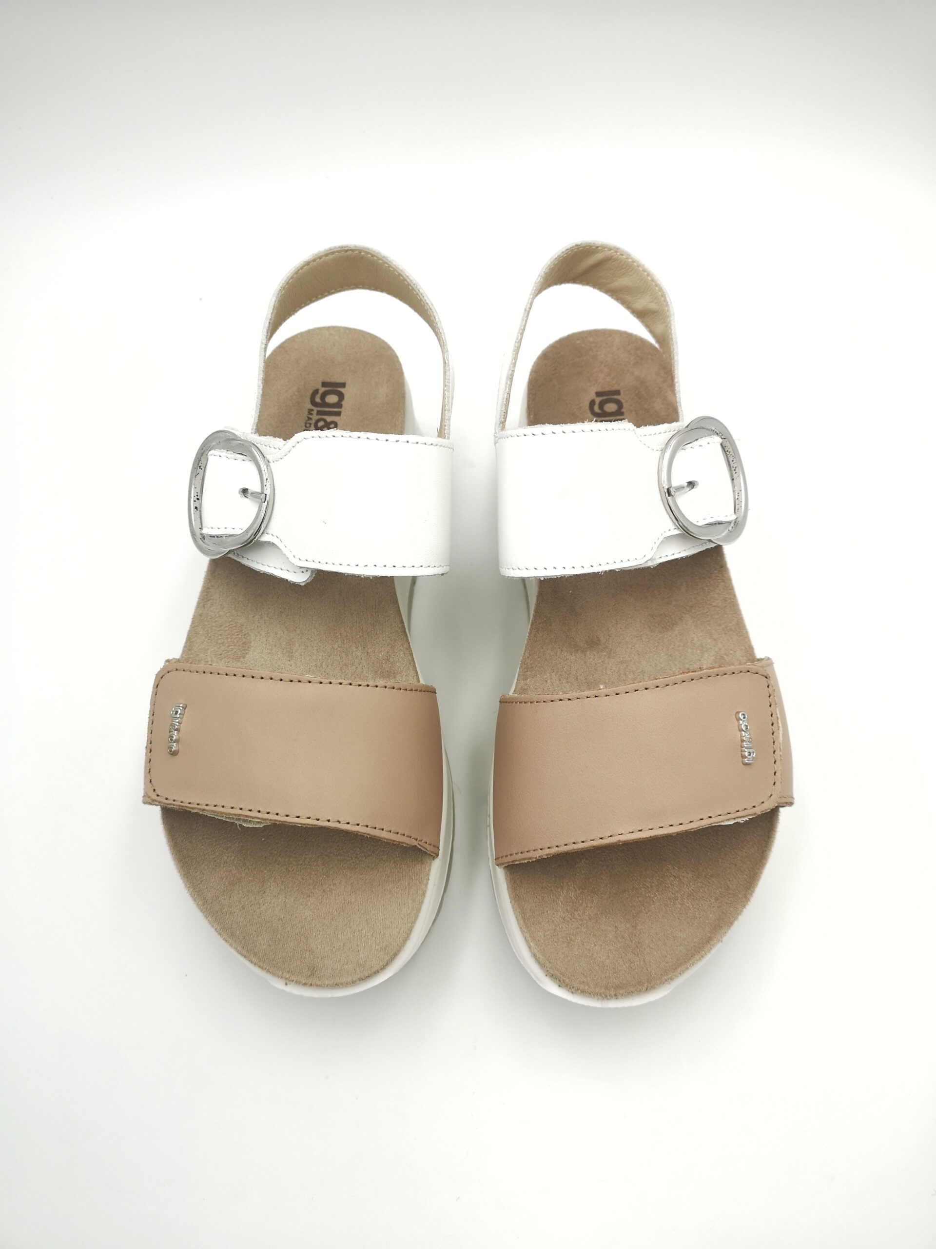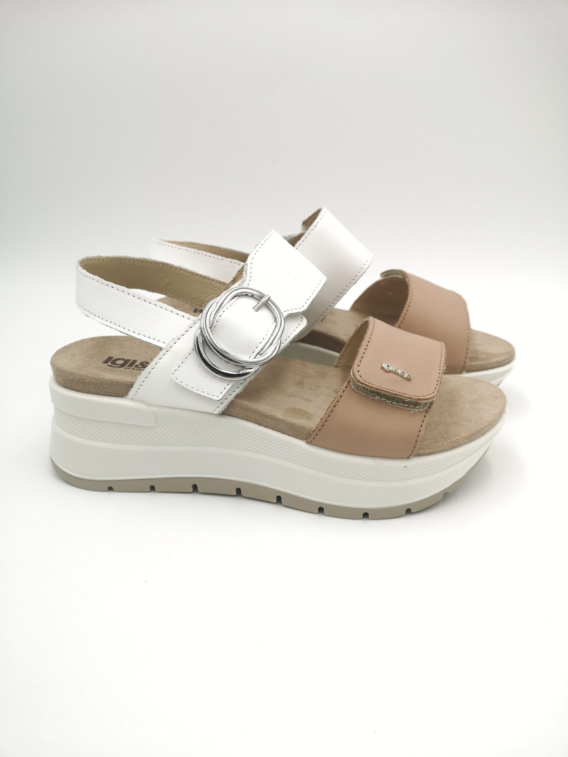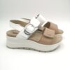 Sandalia de cuña para mujer combinada en tonos blanco y nude, un diseño moderno y versátil perfecto para el día a día. Su combinación de colores aporta un estilo actual y fácil de integrar en múltiples looks.