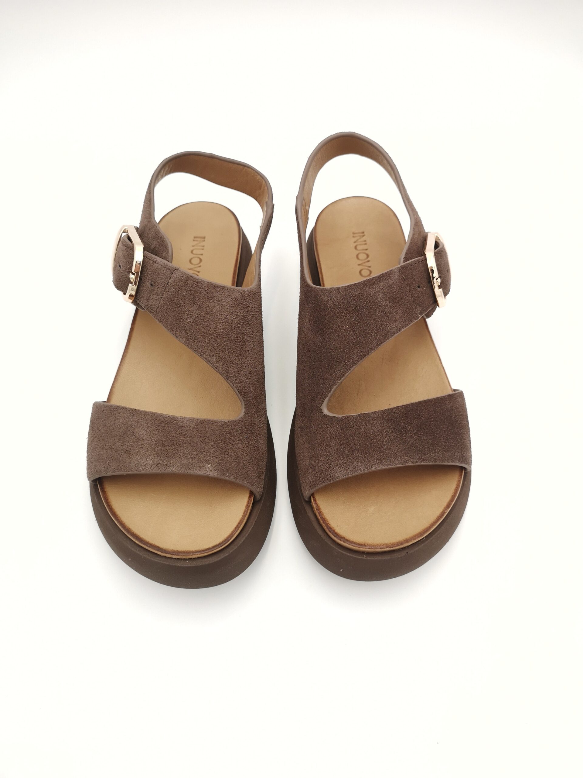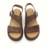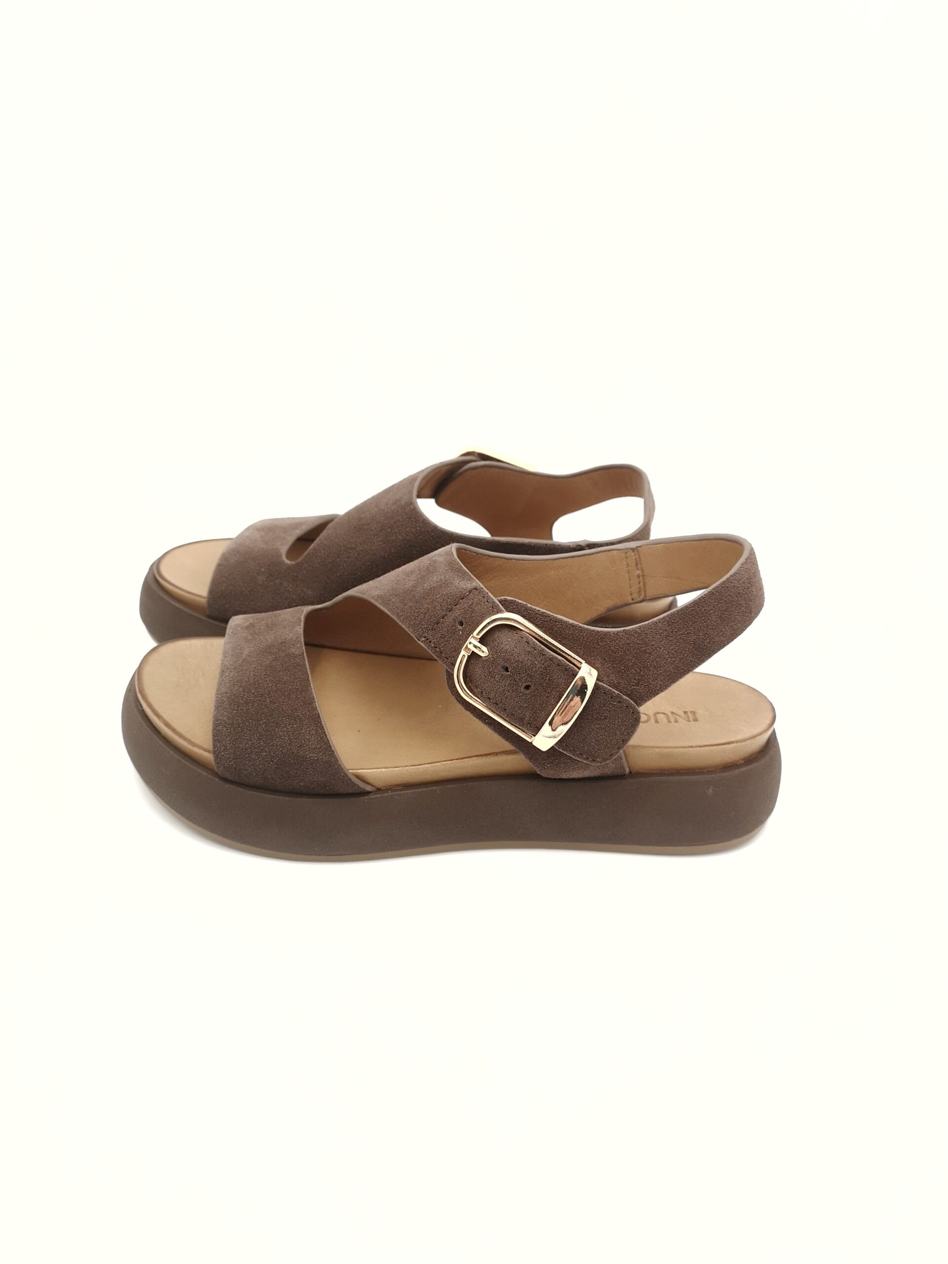 Sandalia de mujer en serraje color marrón, perfecta para el día a día gracias a su diseño cómodo y versátil. Su estilo sencillo con pala ancha y tira trasera aporta una sujeción óptima, mientras que la hebilla dorada añade un toque elegante y actual.