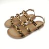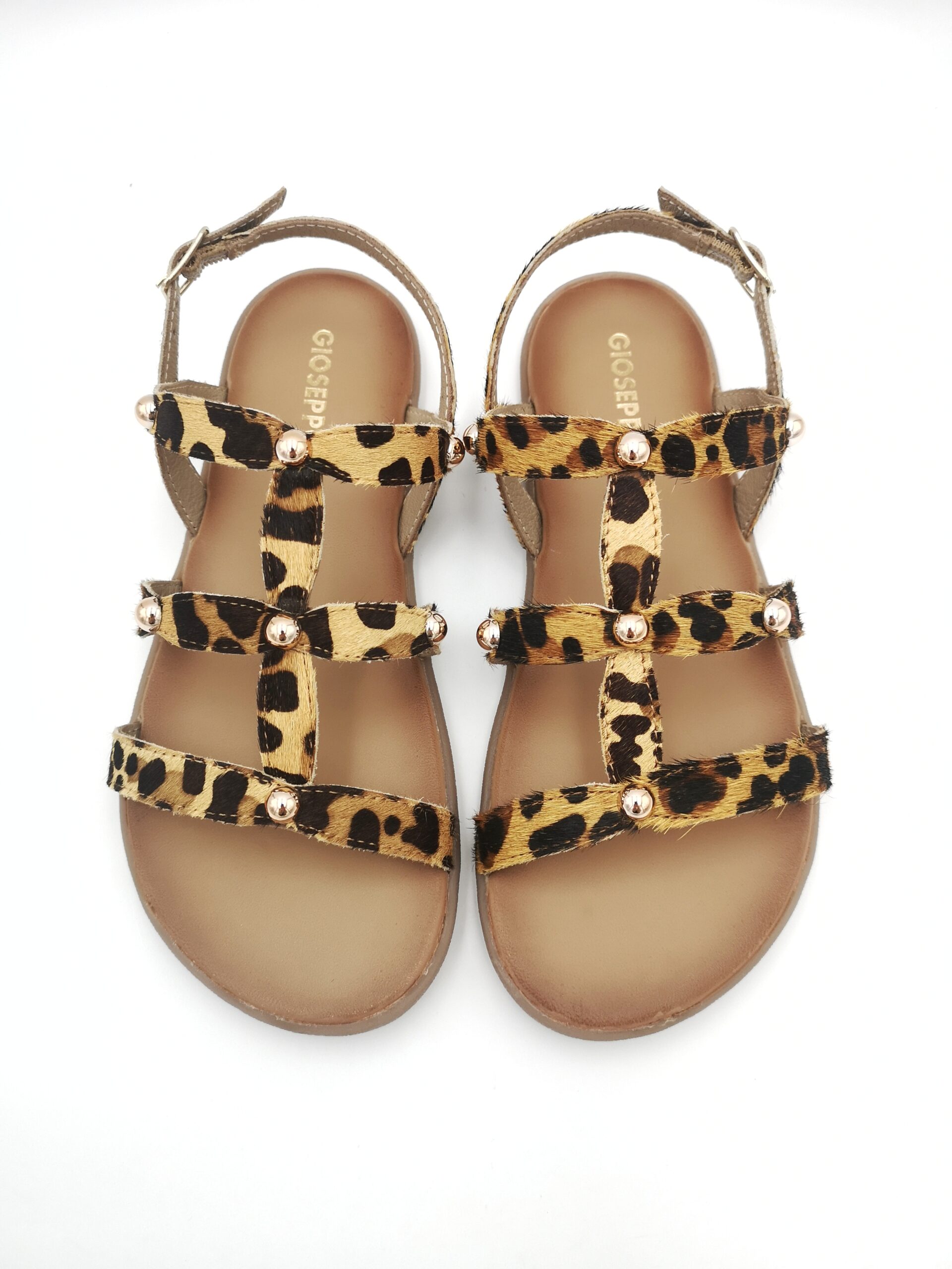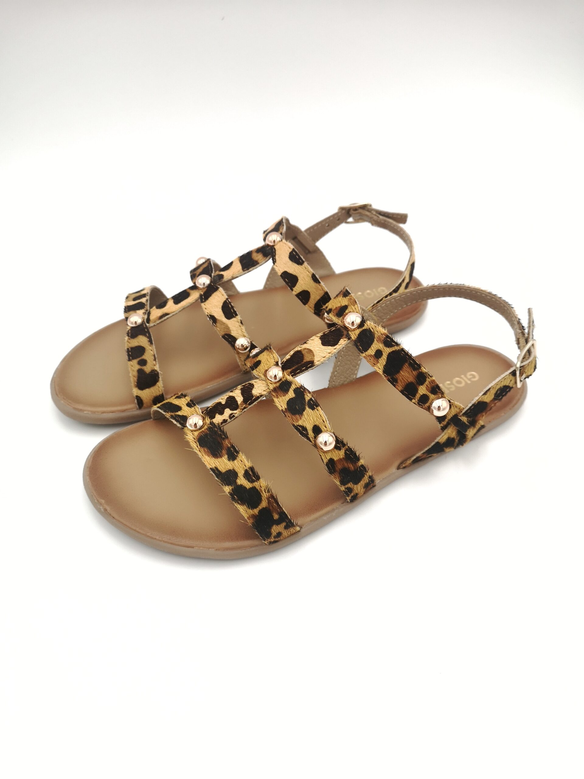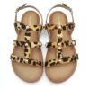 Sandalias planas de piel con estampado animal y detalle de tachas. Diseñadas siguiendo las tendencias minimalistas para garantizar la pisada natural. Cierres ajustables en el tobillo.