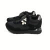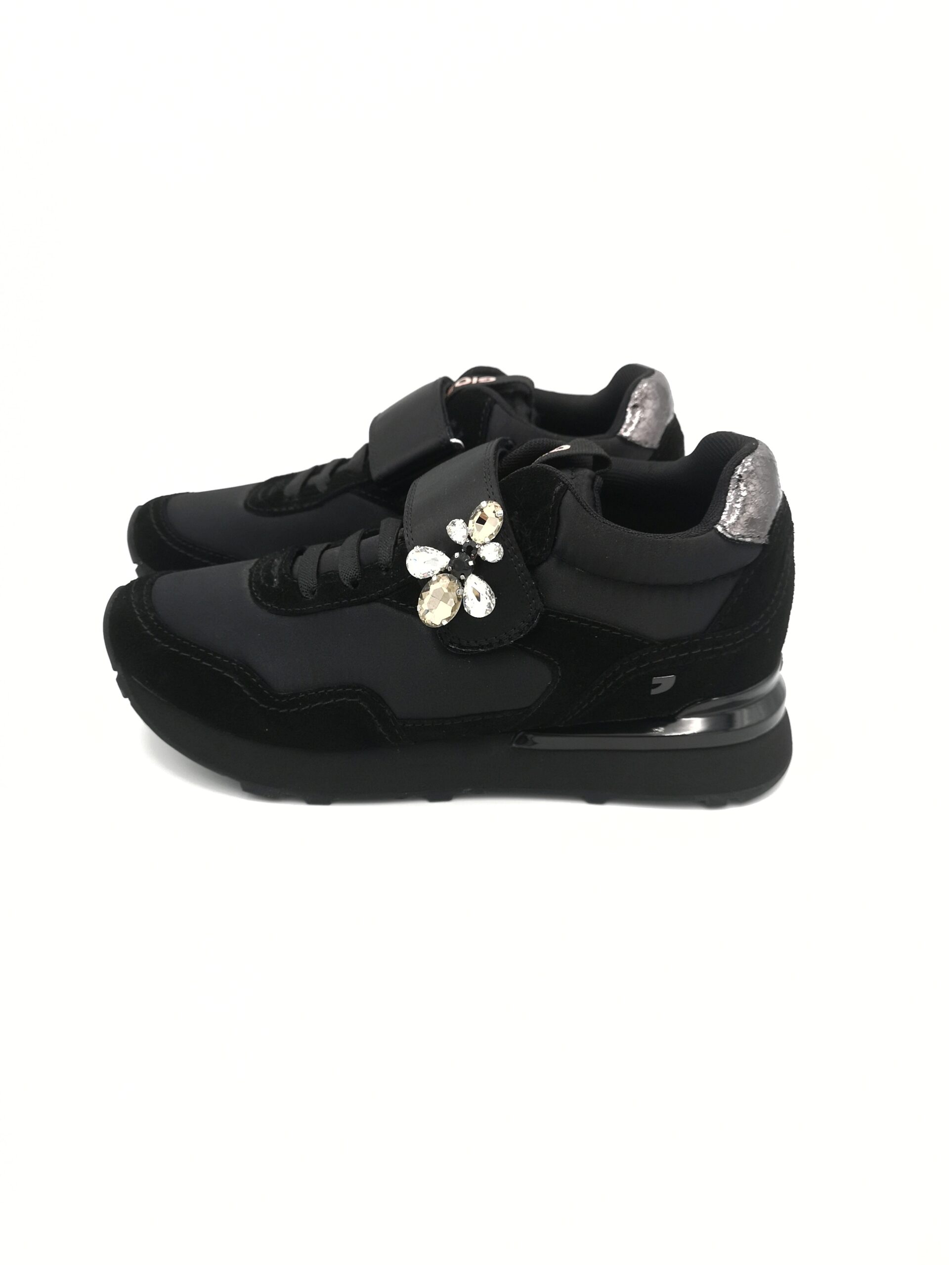 Deportivo combinado ante y nylon negro color negro con ajuste de elasticos y velcroen el empeine. Adorno joya. Cuña interna.