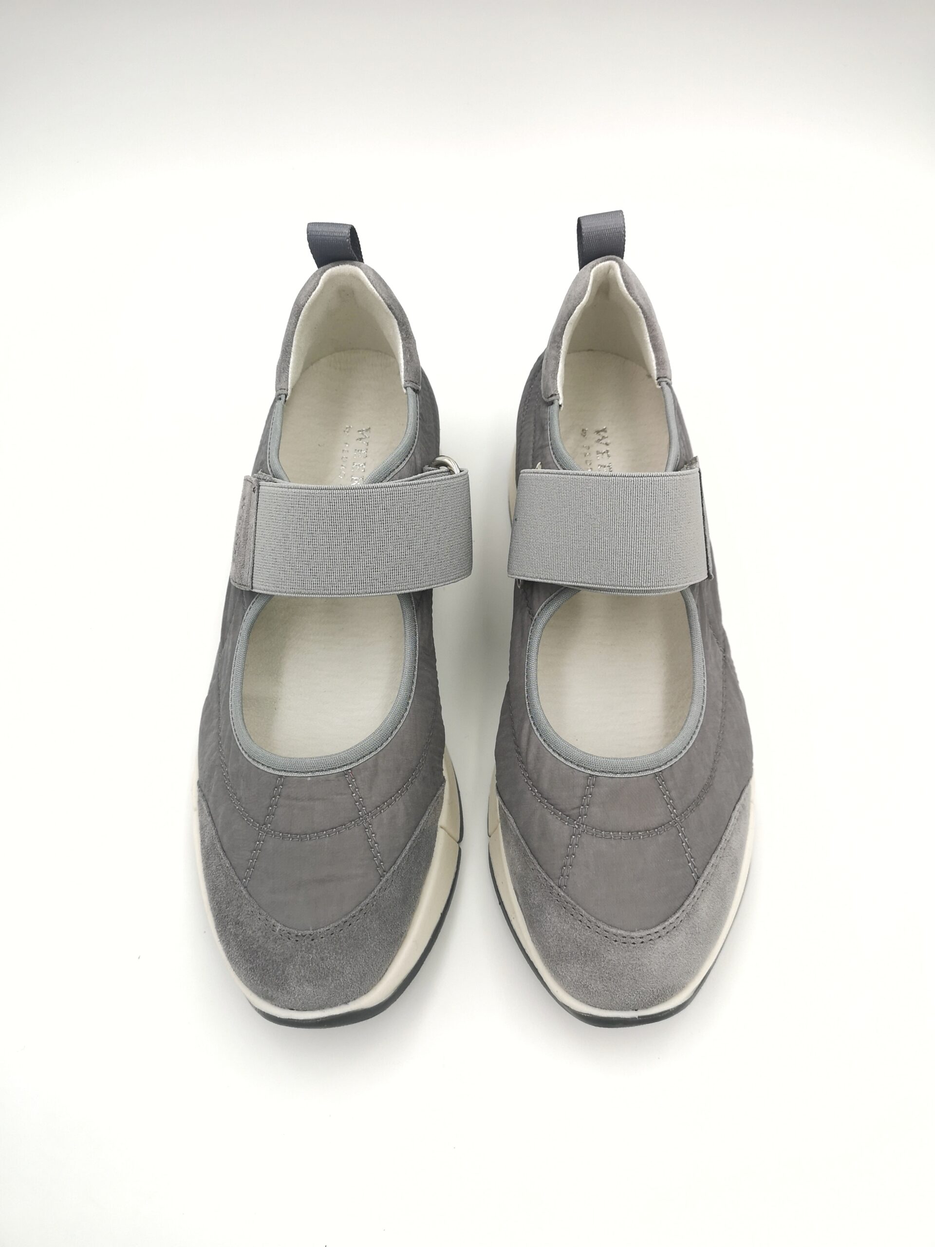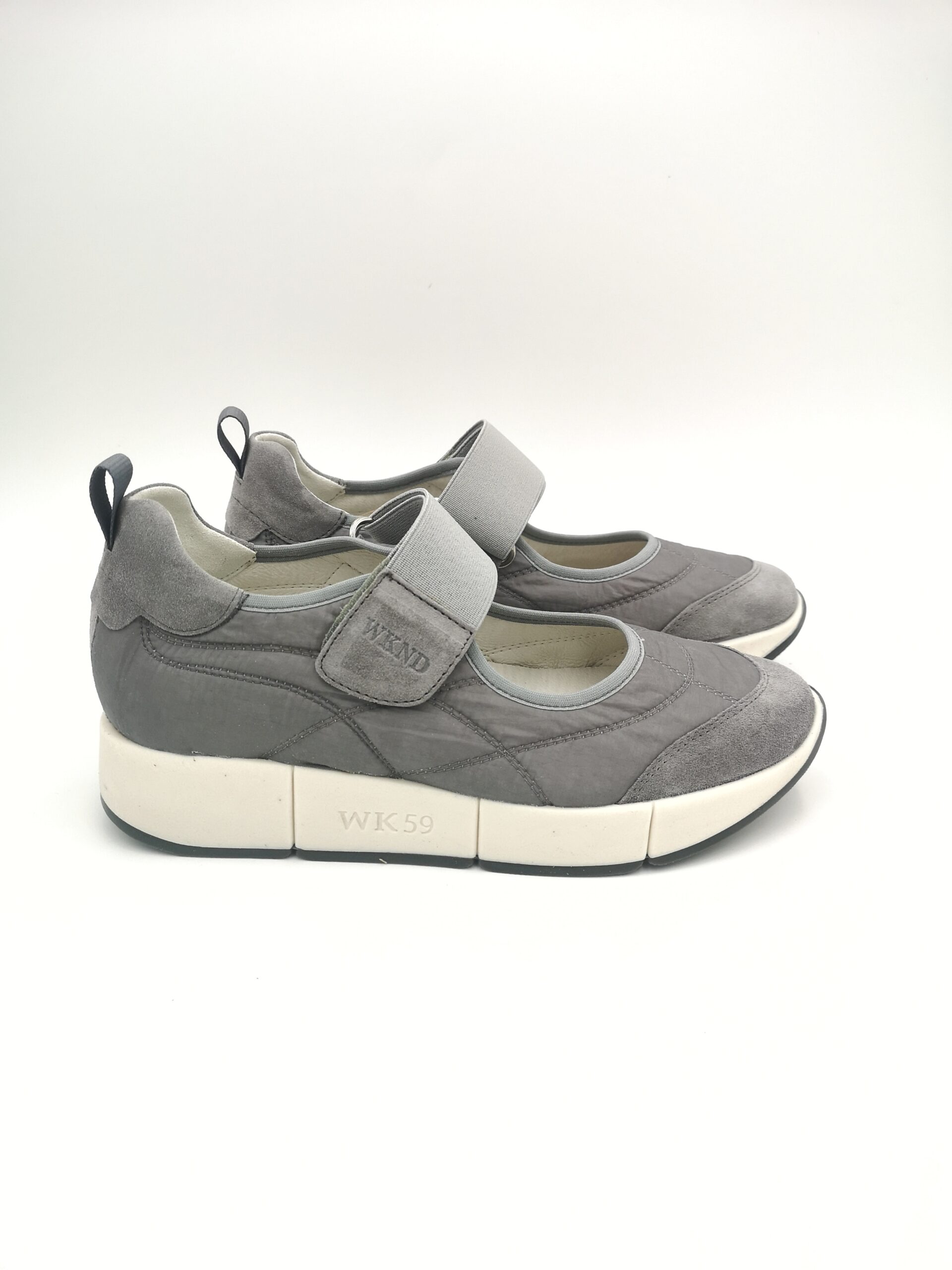 Zapatilla combinada ante y nylon color gris. Ajuste de velcro. Plantilla extraíble. Muy cómoda.