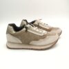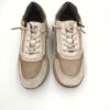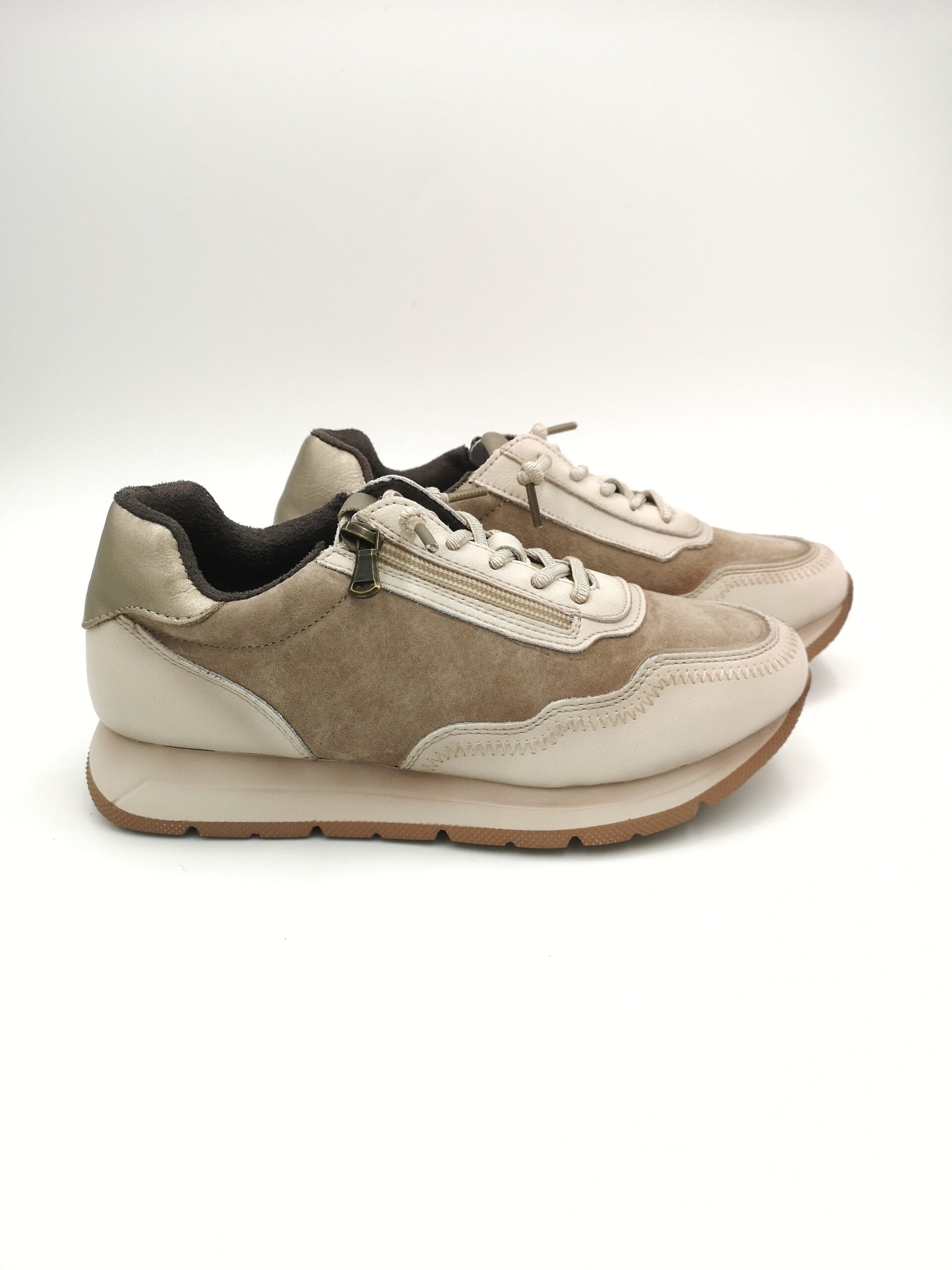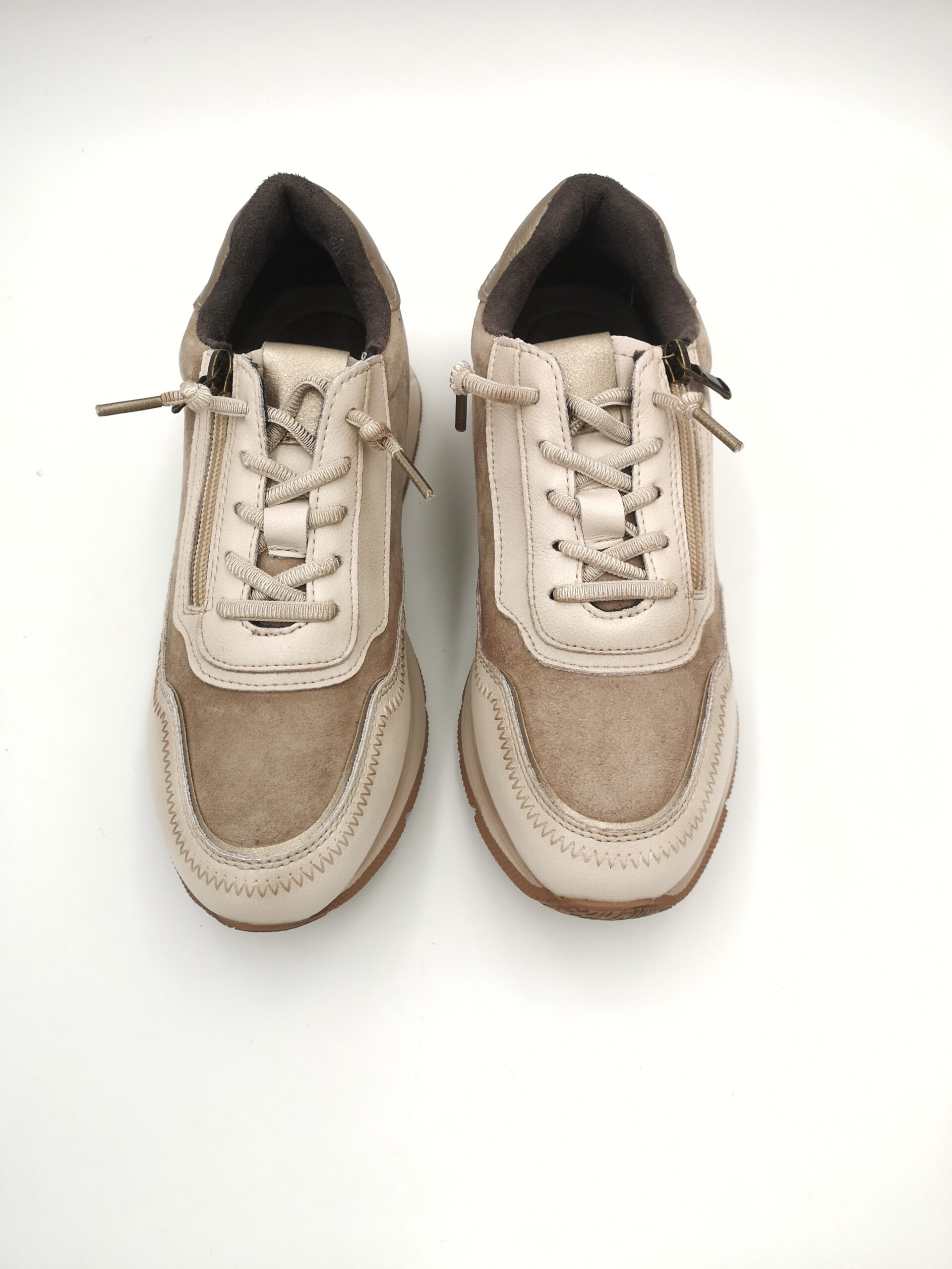 Zapatilla combinada en piel y ante color beige claro. Ajuste de cordon elastico y cremallera lateral. Piso muy ligero.