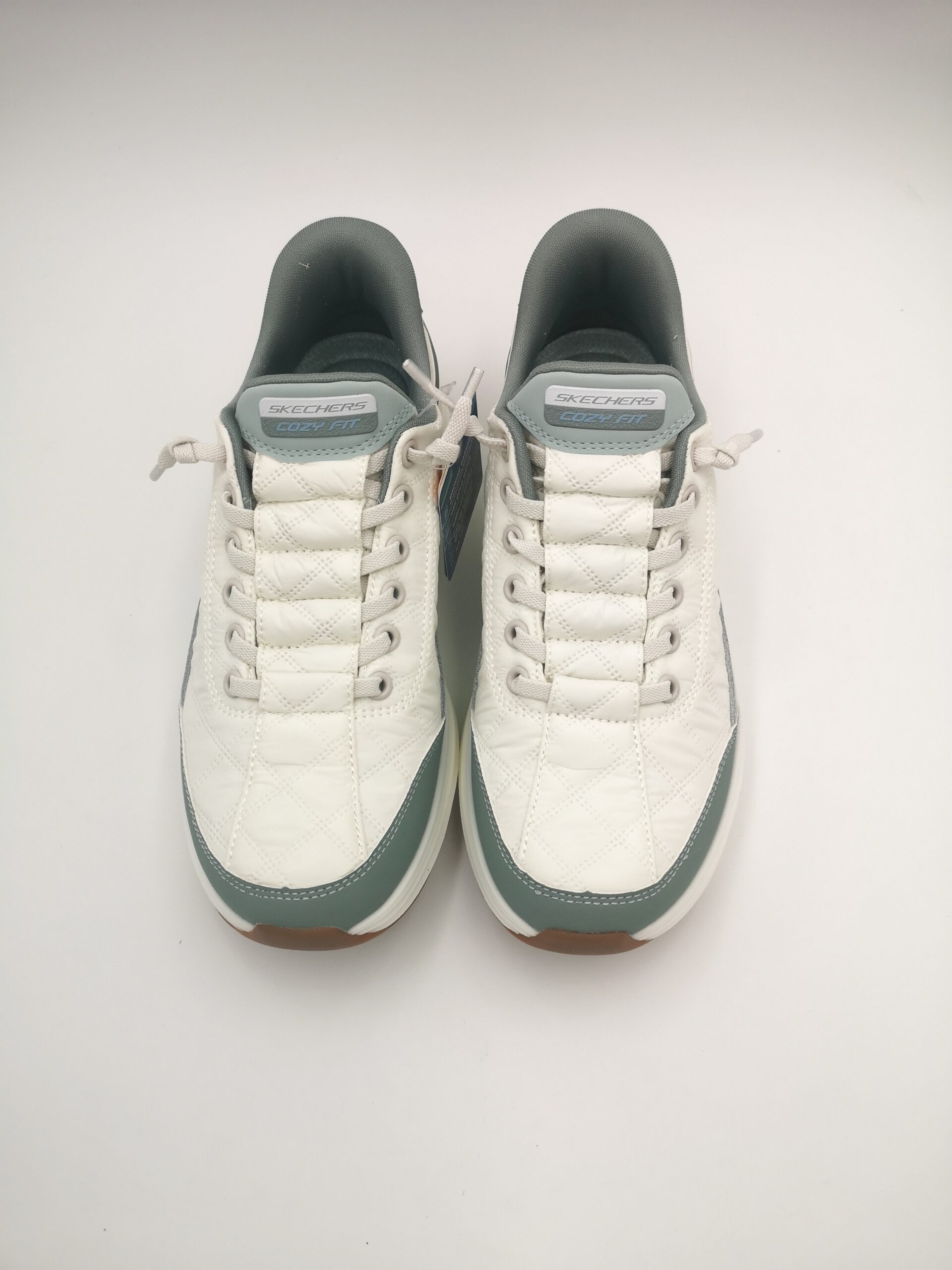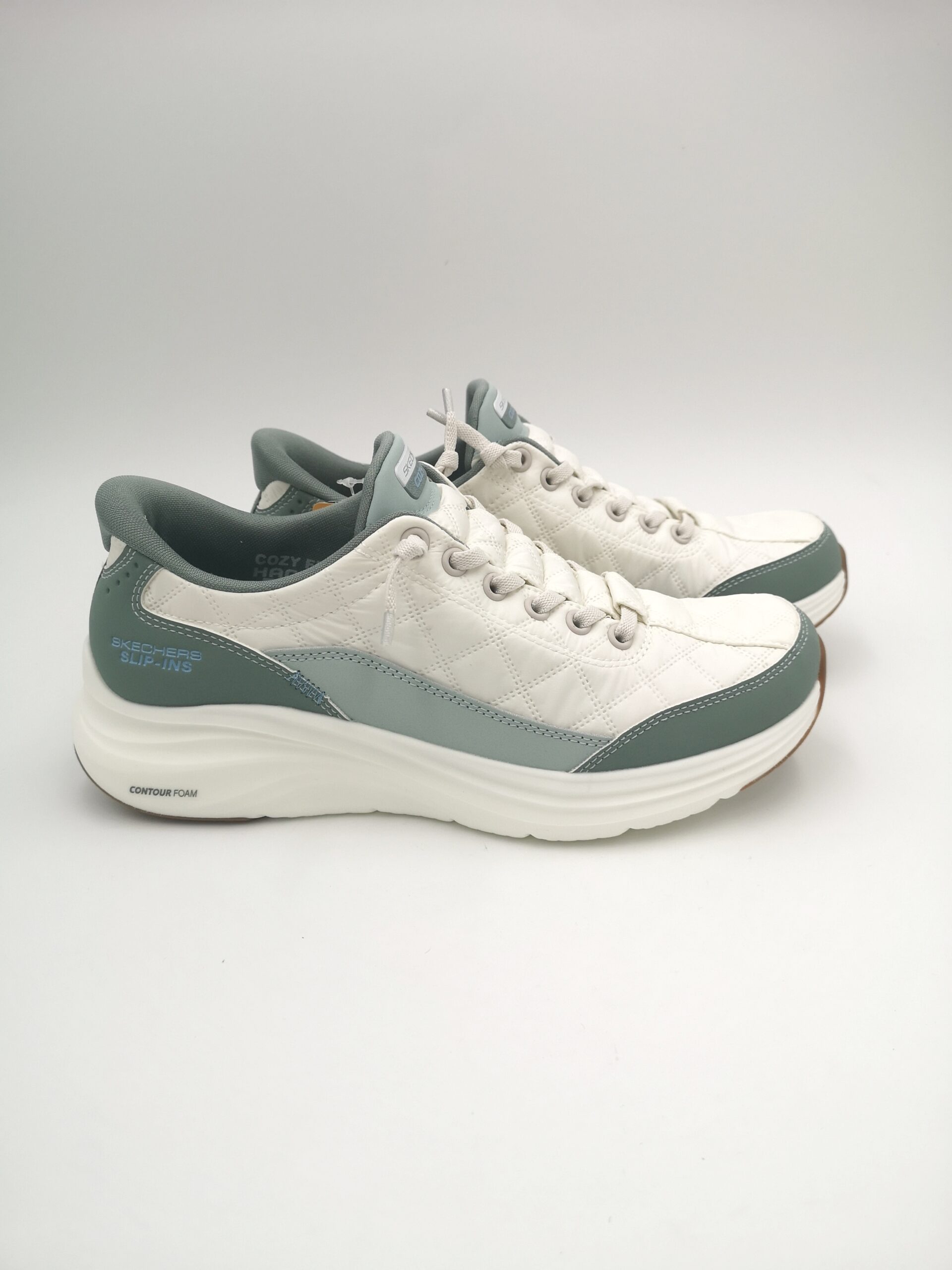 Zapatilla combinada en blanco y verde con cordón elástico y el sistema de Slip-ins de fácil calce de la marca Skechers. Super confortable.