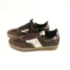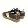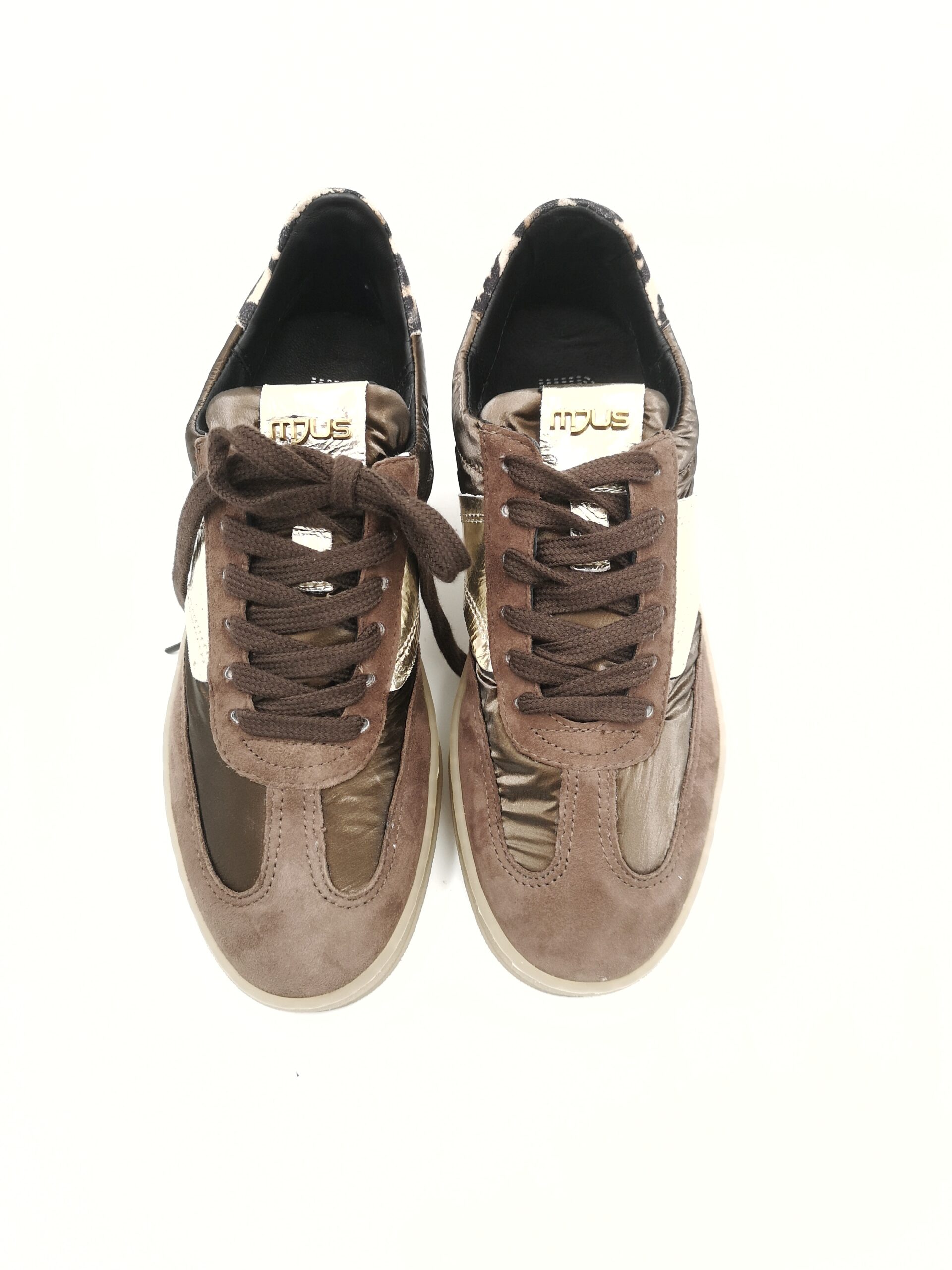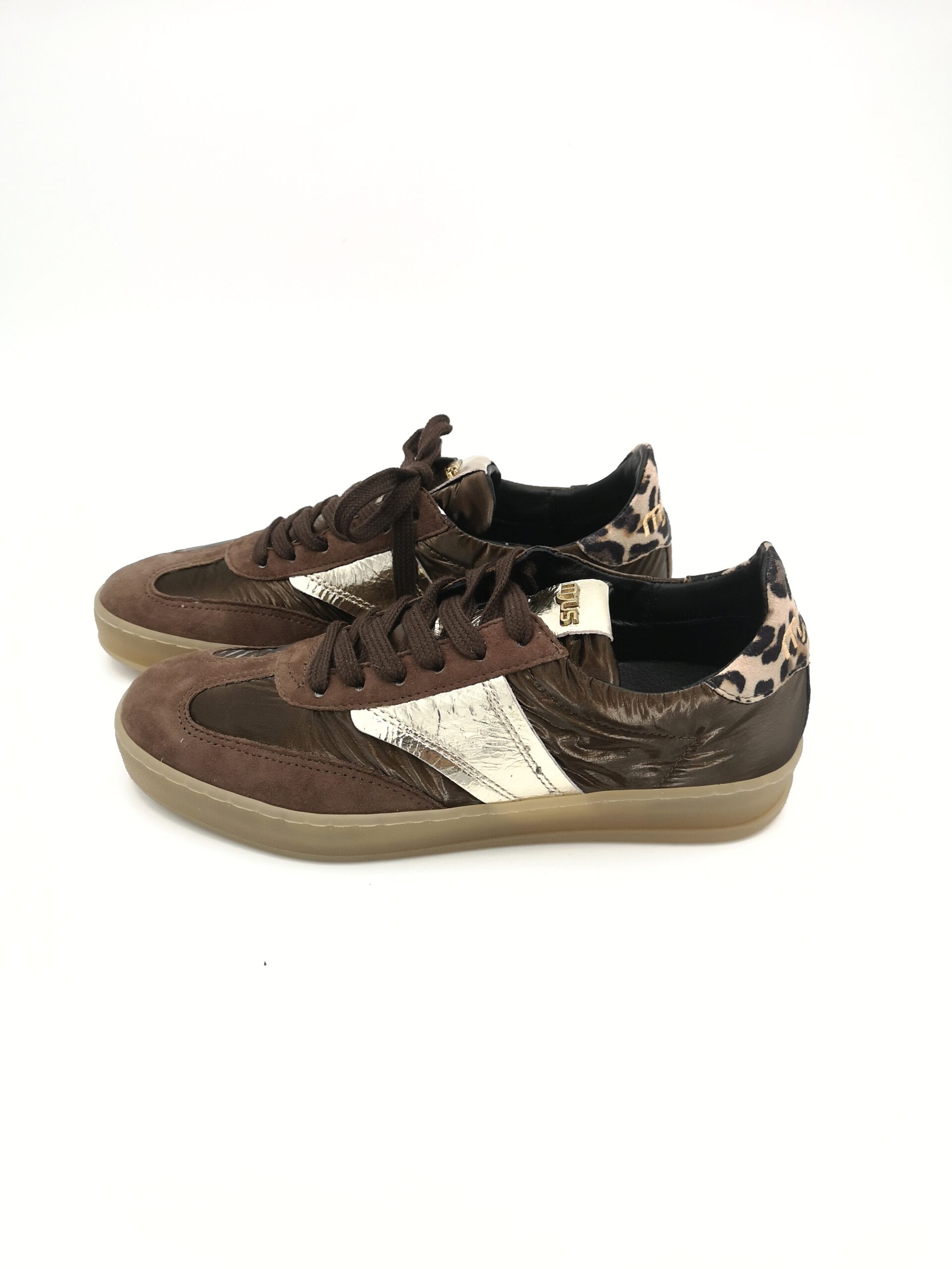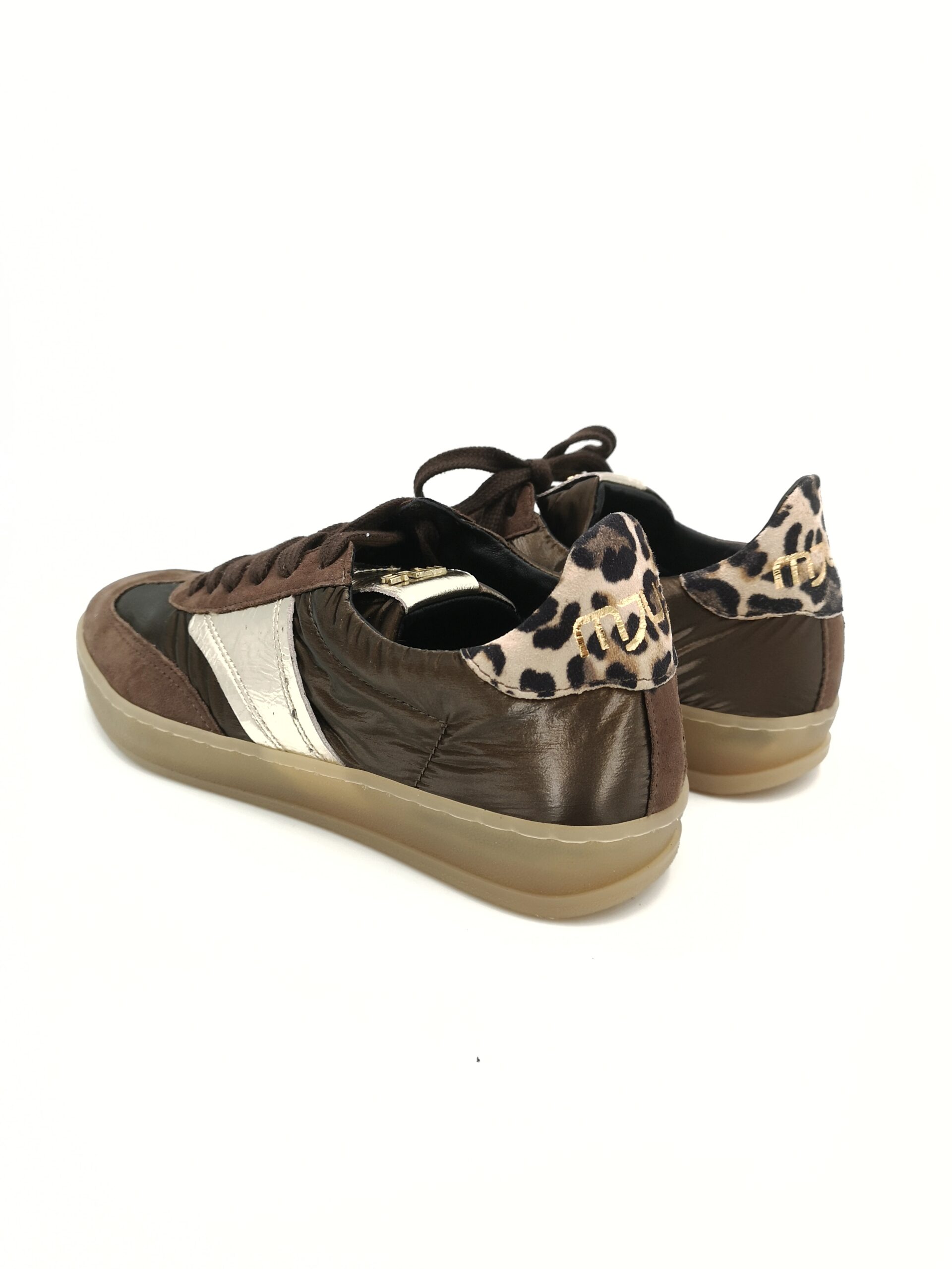 Zapatilla de cordon en ante marron con nylon al tono y detalles platino y leopardo. Piso goma flexible color caramelo.