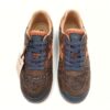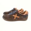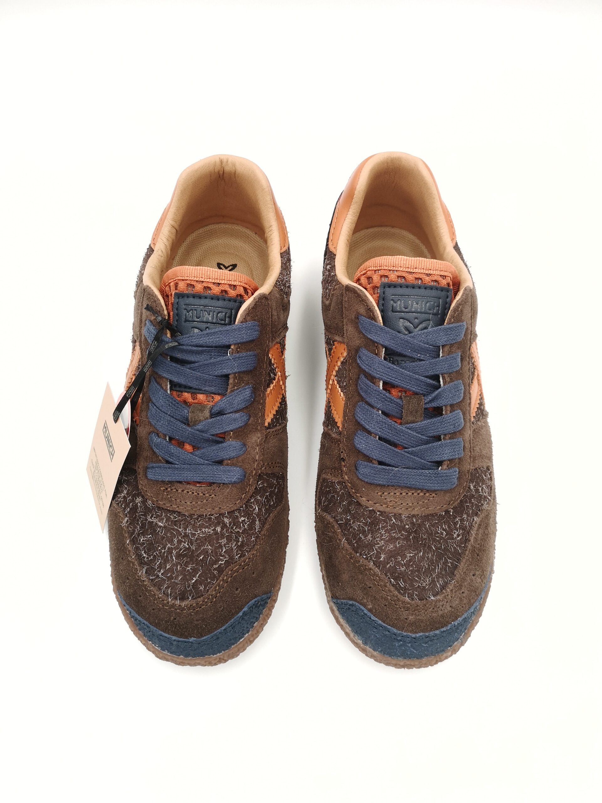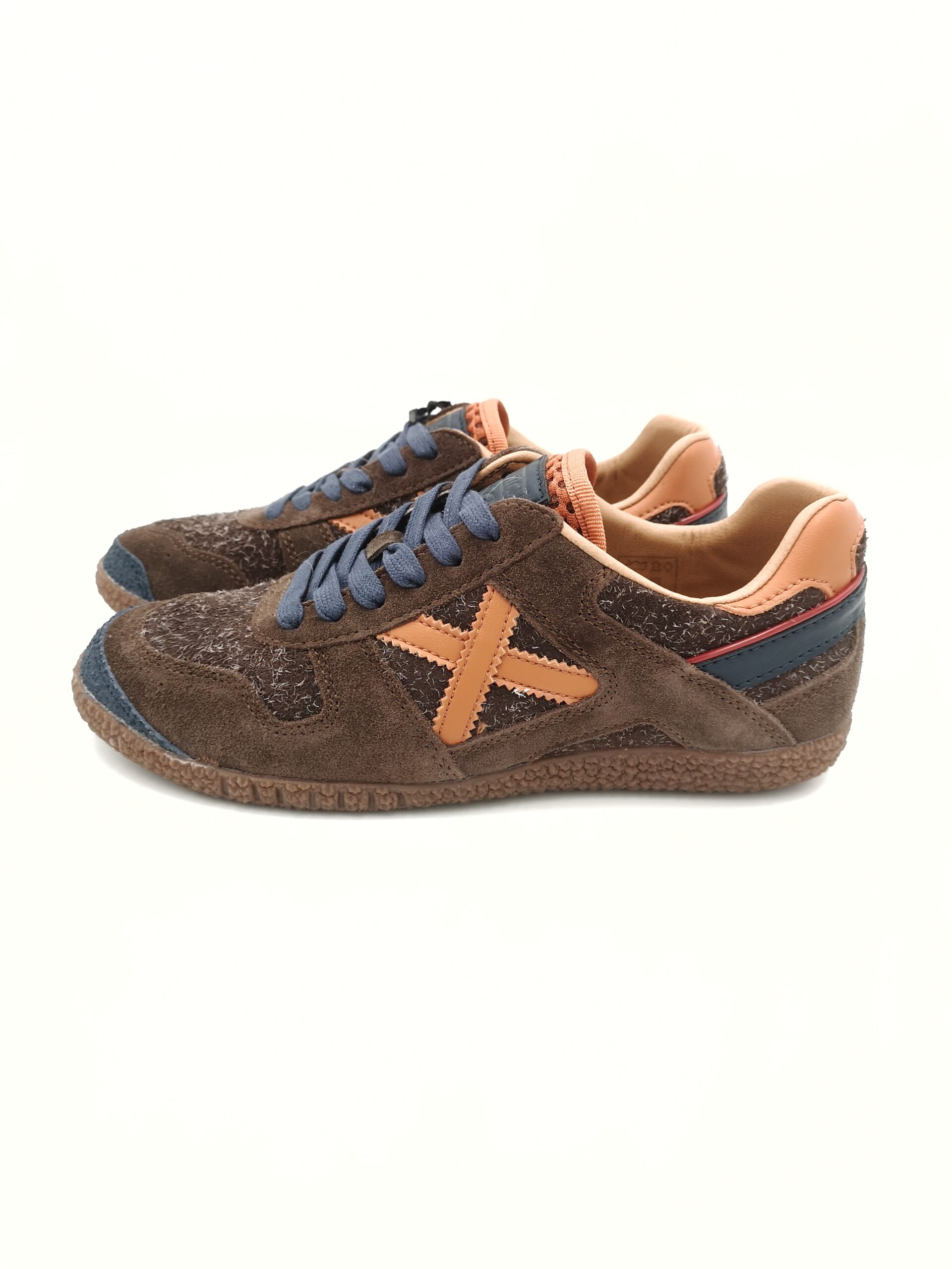 Zapatilla de cordon combinada en ante marron con teido al tono y detalles en naranja y azul. Piso caramelo. Modelo GOAL, clasico de MUNICH
