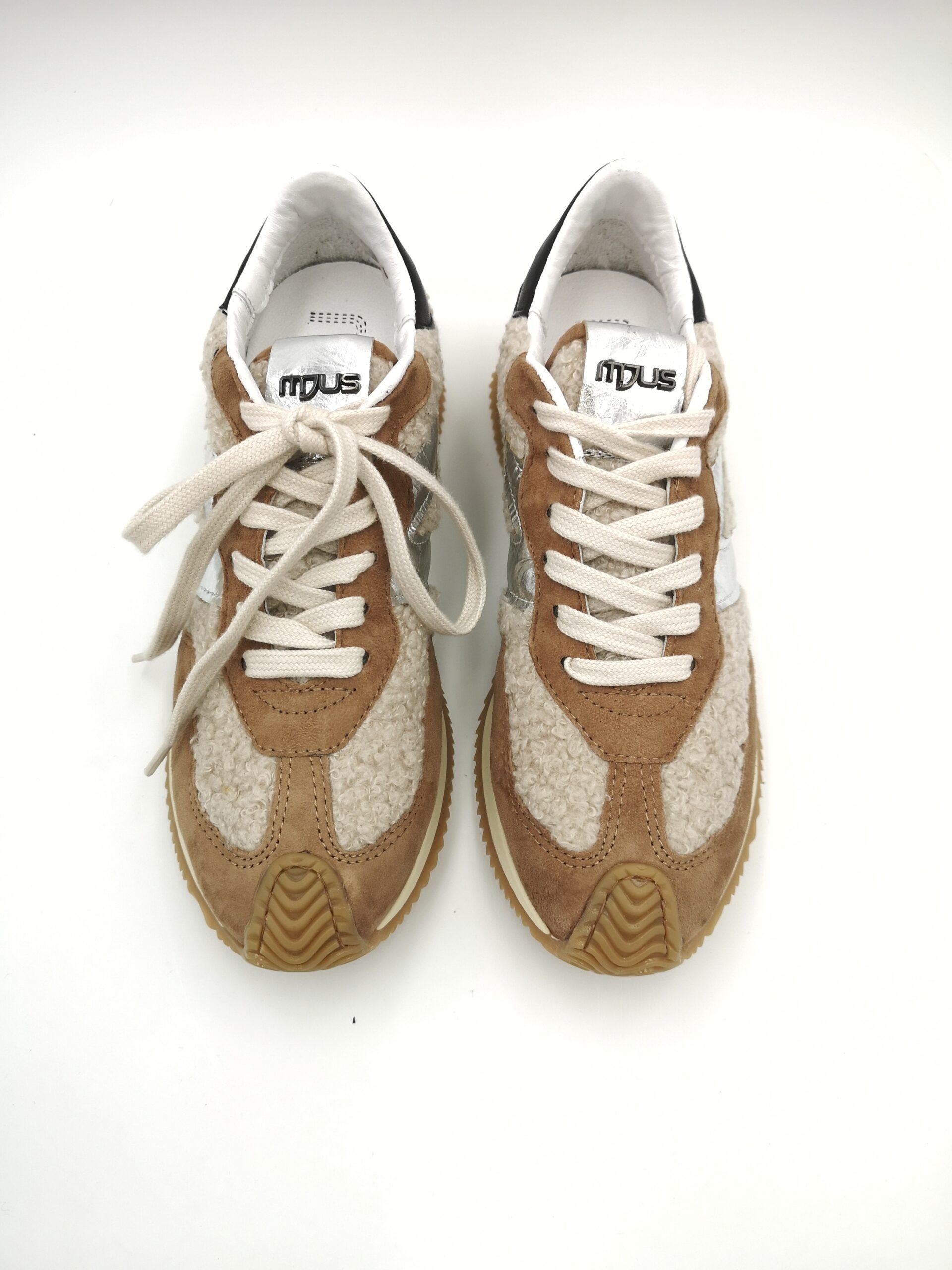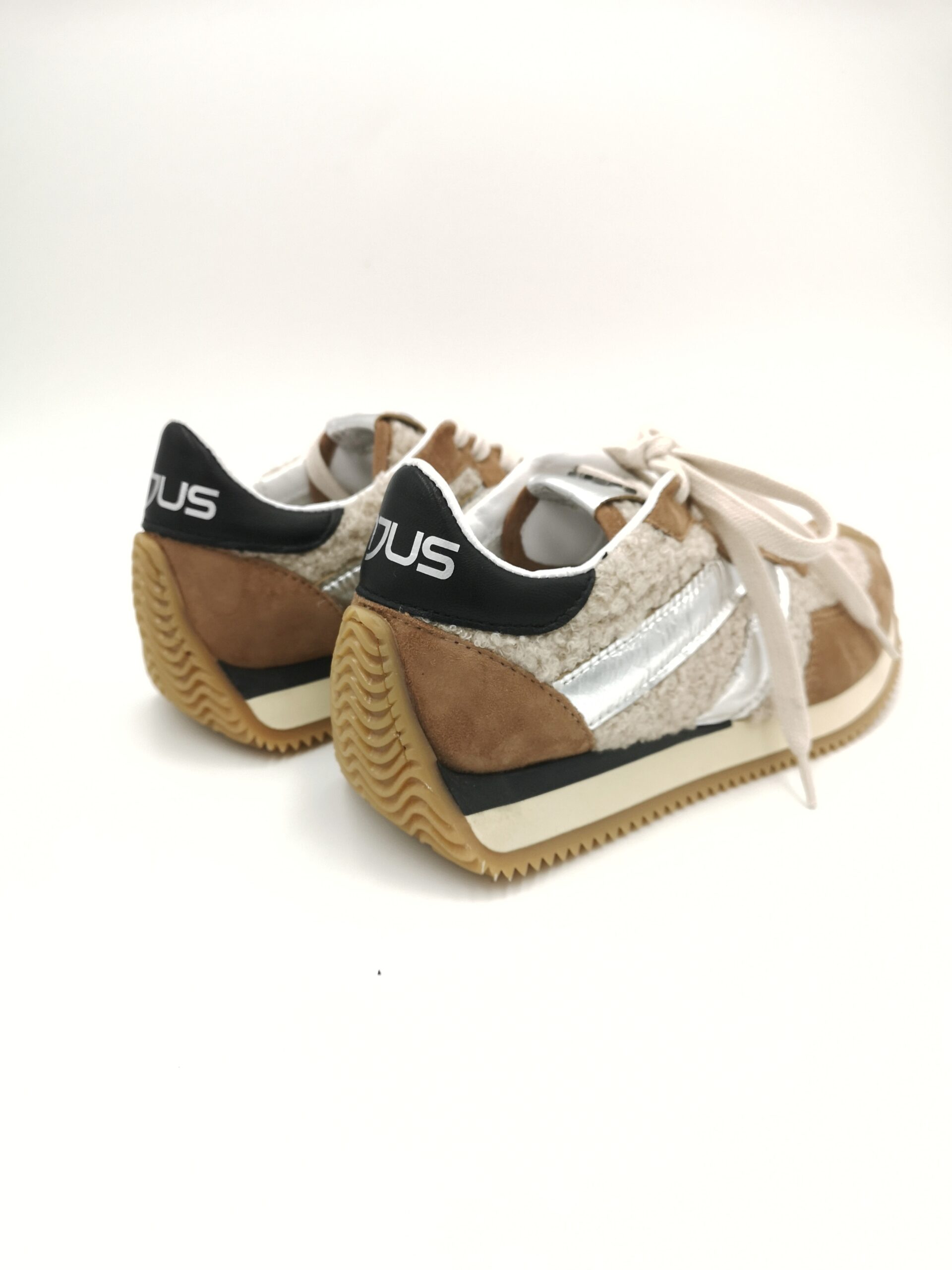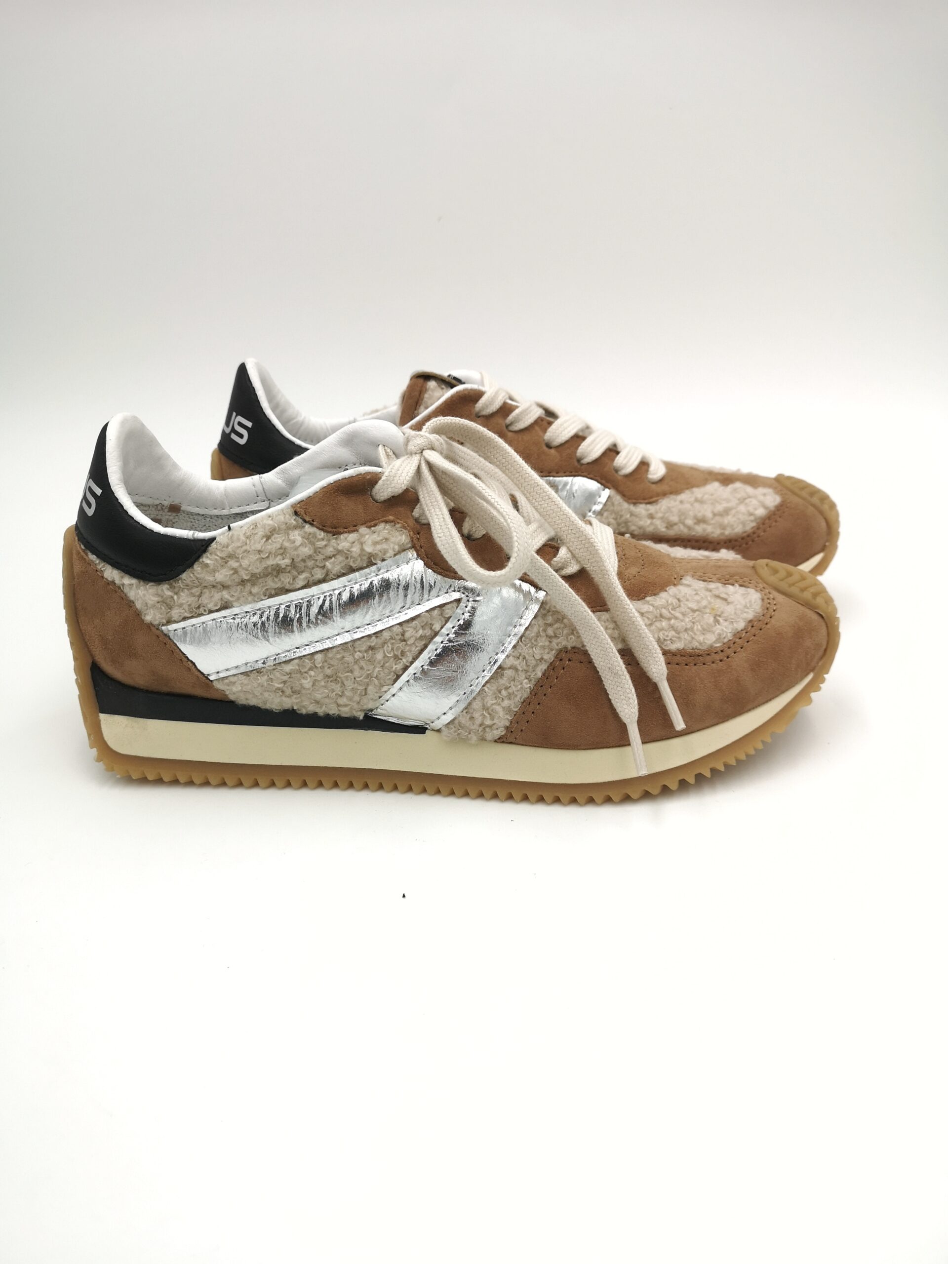 Zapatilla de cordon combinada en ante camel con piel plata y borreguito beige. Bonita y muy comoda!