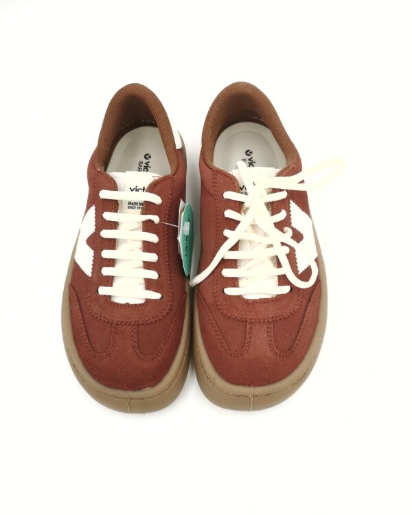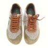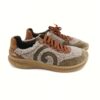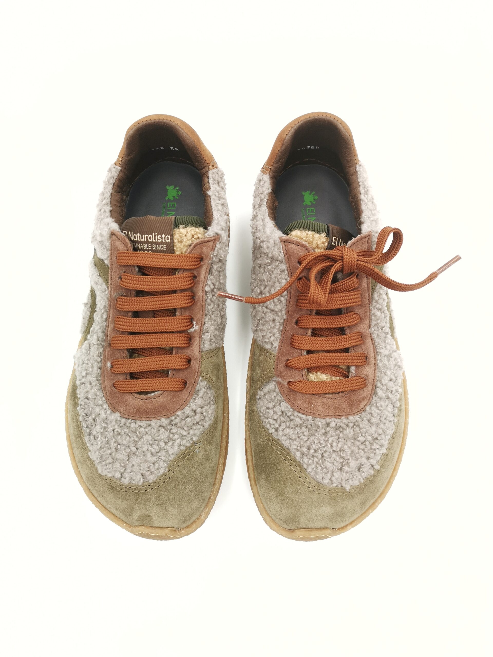 Zapatilla de cordon combinada en ante marron y verde con borreguito gris. Modelo BAREFOOT. Piso caramelo muy ligero y flexible.