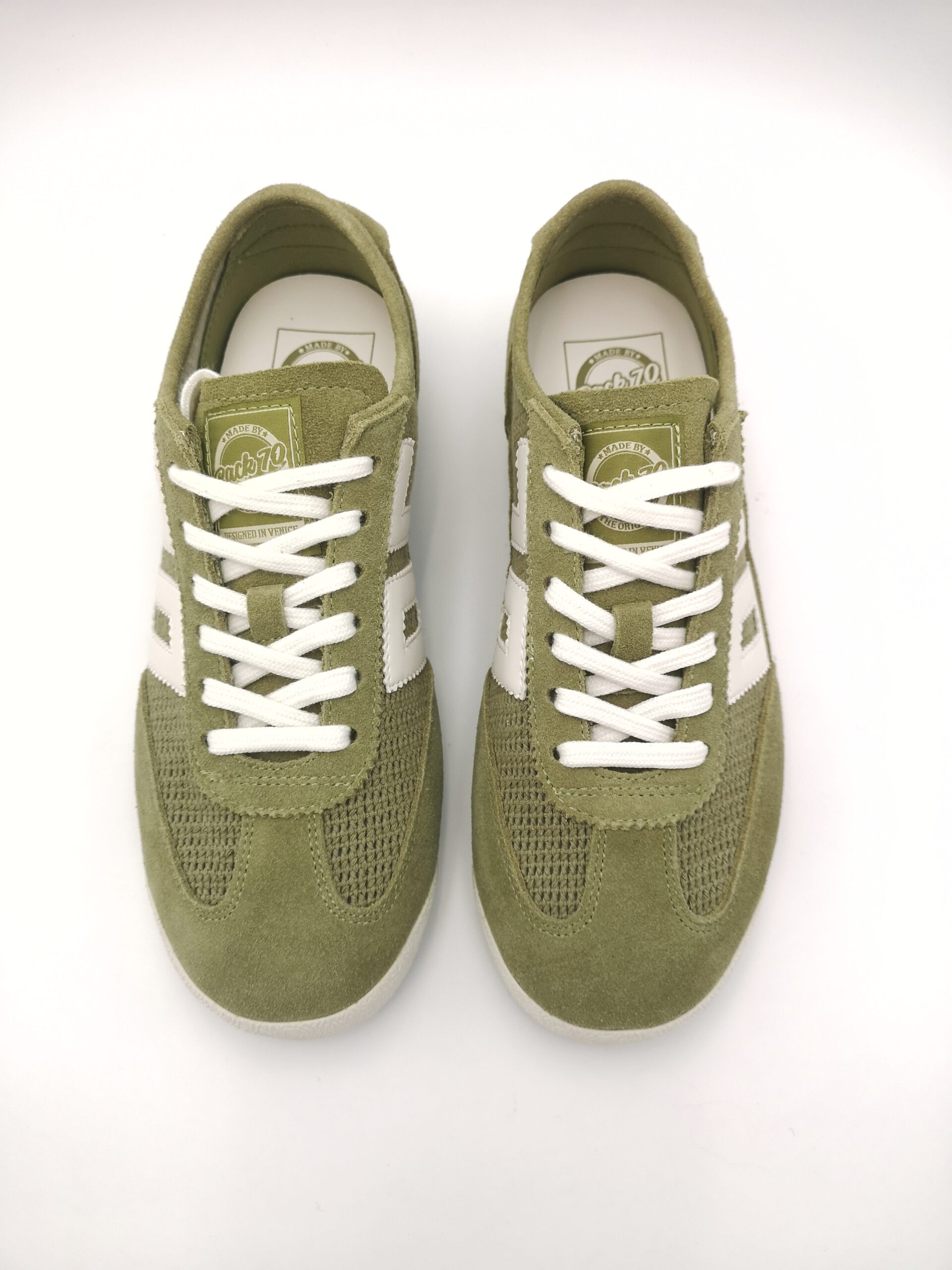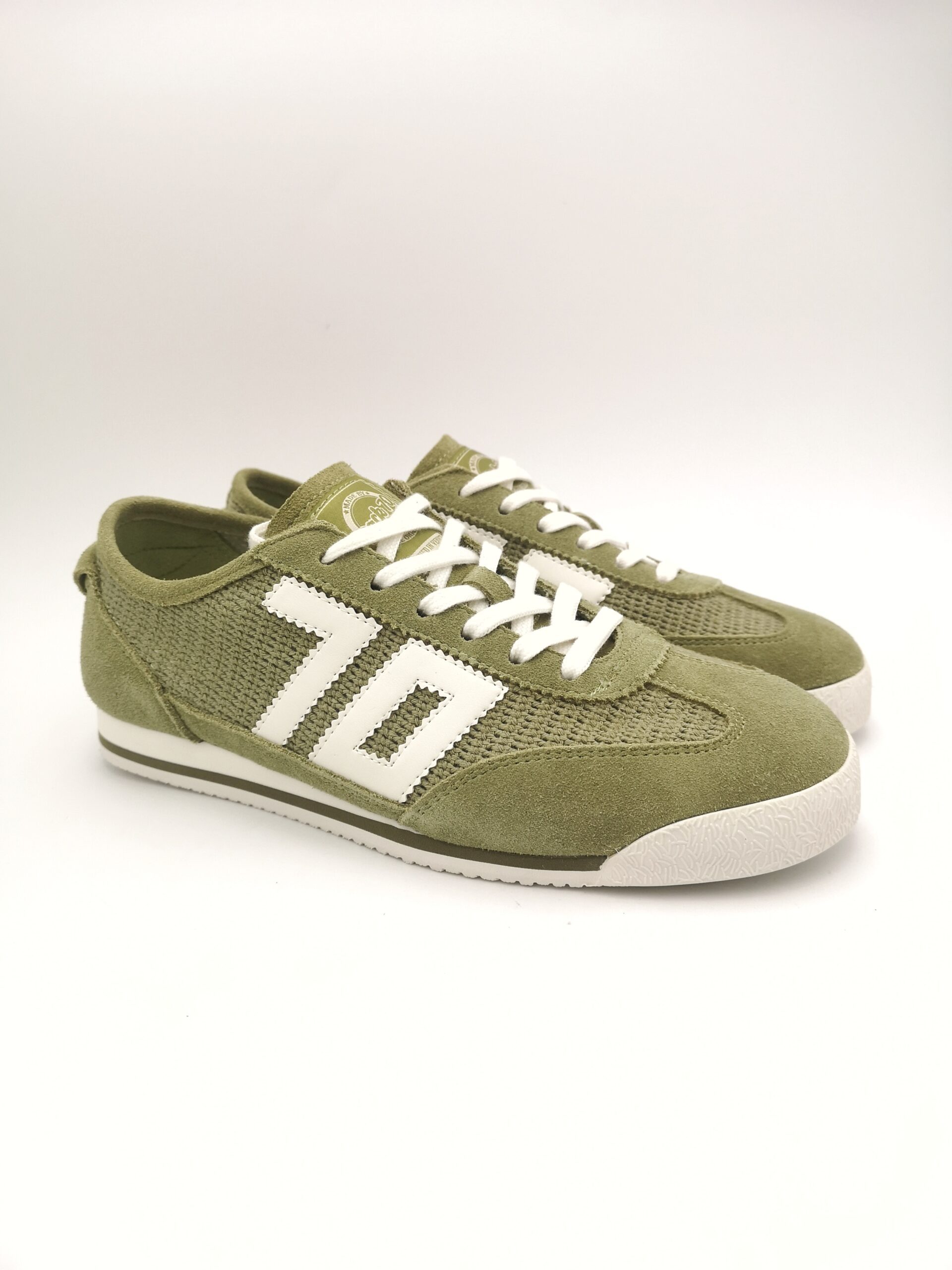 Zapatilla de cordón combinada en ante y rejilla color oliva. Ligera, fresca y cómoda.