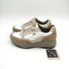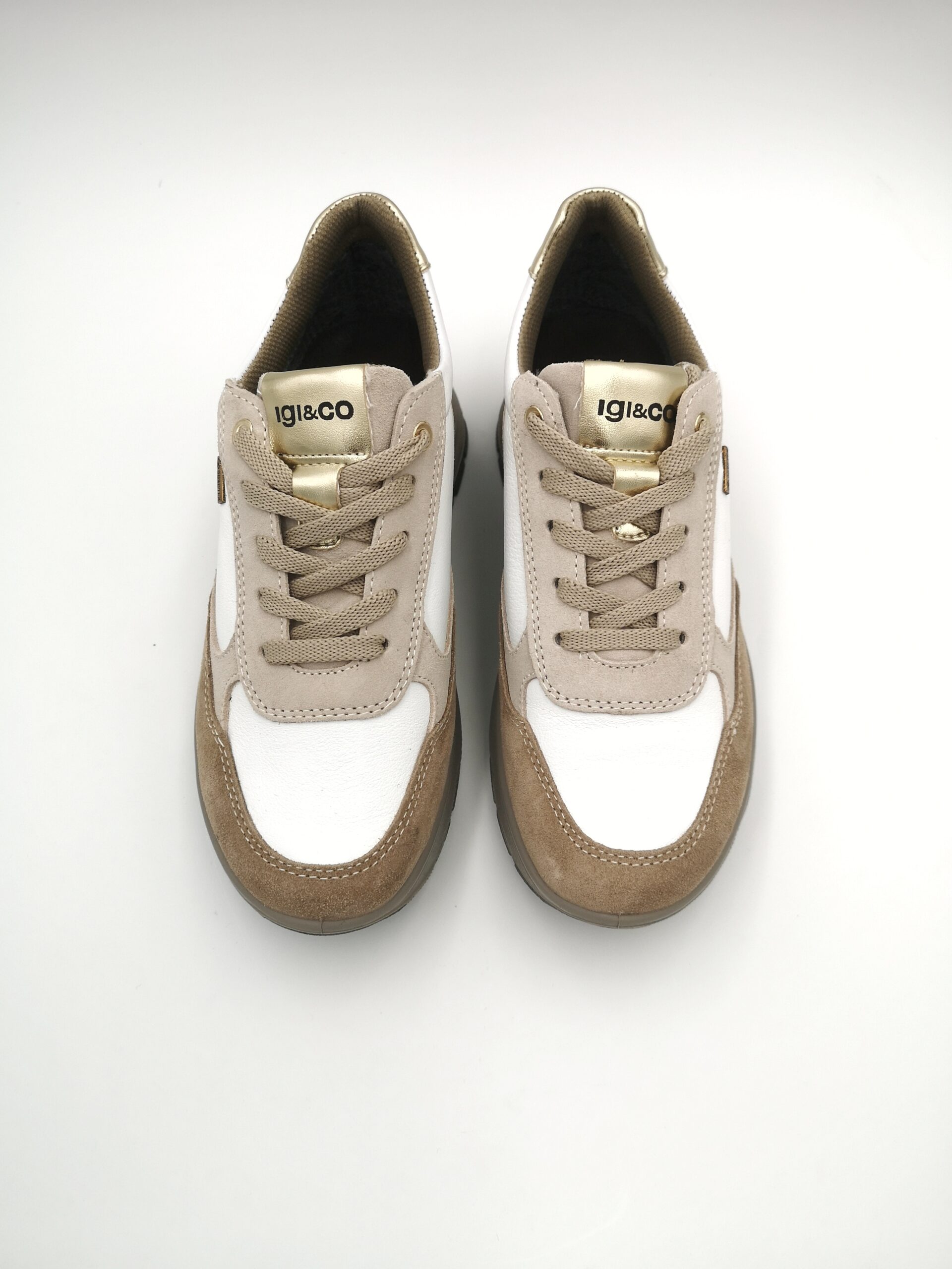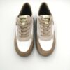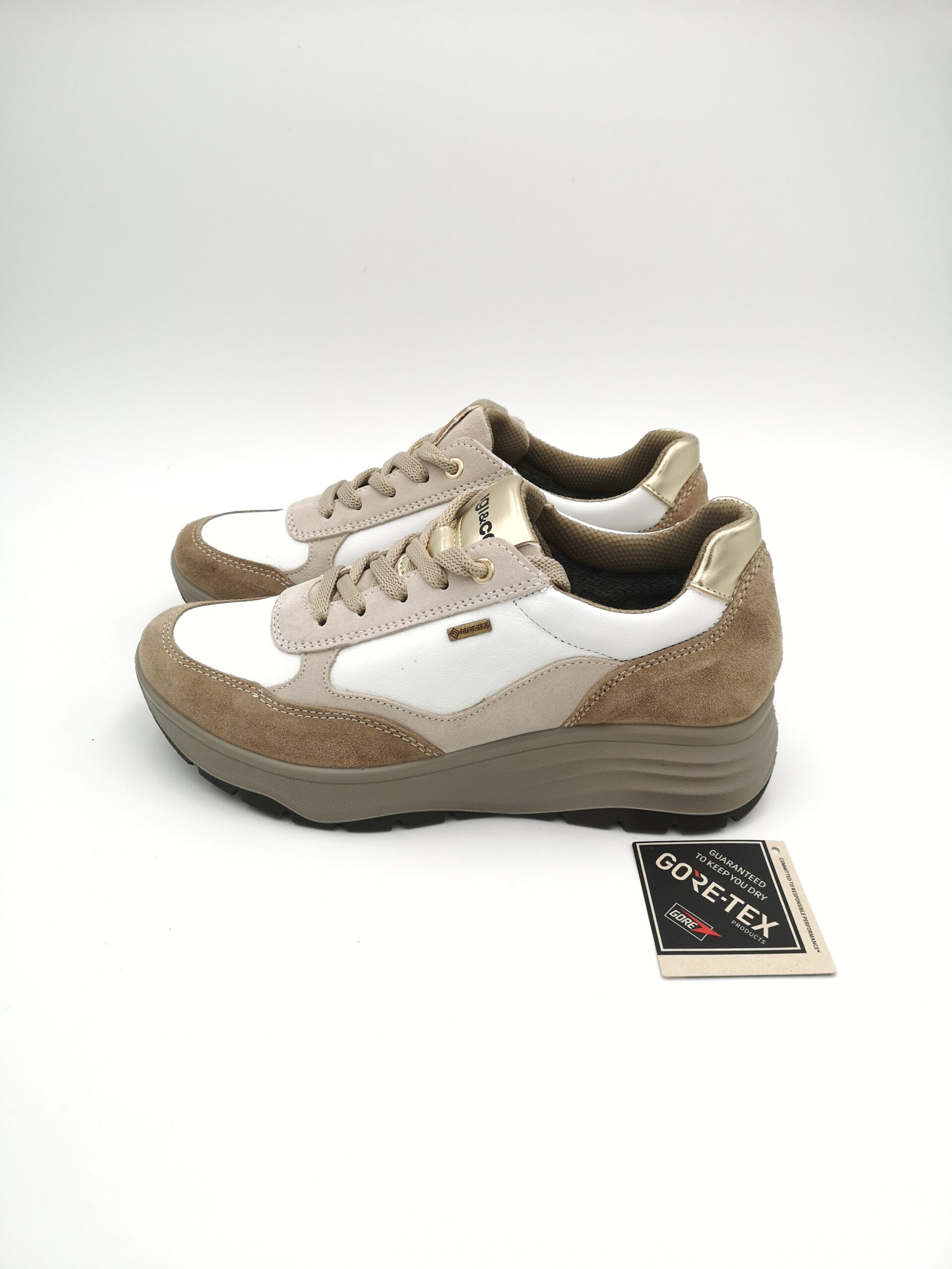 Zapatilla cordon combinada piel blanca y ante camel. GORETEX. Piso con volumen ligero.