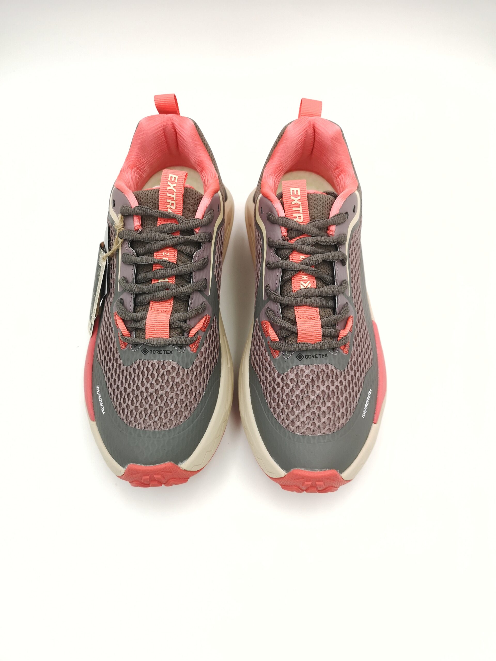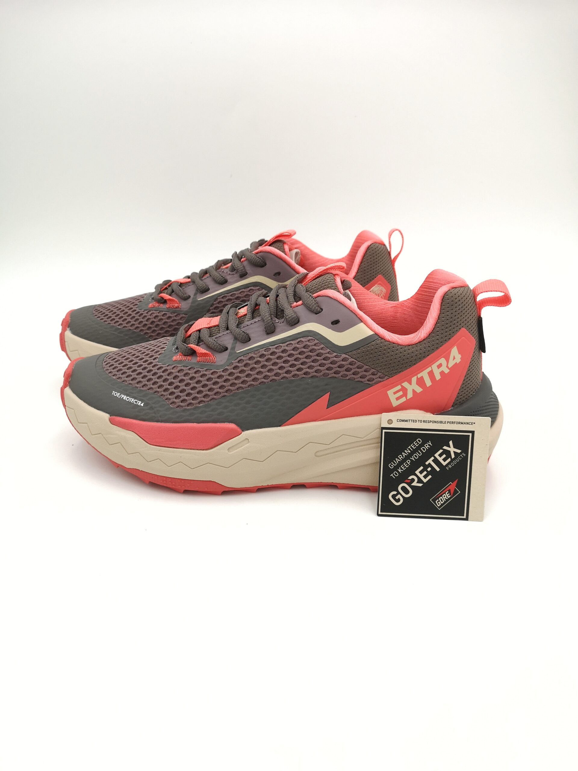 Zapatilla de cordon combinada gris y coral. GORETEX. Ligera y muy confortable. Piso Phylon antideslizante con volumen.