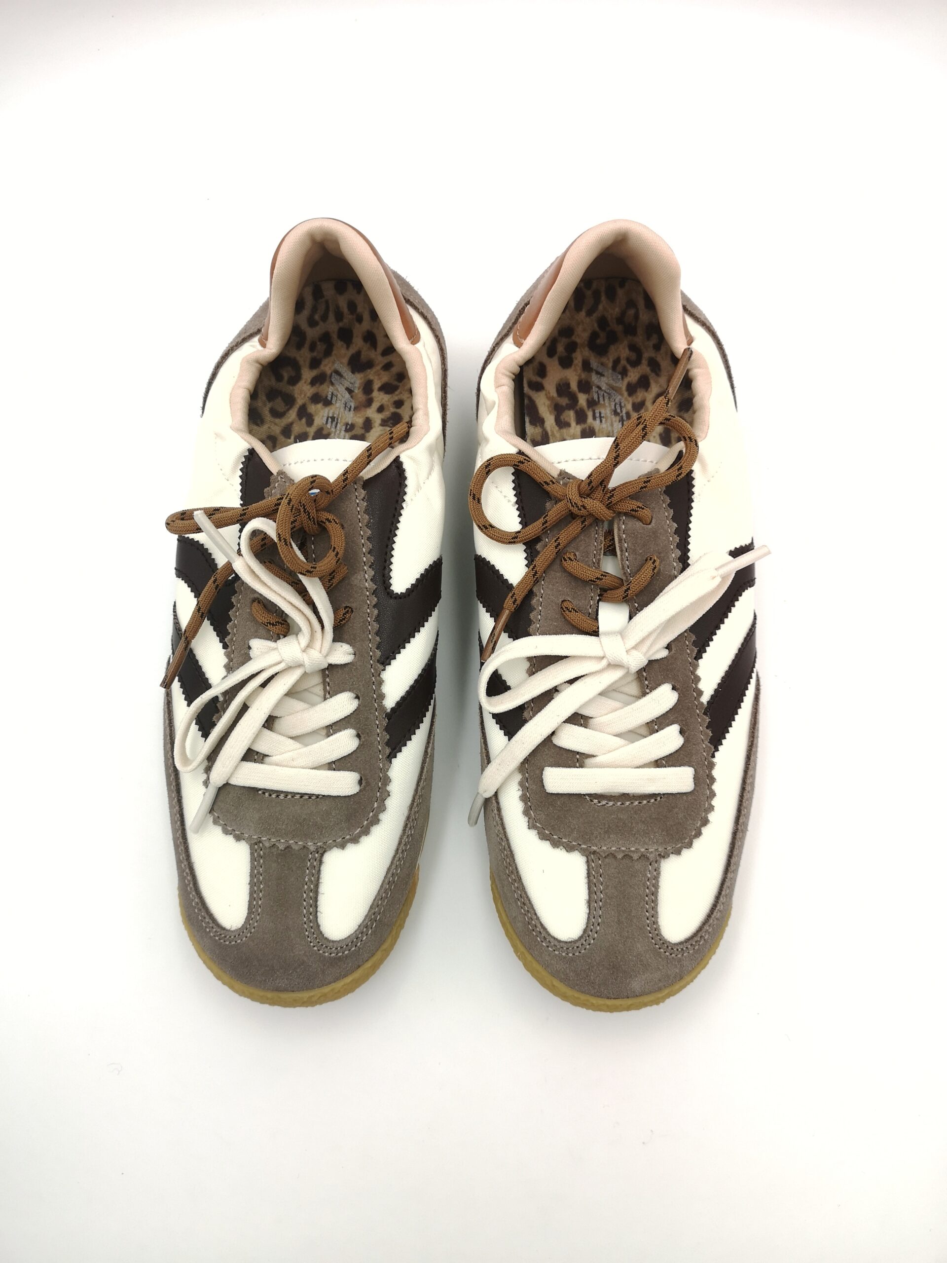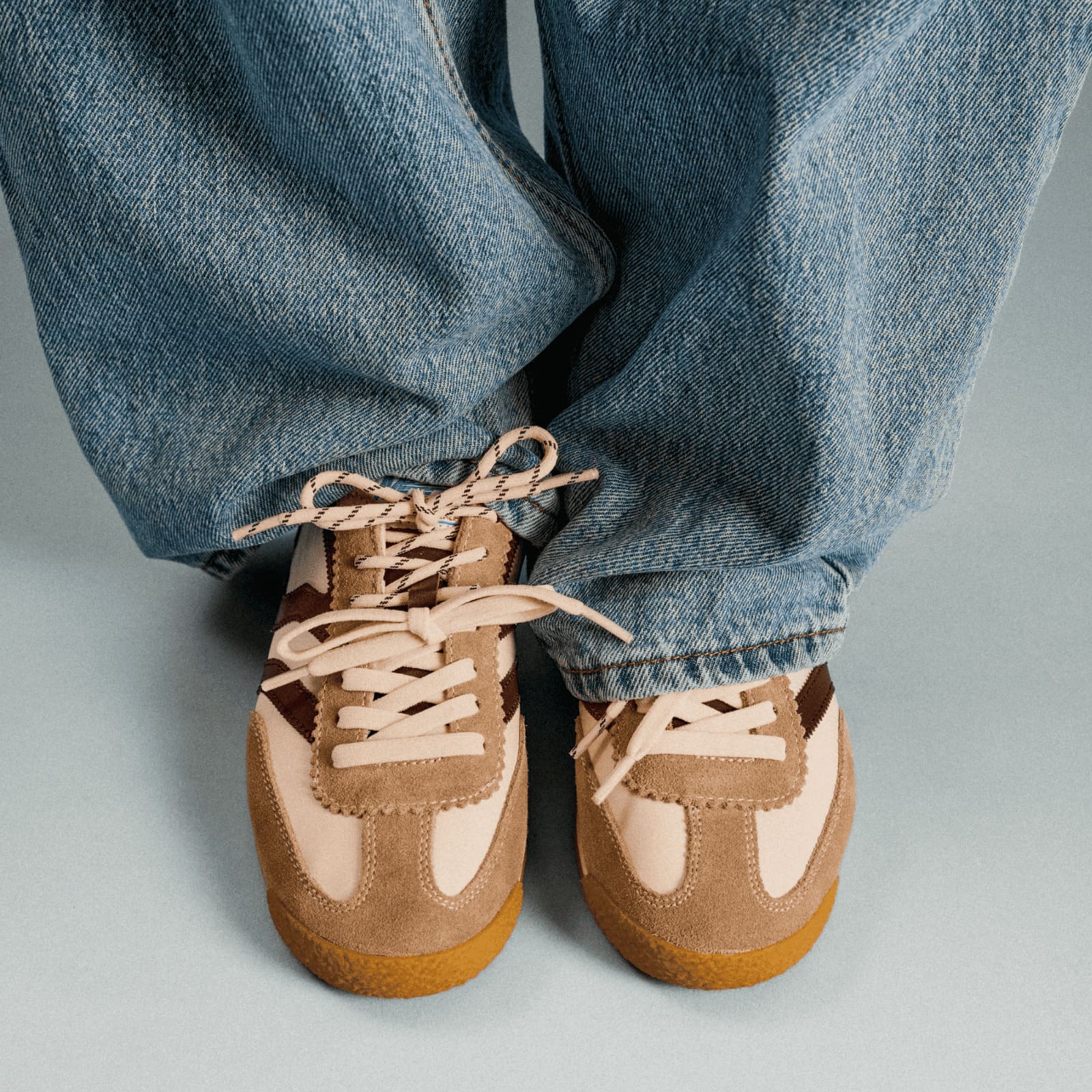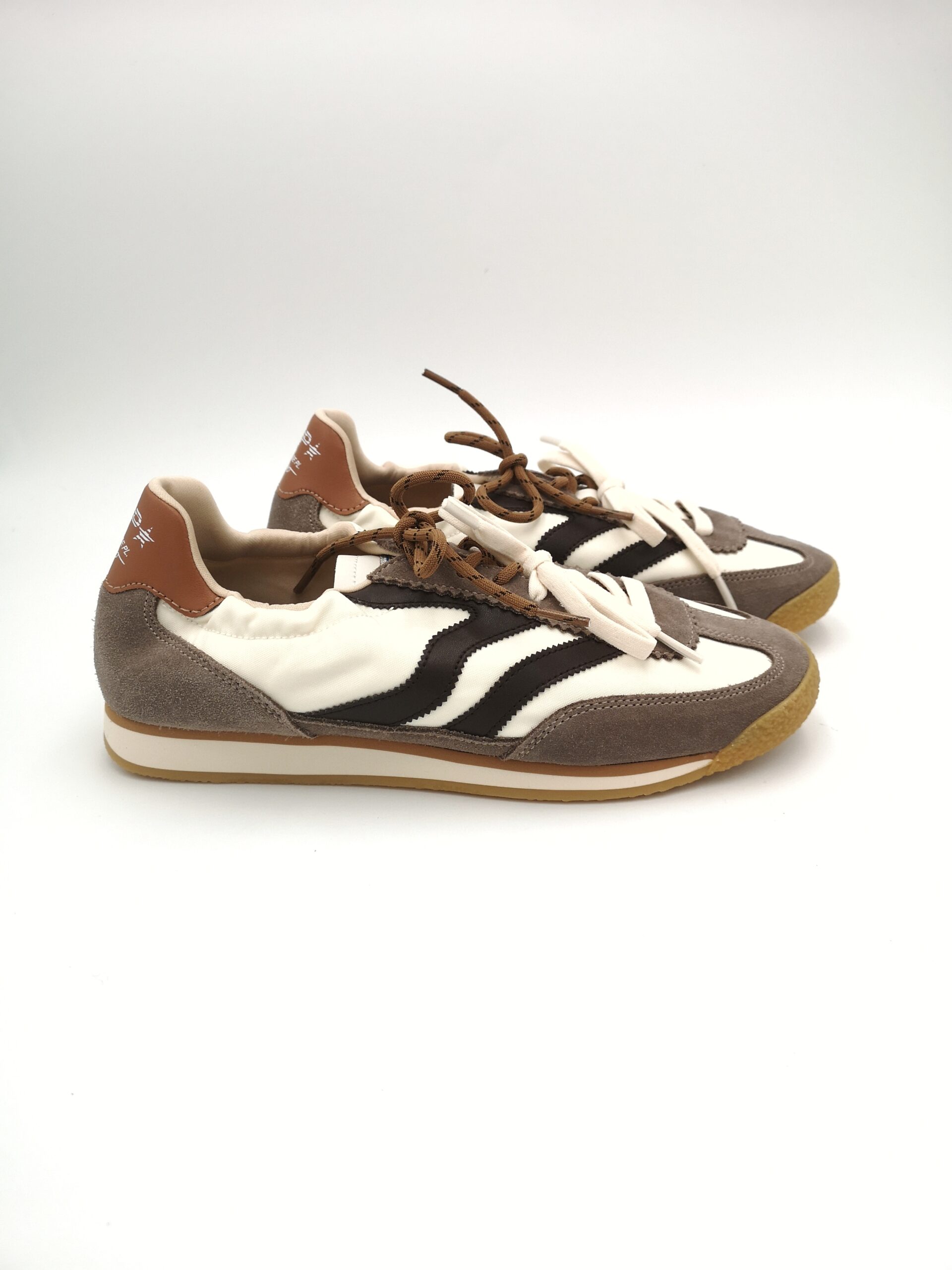 Las zapatillas combinadas en nylon blanco y ante beige son la opción perfecta para quienes buscan un estilo casual, versátil y cómodo para el día a día. Su diseño en tonos neutros con detalles en marrón las convierte en un básico fácil de combinar con cualquier look.