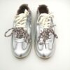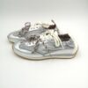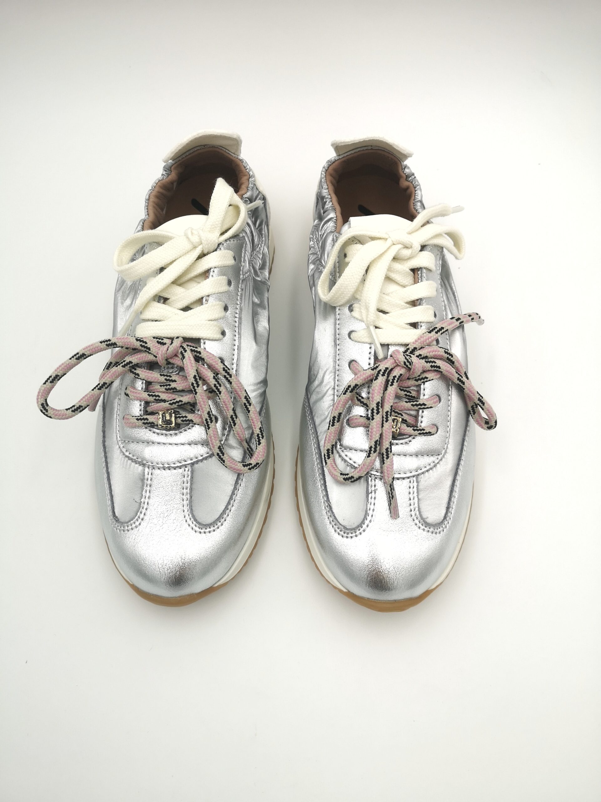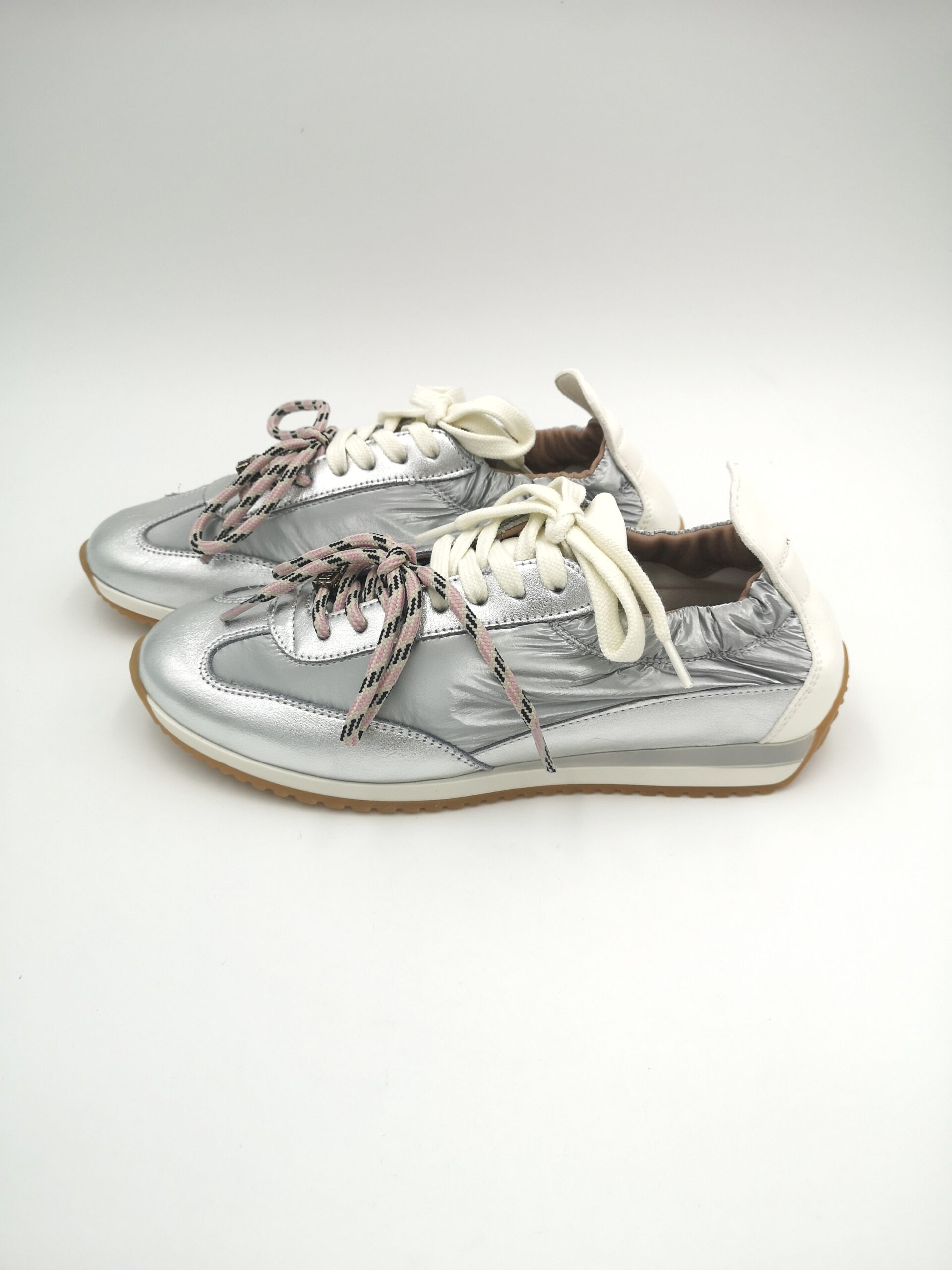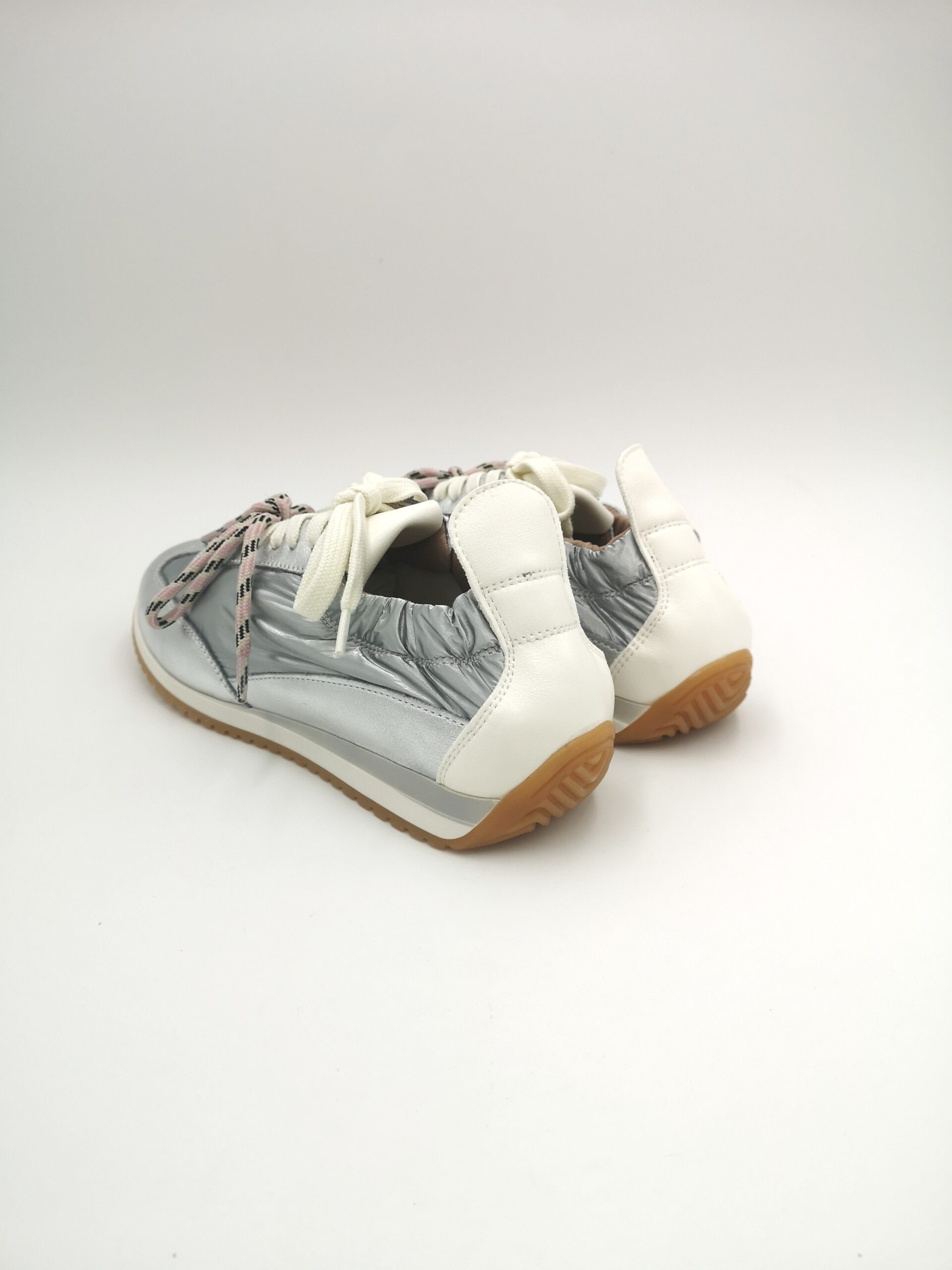 Zapatilla doble cordón combinada piel y nylon plata con trasera blanca. Fina, actual y sobre todo cómoda.