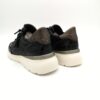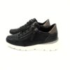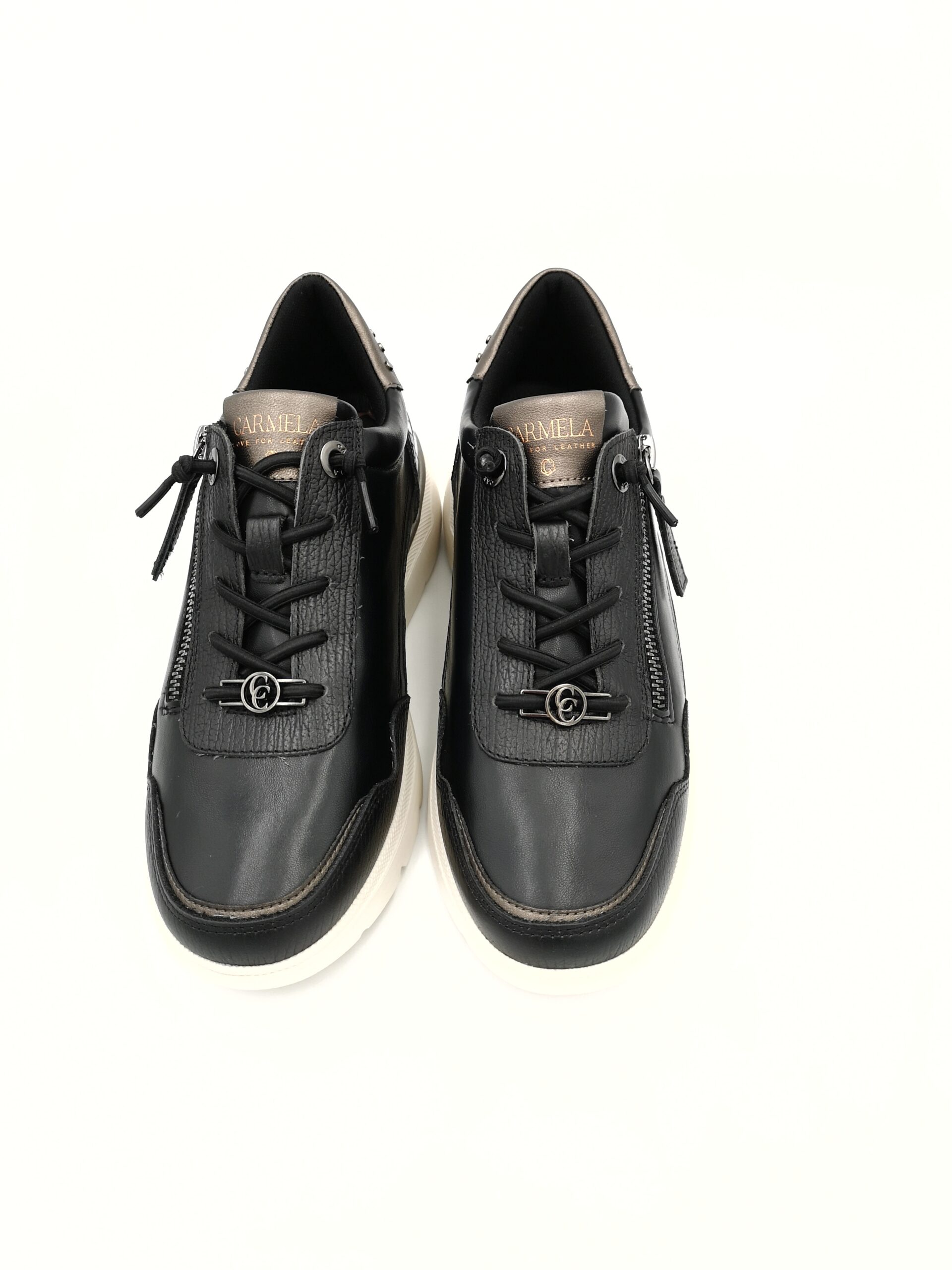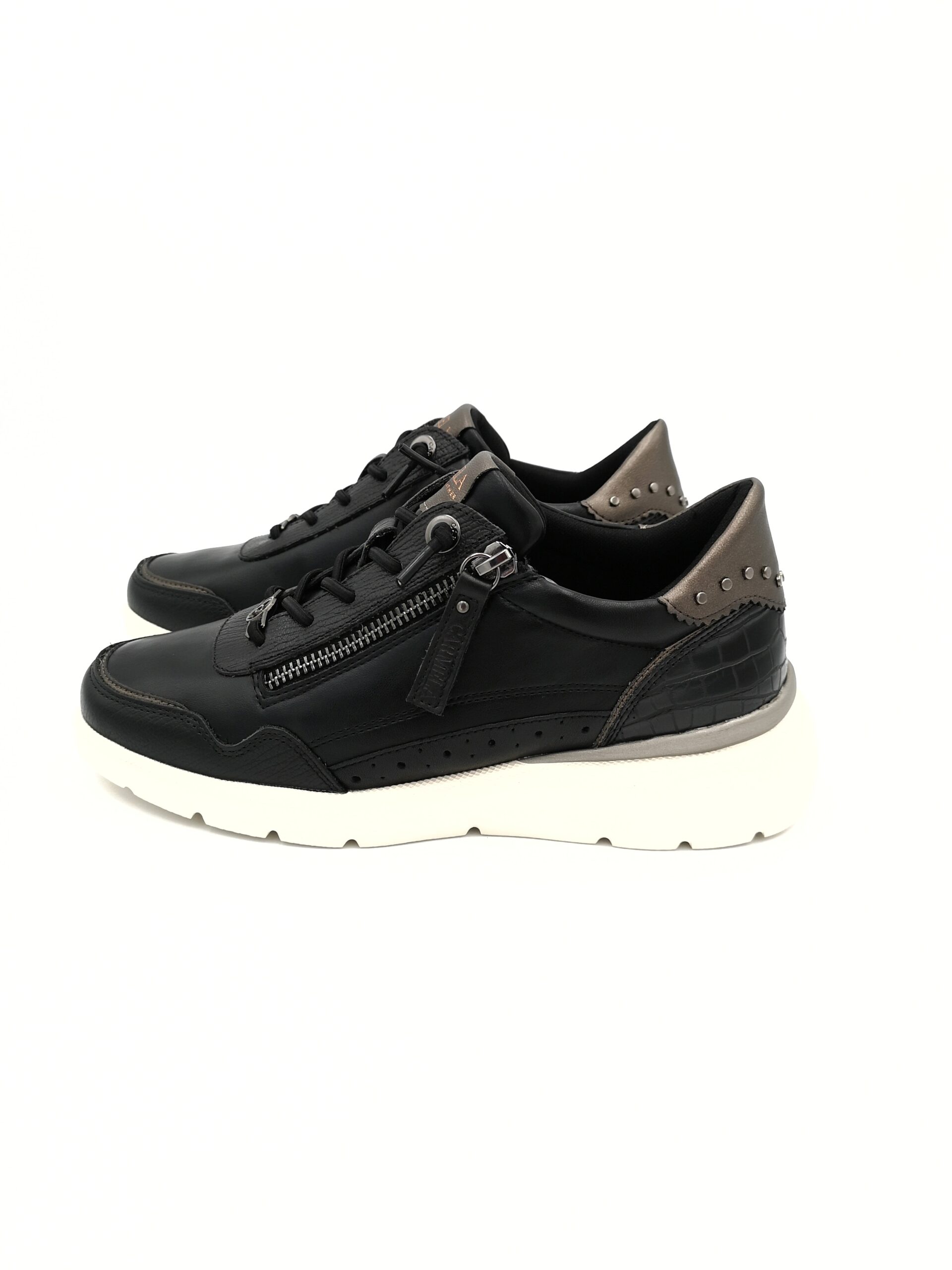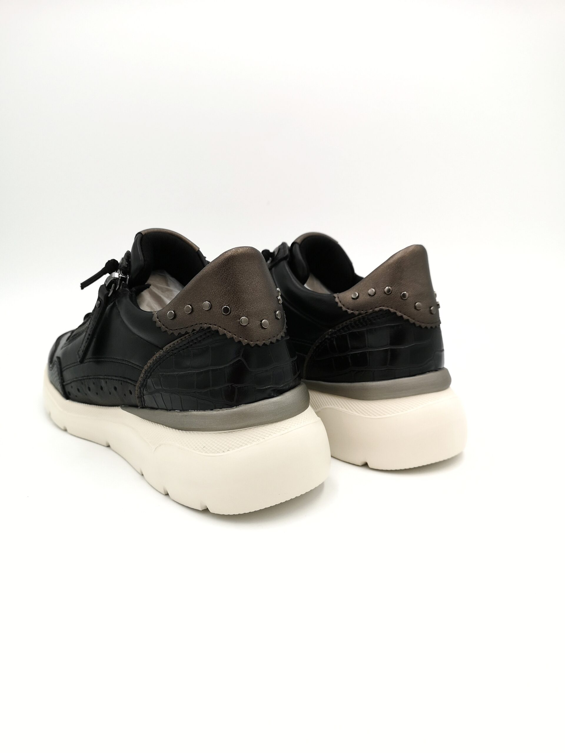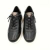 Zapatilla de piel color negro con cordon elastico y cremnallera lateral. Piso ligero en cuña de 3 cms.