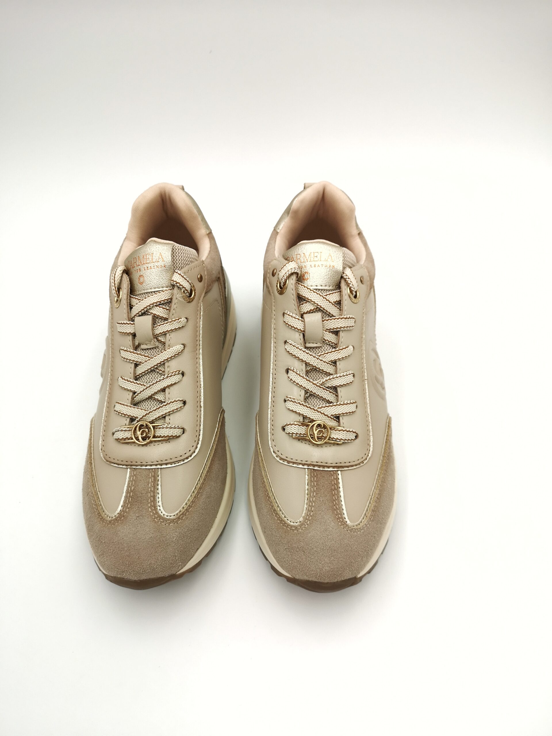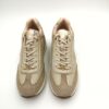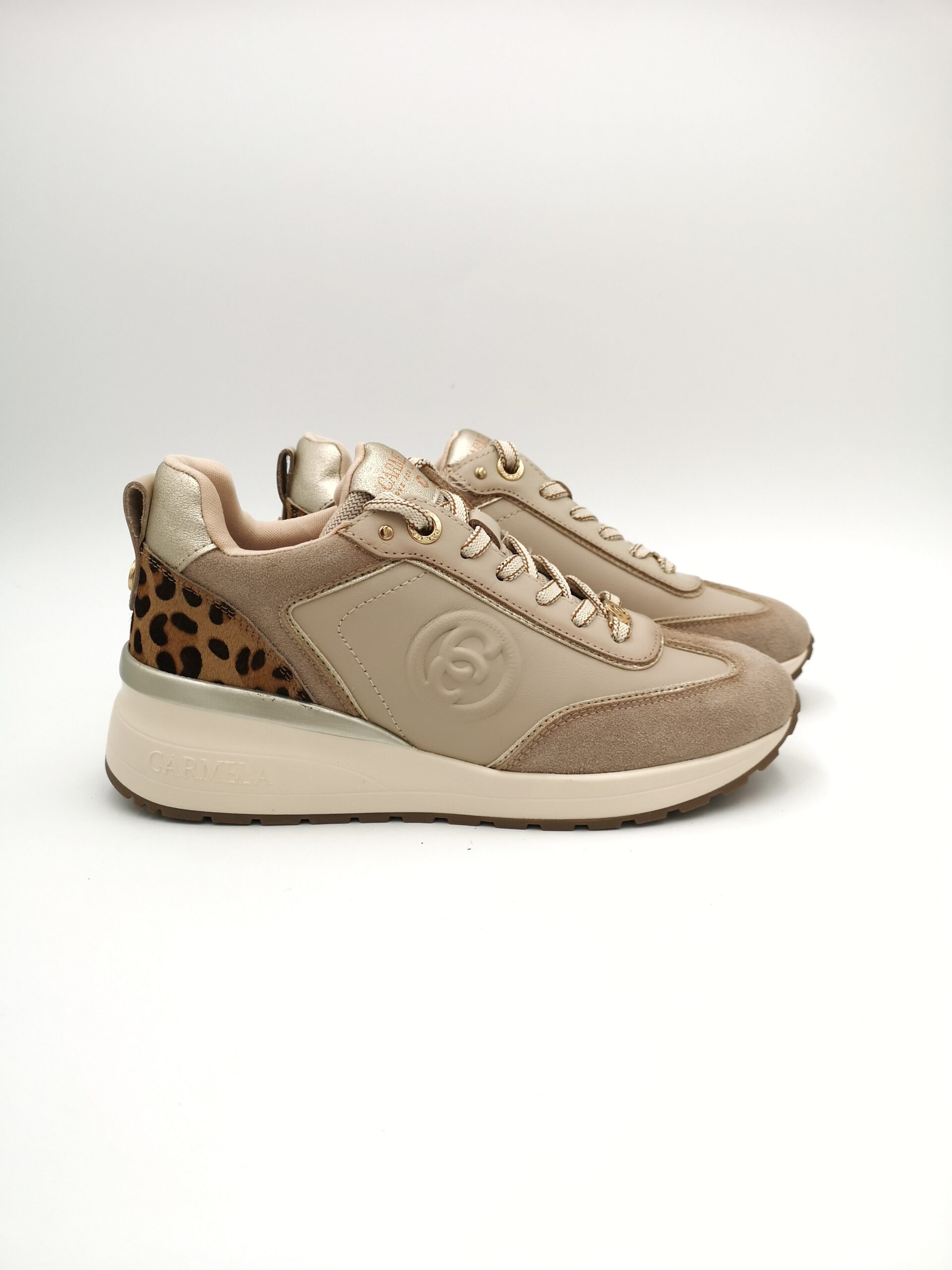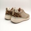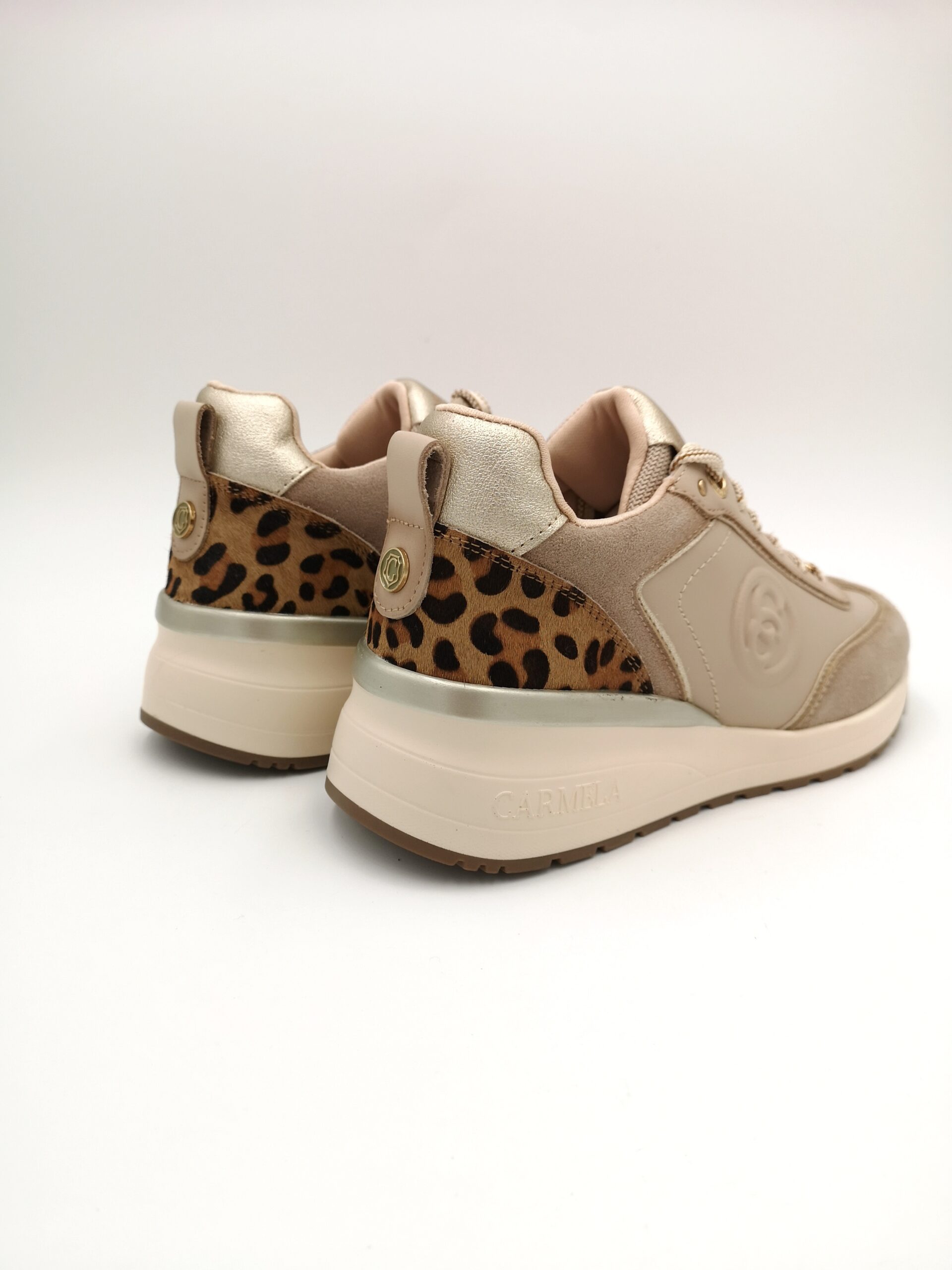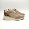 Zapatilla de cordon en piel color crema combinada con ante beige y detalles print animal. Piso en cuña de 3 cms.