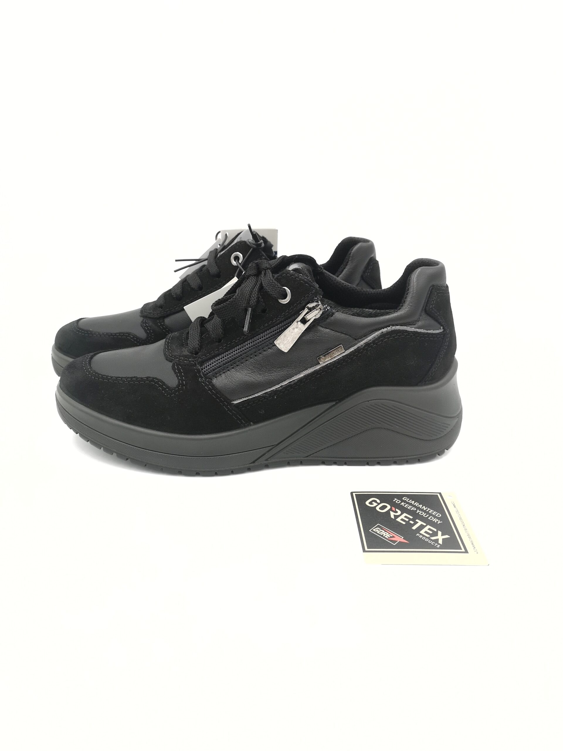 Zapatilla combinada piel y ante cordon y cremallera. GORETEX. Piso en cuña de goma.