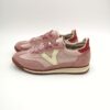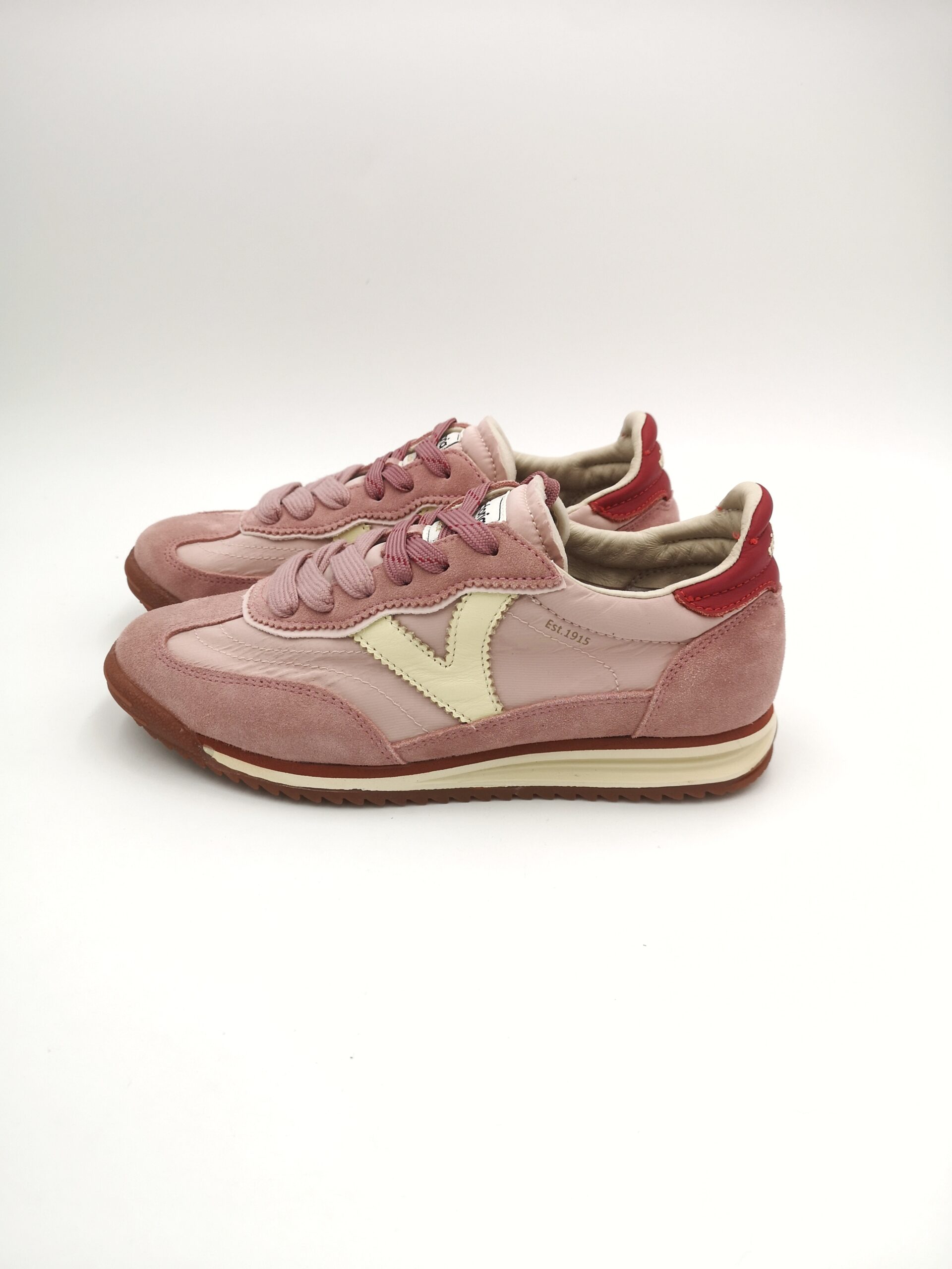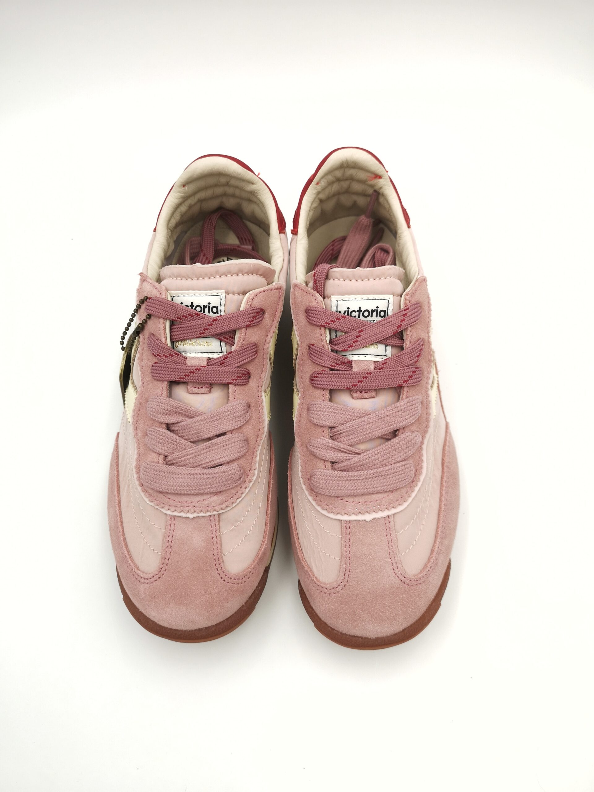 Zapatilla de cordon combinada ante y nylon en rosasy guinda. Doble cordon.