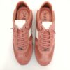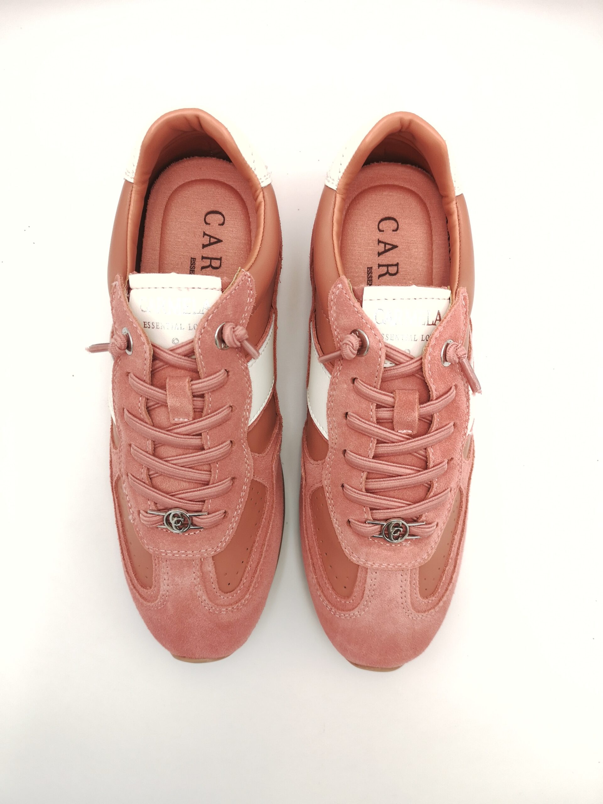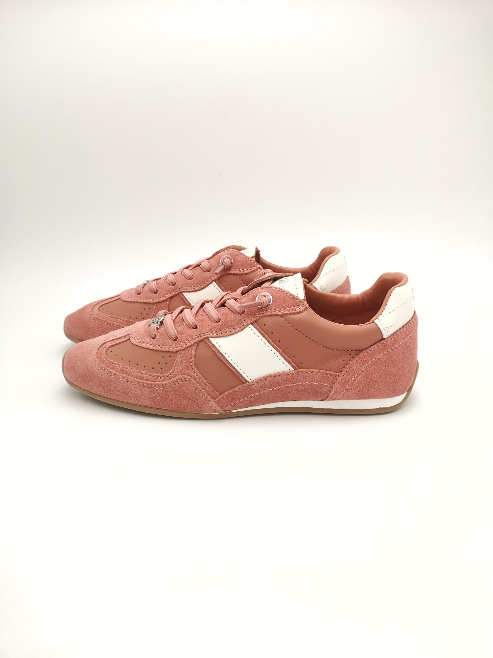 Zapatilla de piel color coral con cordón elástico. Piso bajo con plantilla acolchada. Flexible y cómoda.