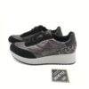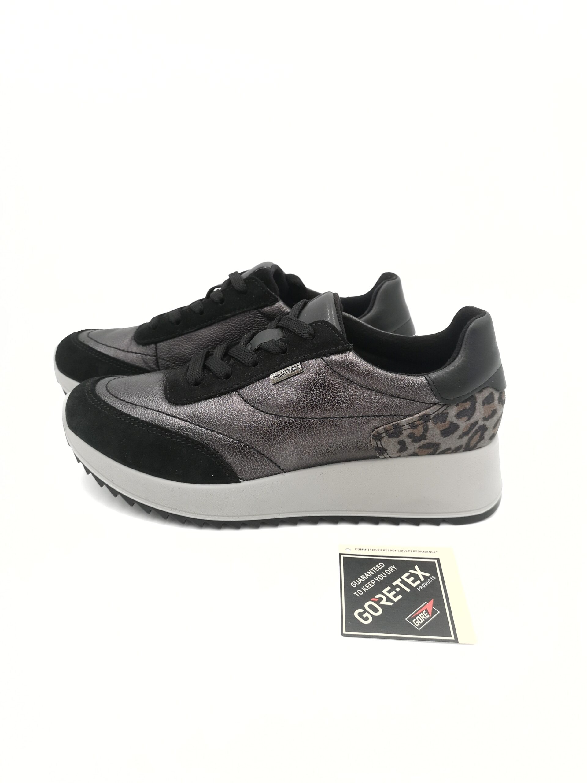Zapato deportivo de cordon combinado piel gris metalizada con detalles print leopardo y ante negro. Piso con cuña muy ligero.