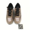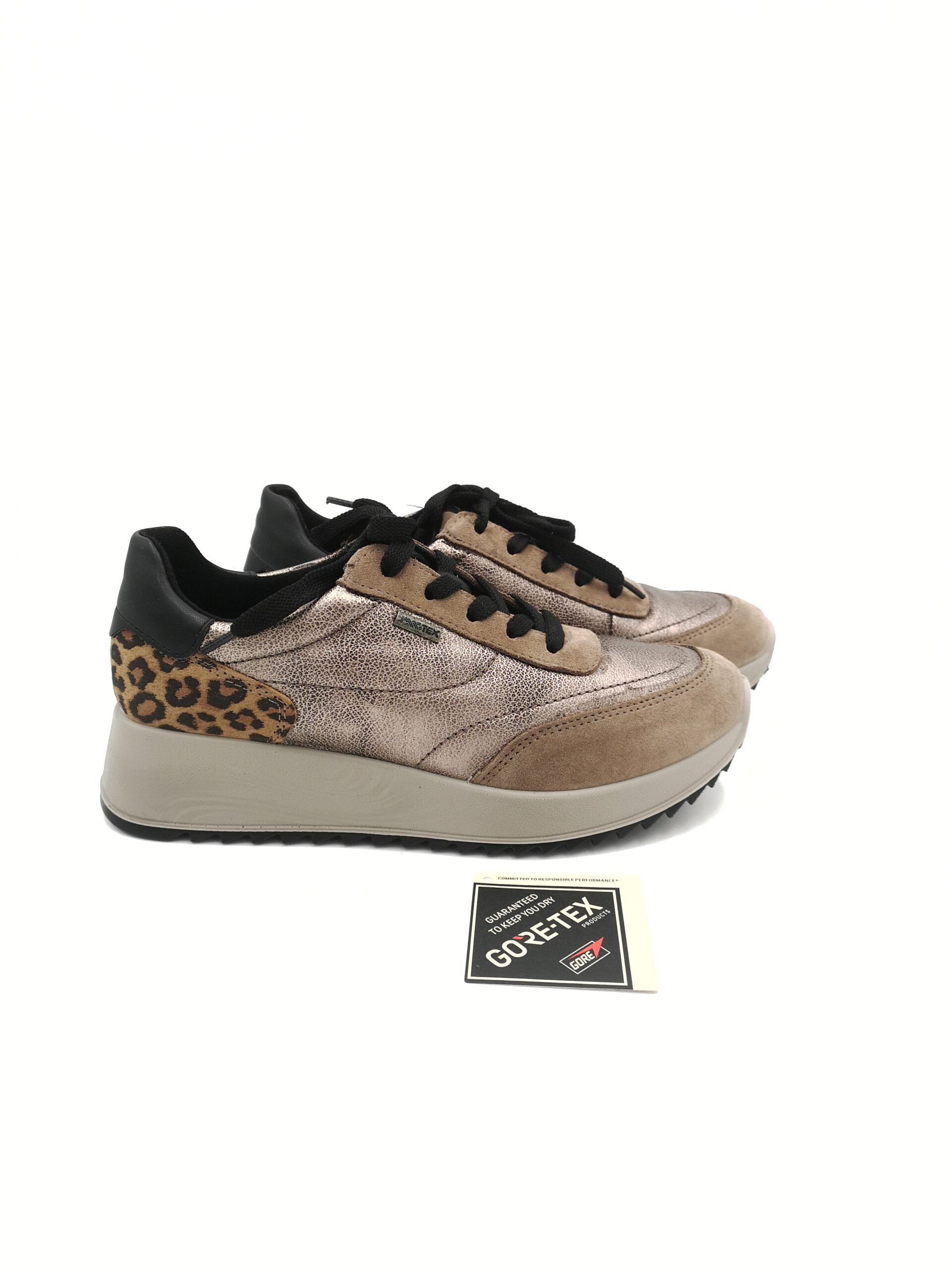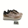 Zapato deportivo de cordon combinado piel beige metalizada con detalles print leopardo y ante beige. Detalles en negro. Piso con cuña muy ligero