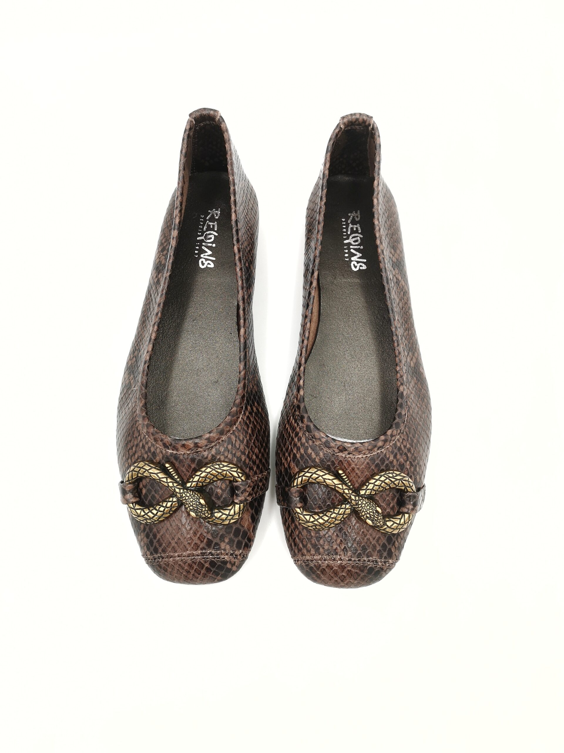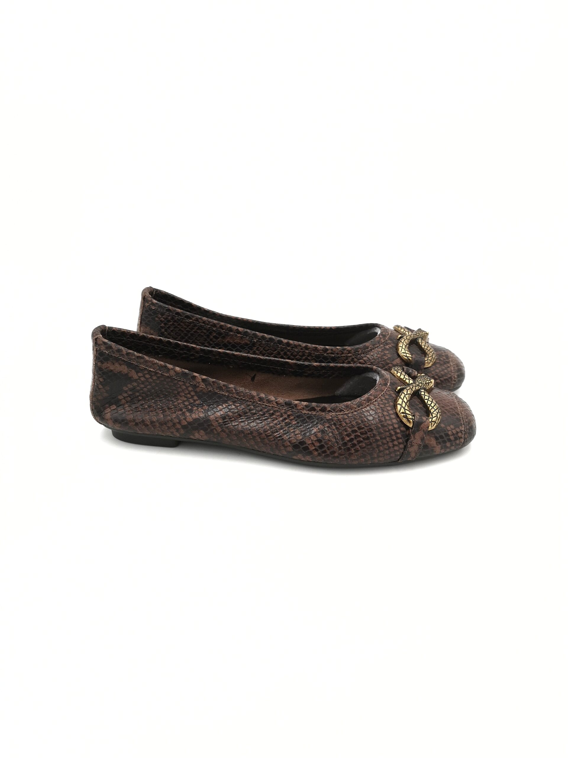 Parisina de piel serpiente marron con adorno bronce. Piso de goma fino. Blandita, comoda y ajusta muy bien.