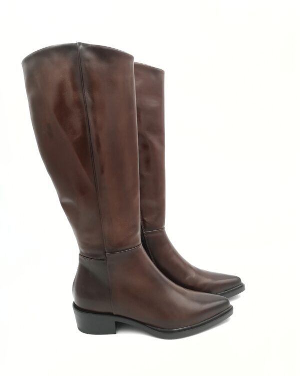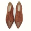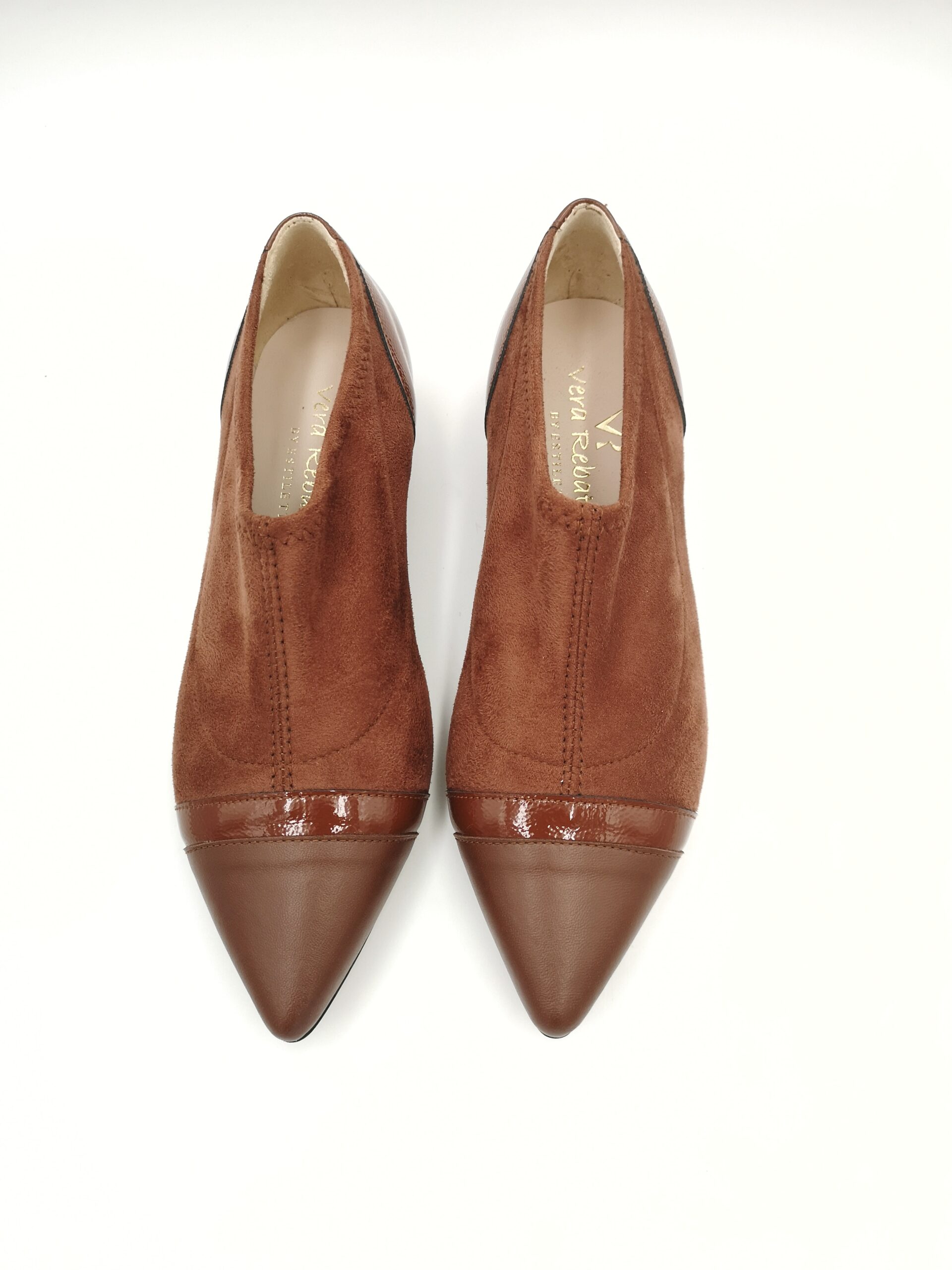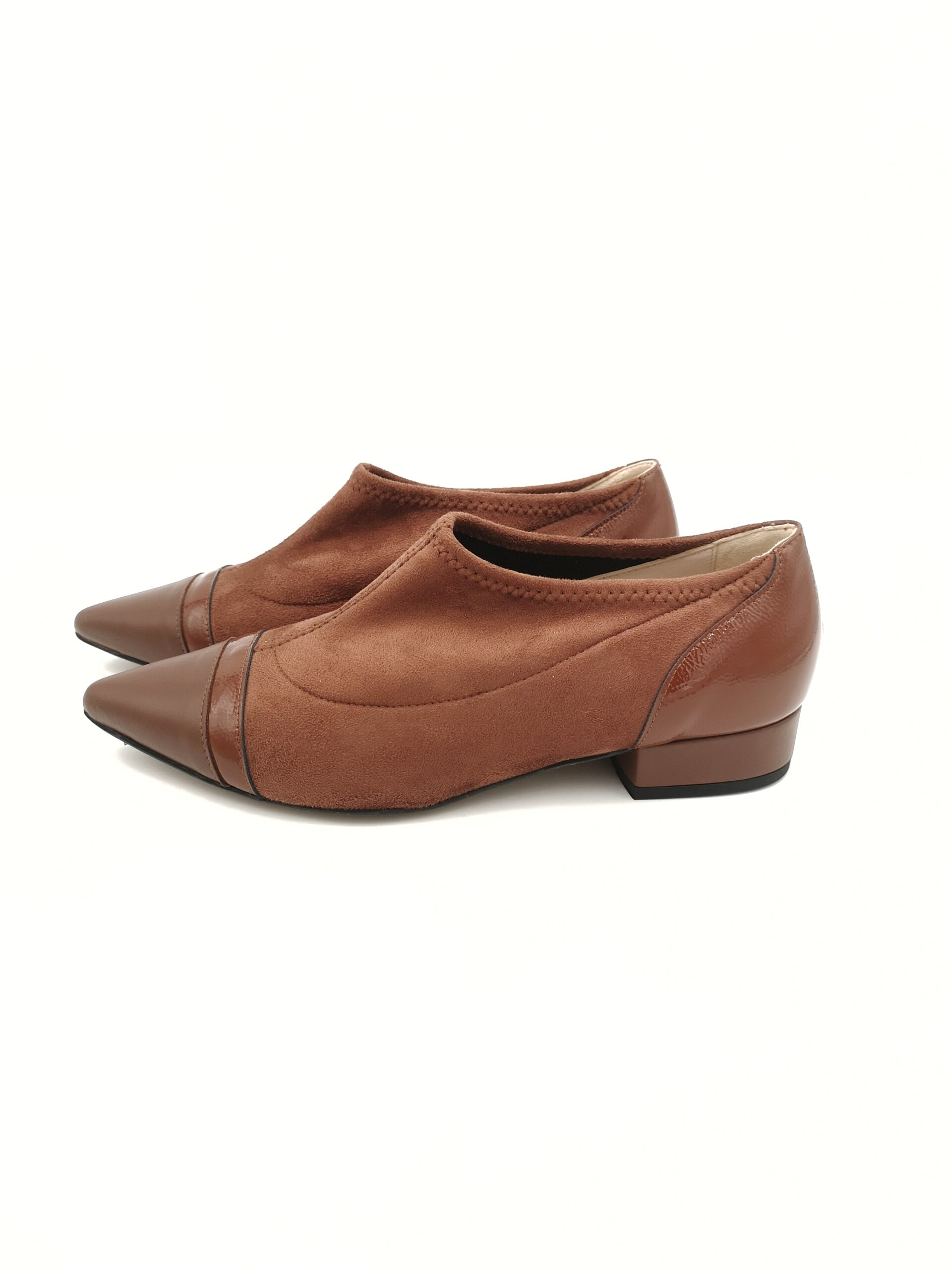 Zapato combinado ante elastico y charol en color coñac. Tacon de 2 cms forrado al tono. Fino y comodo.