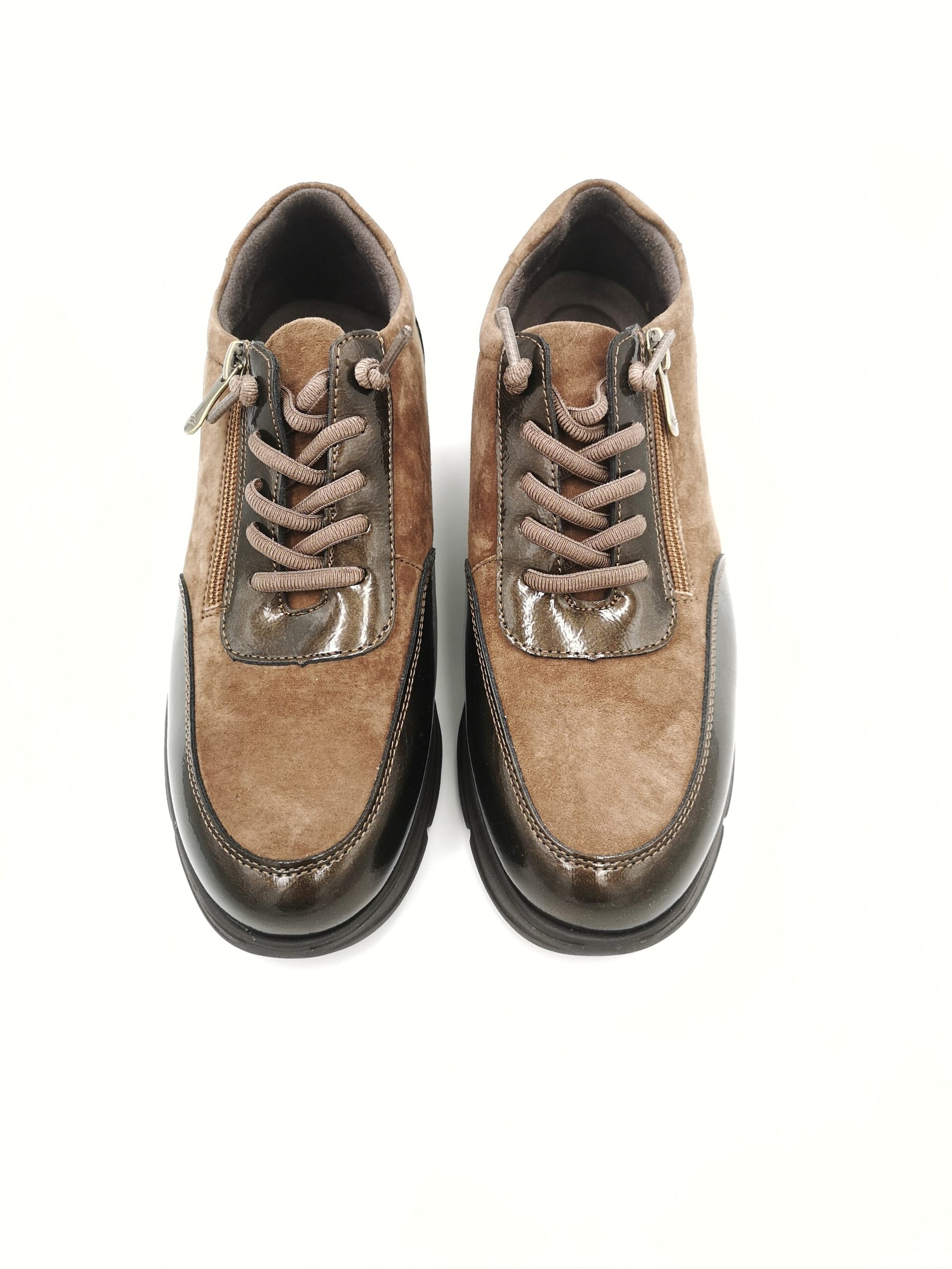 Zapato combinado charol y ante marron cordon elastico y cremallera