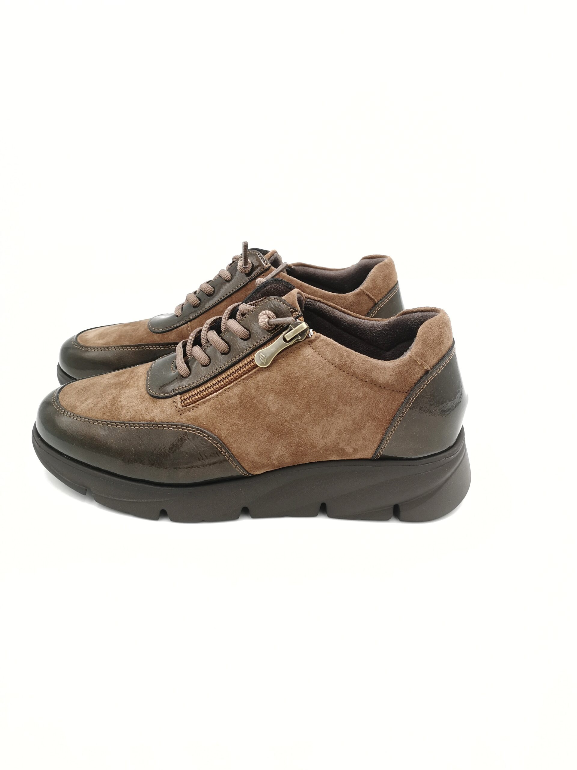 Zapato combinado en charol y ante marron. Ajuste de cordon elastico cremallera lateral. Piso al tono muy ligero.