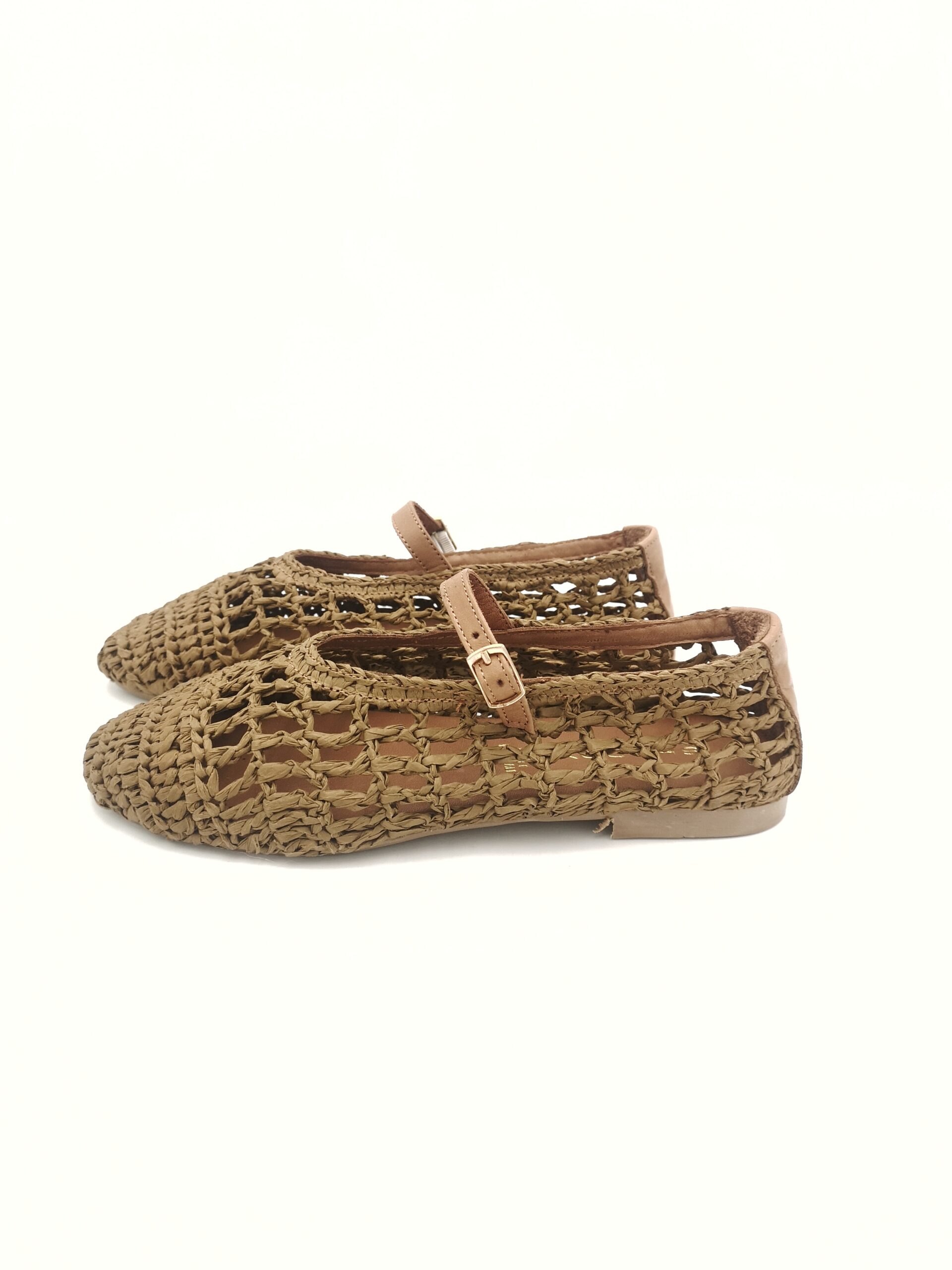 Zapato estilo mercedes combinado crochet con tira de piel y hebilla.