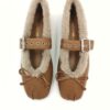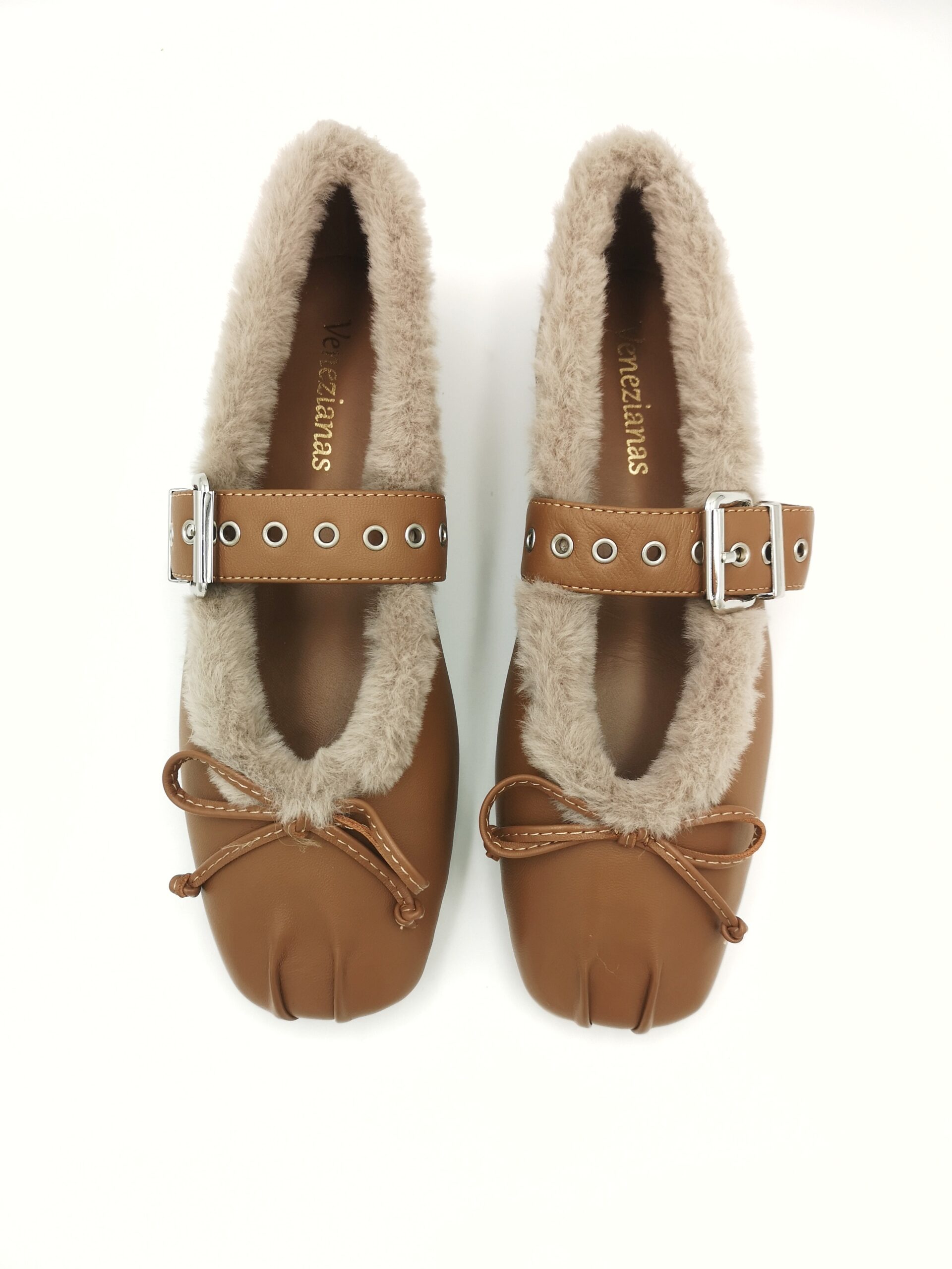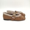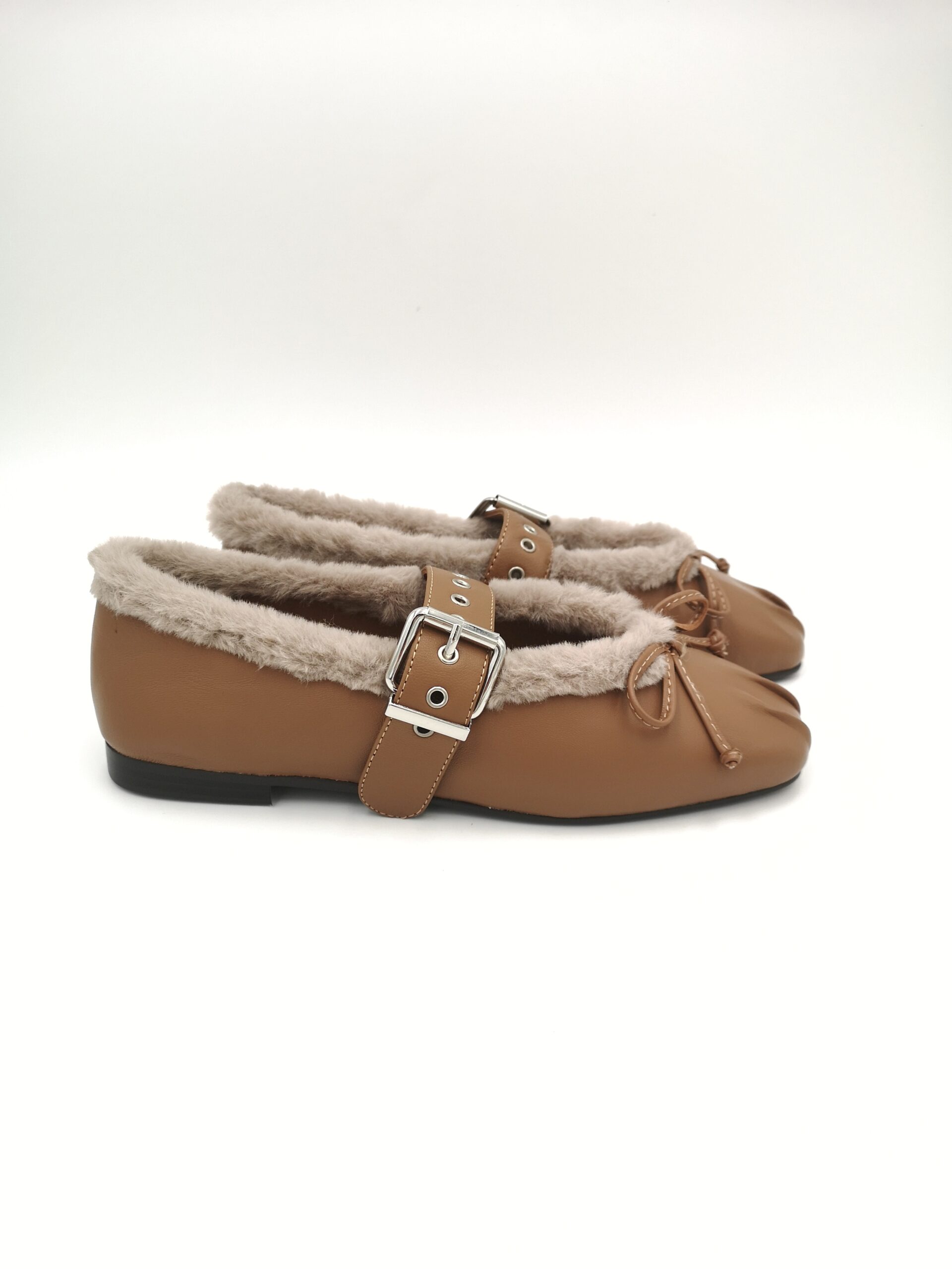 Zapato mercedes de piel color camel con hebilla y cuello de pelito beige. Blandito y fleible.