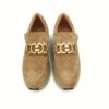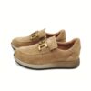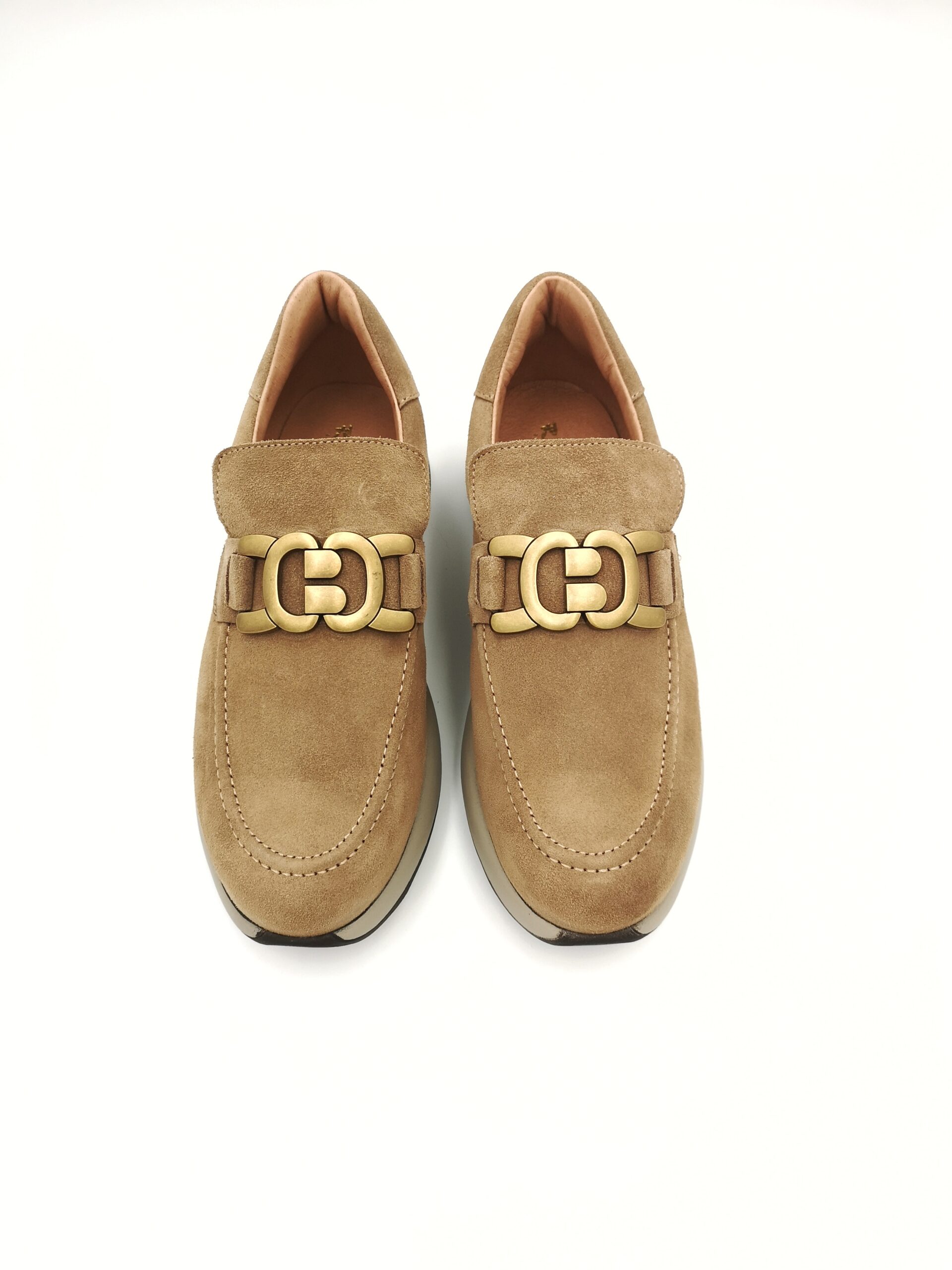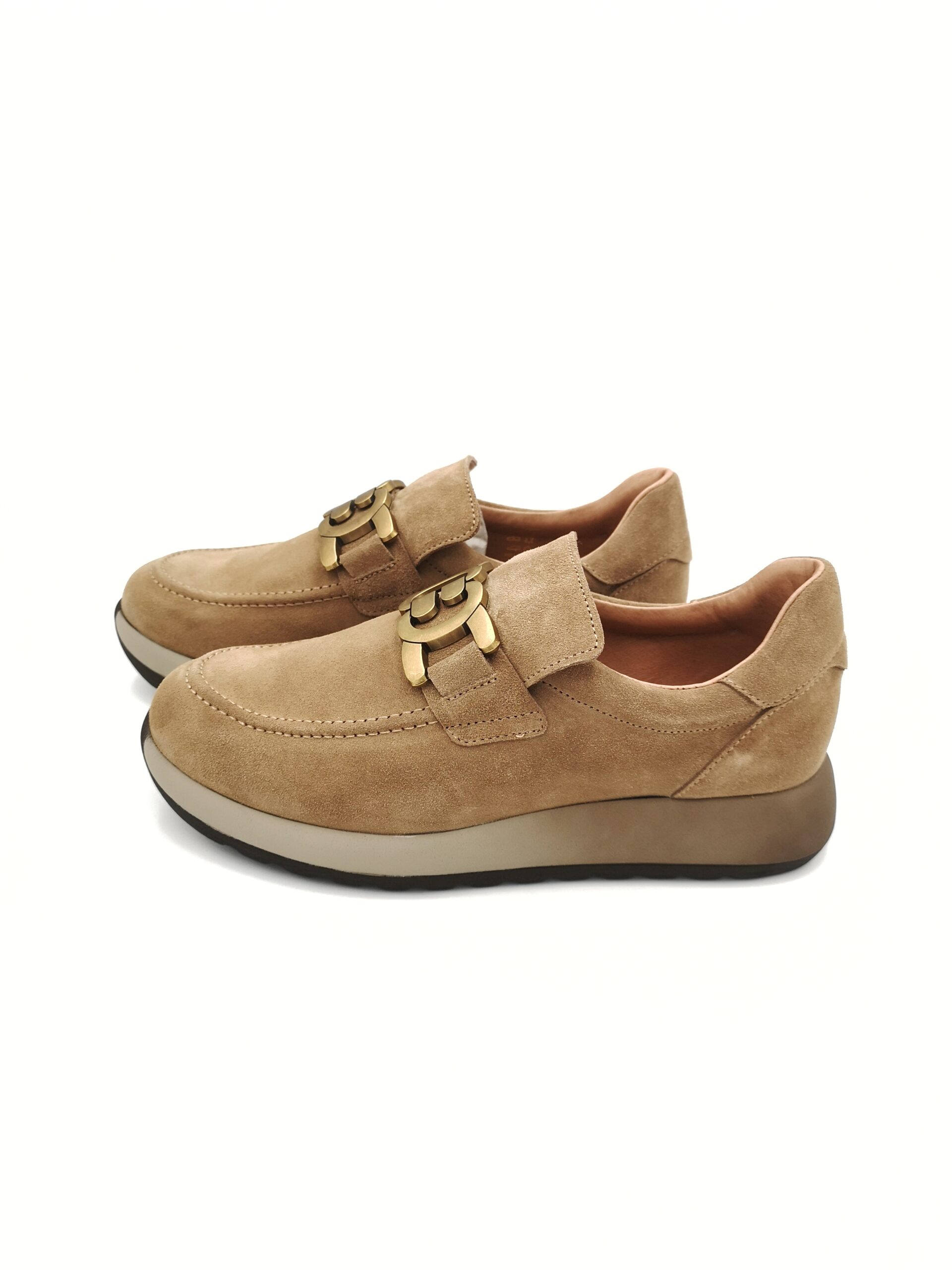 Zapato mocasin en ante beige con adorno en meal. Piso deportivo muy ligero.