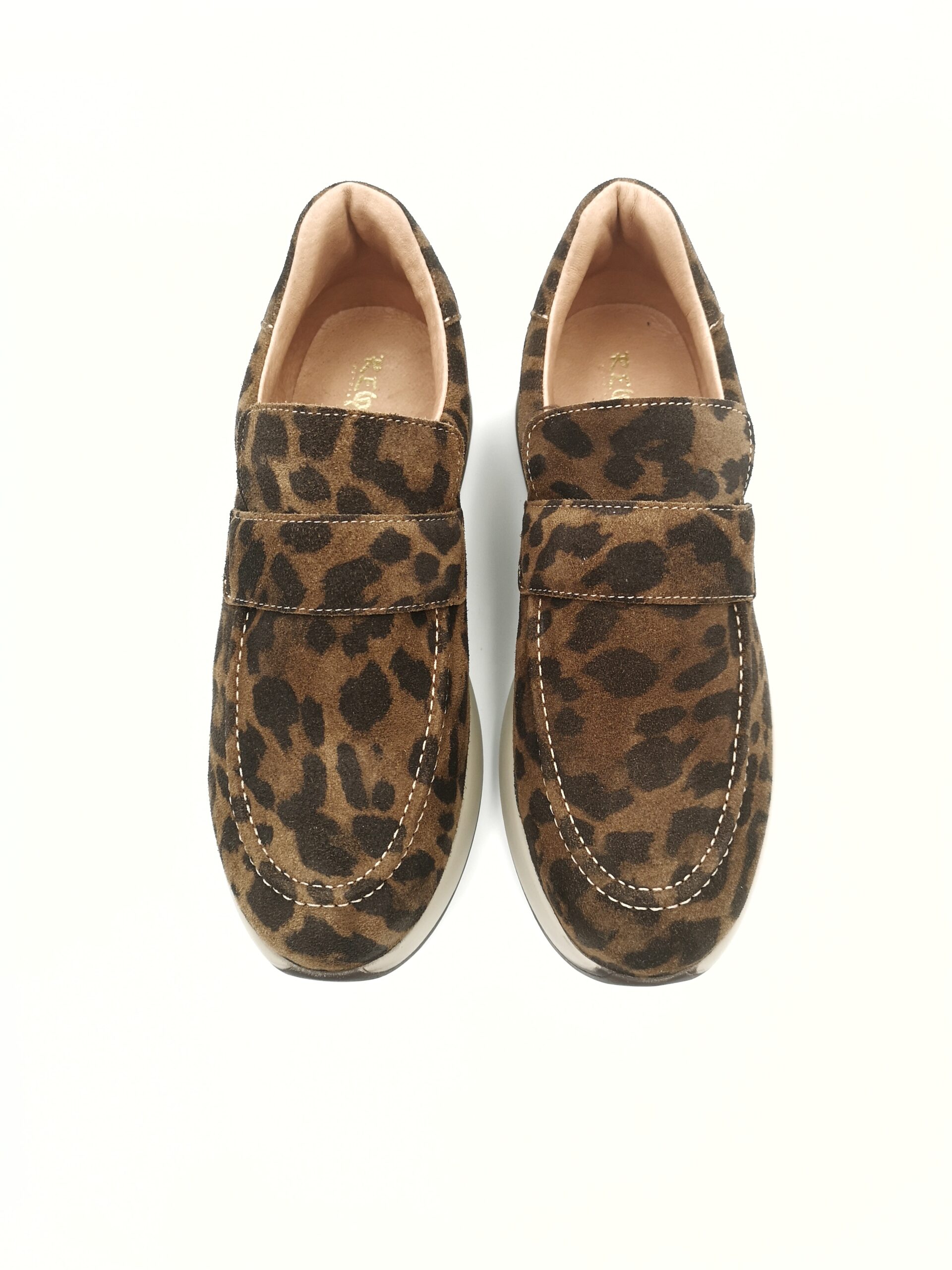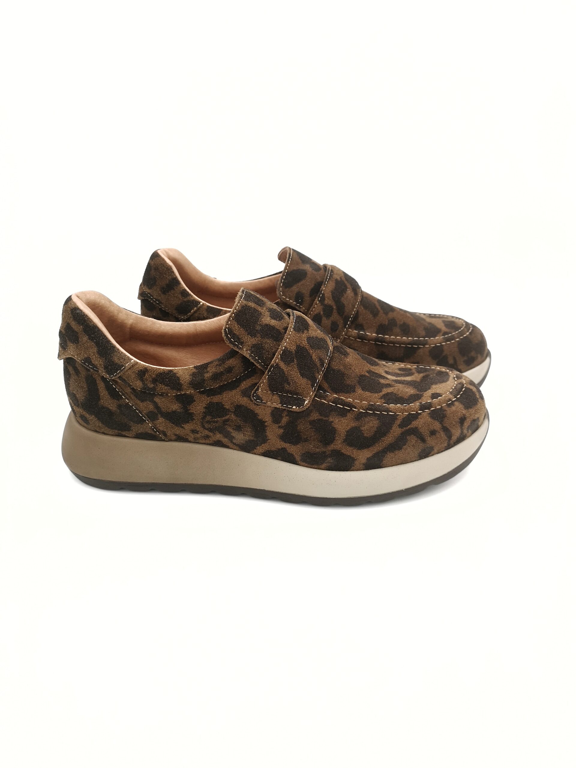 Zapato mocasin de ante prin leopardo. Piso deportivo muy ligero.