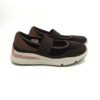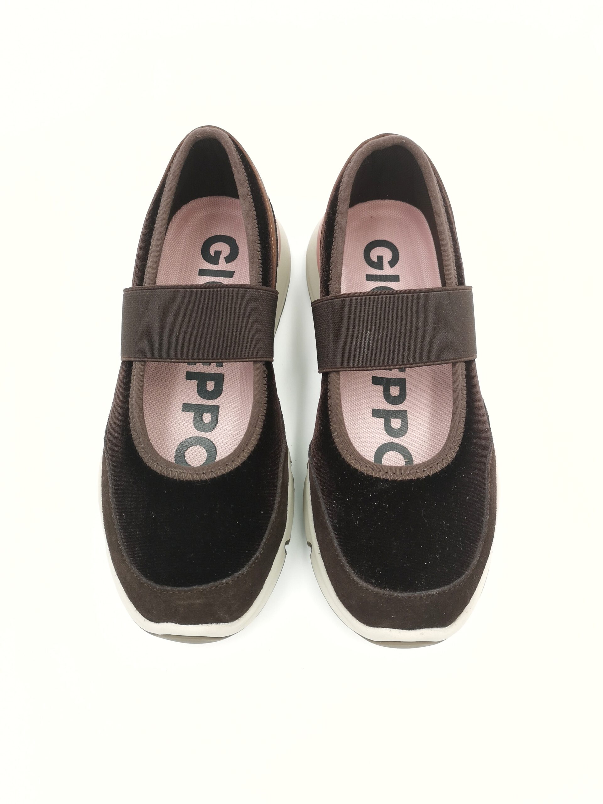 Zapato estilo mercedes con elastico en el empeine. Terciopelo marron combinado con ante al tono. Piso deportivo muy ligero.