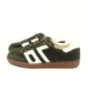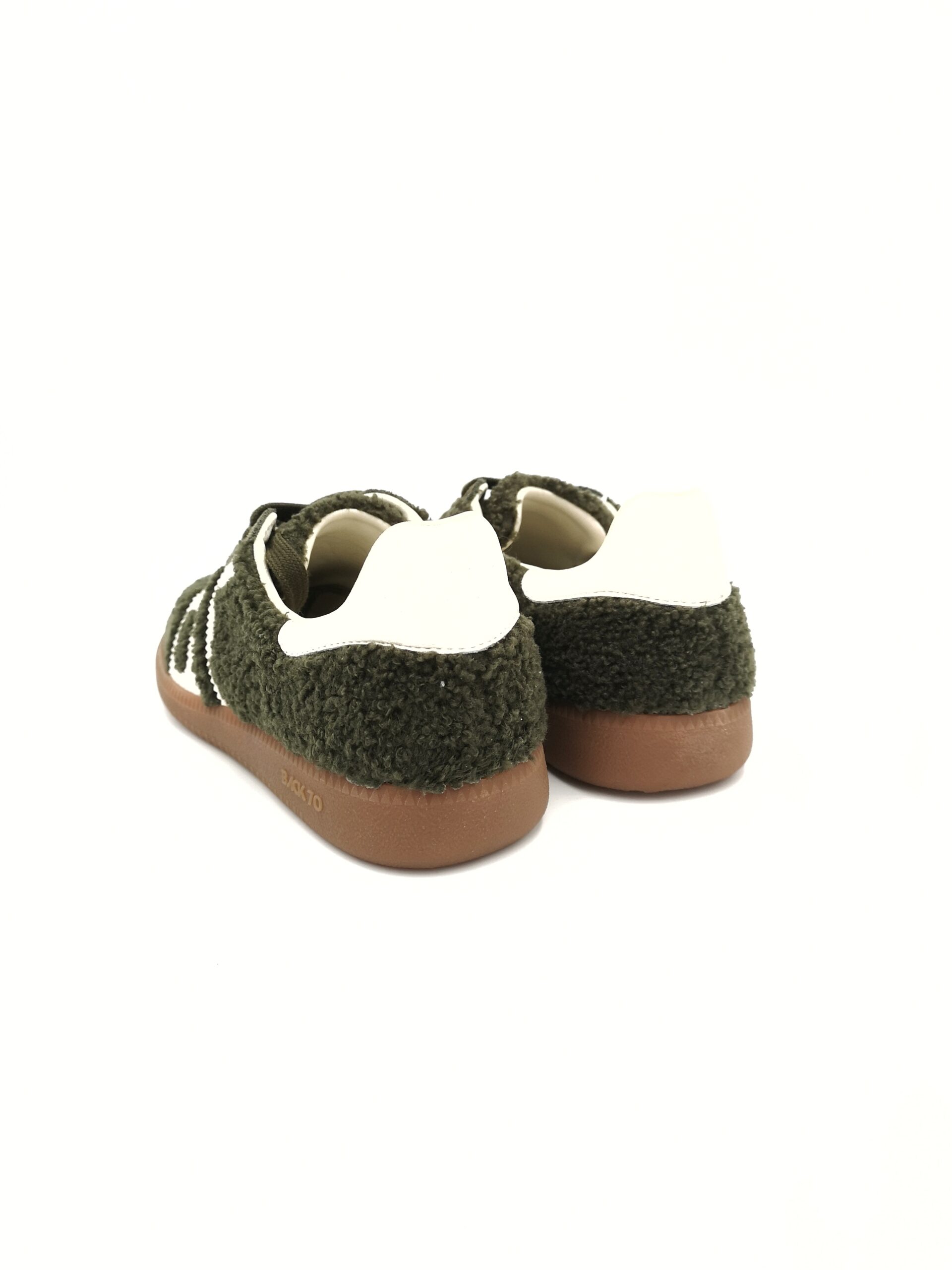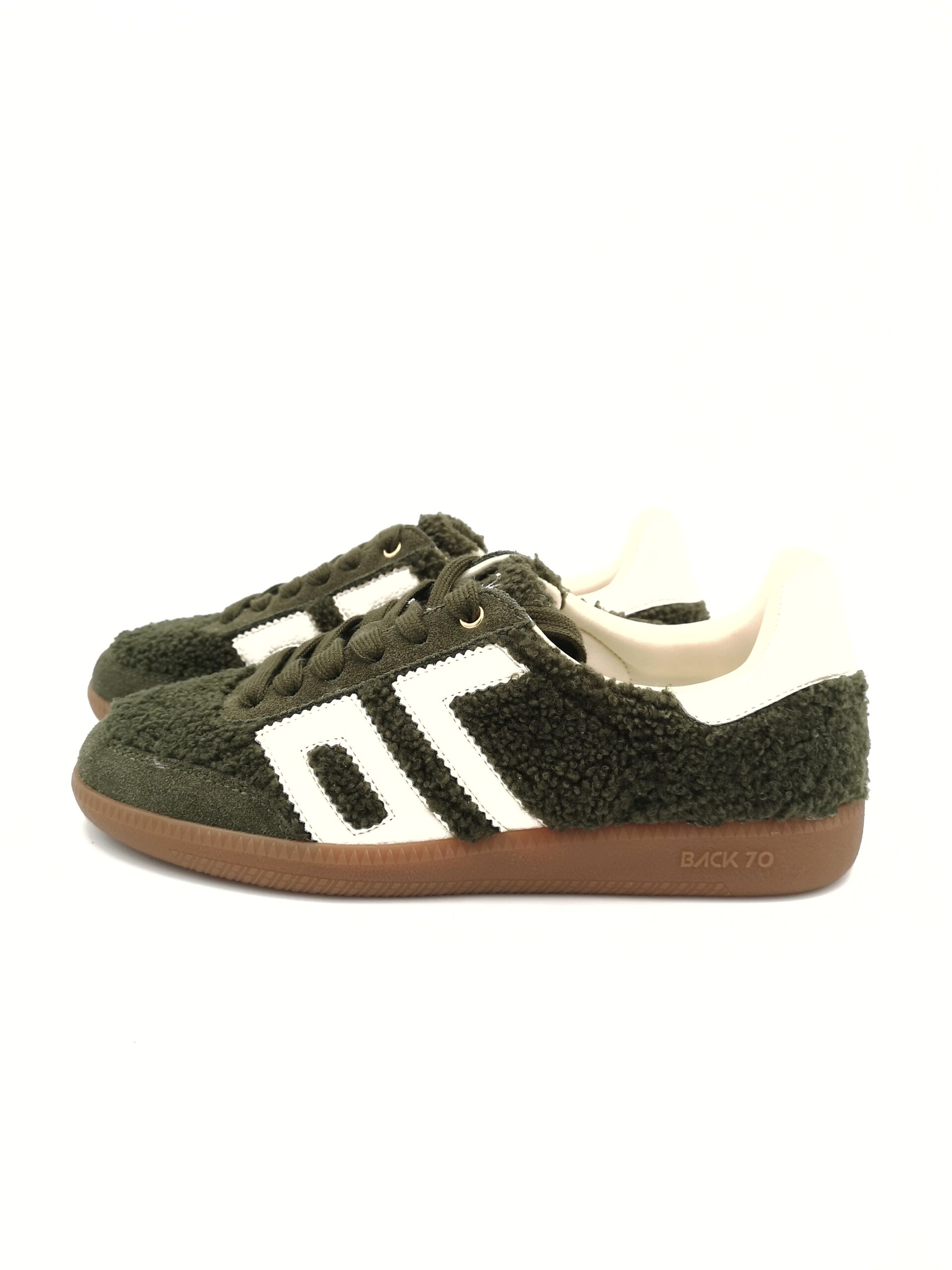 Zapatilla de cordon combinada ante verde con borreguito al tono y detalles en piel blanca. Piso color caramelo blando y muy flexible.